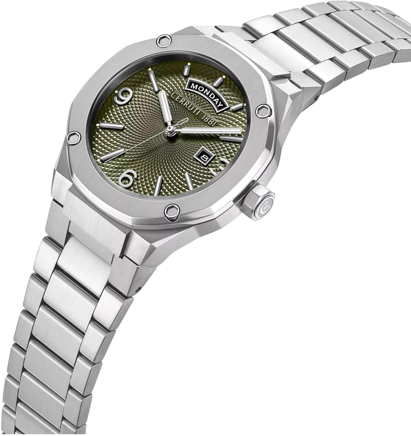 Cerruti 1881 CIWGH0084704 — утончённые мужские часы, в которых классика и современная геометрия нашли безупречный баланс. Стальной корпус с восьмигранным безелемБезельВнешний ободок, закрепляющий стекло. В спортивных часах так называется поворотное кольцо с делениями на циферблате, выполняет роль таймера – замеряет отрезки времени на шкале. Неподвижный безель – элемент декора. Однонаправленно вращающийся безель на дайверских часах позволяет фиксировать моменты погружения и выныривания на поверхность. подчёркивает архитектурную точность форм, а глубокий циферблат с гильошированным узором придаёт модели выразительную глубину. Индикаторы дня недели и даты оформлены в элегантных окнах на «12» и «3 часах», обеспечивая визуальную симметрию и удобство считывания. Прочные стрелки покрыты люминесцентным покрытиемЛюминесцентное покрытиеПозволяет считывать показания времени в темноте. Производители наносят на стрелки, часовые индексы, безель или поверхность циферблата светонакопительный состав, дающий холодное свечение., что гарантирует отличную читаемость даже в темноте. Циферблат защищён надёжным минеральным стекломМинеральное стеклоМинеральное стекло представляет собой искусственно выращенный минерал кварца. Такое стекло отличается особой устойчивостью к повреждениям и царапинам. Уступает по некоторым качествам сапфировому стеклу., устойчивым к царапинам, а стальной браслет фиксируется удобной застёжкой «бабочка»Застёжка "бабочка"Такой вид застёжки дополняется предохранителями, помогающими избежать случайного раскрытия браслета. Обладают изящным исполнением. , обеспечивающей комфорт и безопасность при носке. Строгая форма и продуманные детали делают эту модель идеальным выбором для мужчины, ценящего сдержанную роскошь и точность швейцарского стиля.