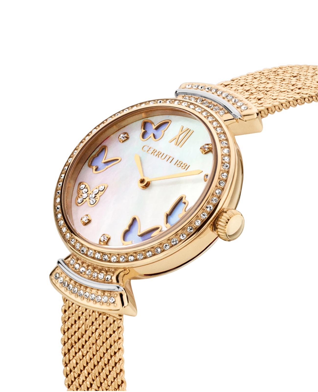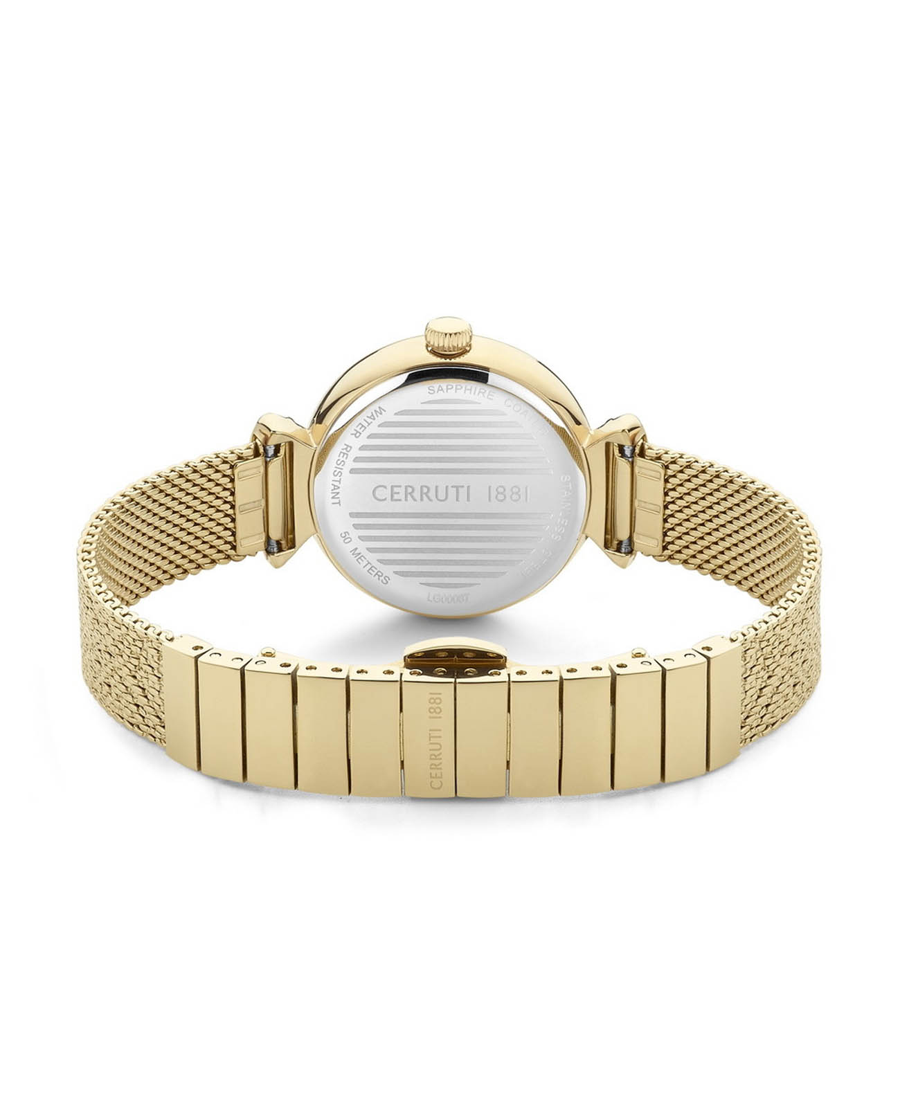 Французские женские часы с кристаллами Cerruti 1881 Cerrisi CIWLG0008702, кварцевый механизм с высокой точностью. Минеральное стеклоМинеральное стеклоМинеральное стекло представляет собой искусственно выращенный минерал кварца. Такое стекло отличается особой устойчивостью к повреждениям и царапинам. Уступает по некоторым качествам сапфировому стеклу. устойчивое к мелким механическим повреждениям. Корпус часов изготовлен из стали с IP-покрытиемIP-покрытиеМетод ионного напыления. Демонстрирует повышенную устойчивость к истиранию, окислению и химическим веществам. Под воздействием высокого давления и температуры около 1500°C молекулы металла надёжно соединяются с частицами корпуса часов.. БезельБезельВнешний ободок, закрепляющий стекло. В спортивных часах так называется поворотное кольцо с делениями на циферблате, выполняет роль таймера – замеряет отрезки времени на шкале. Неподвижный безель – элемент декора. Однонаправленно вращающийся безель на дайверских часах позволяет фиксировать моменты погружения и выныривания на поверхность. украшен кристаллами. Циферблат украшен кристаллами, римские метки. Класс водозащиты: 30 метров, позволит защитить корпус от случайных брызг или капель дождя. Стальной браслет миланского плетения с IP-покрытиемIP-покрытиеМетод ионного напыления. Демонстрирует повышенную устойчивость к истиранию, окислению и химическим веществам. Под воздействием высокого давления и температуры около 1500°C молекулы металла надёжно соединяются с частицами корпуса часов. на застёжке-бабочке с кнопкамиЗастёжка "бабочка"Такой вид застёжки дополняется предохранителями, помогающими избежать случайного раскрытия браслета. Обладают изящным исполнением. .