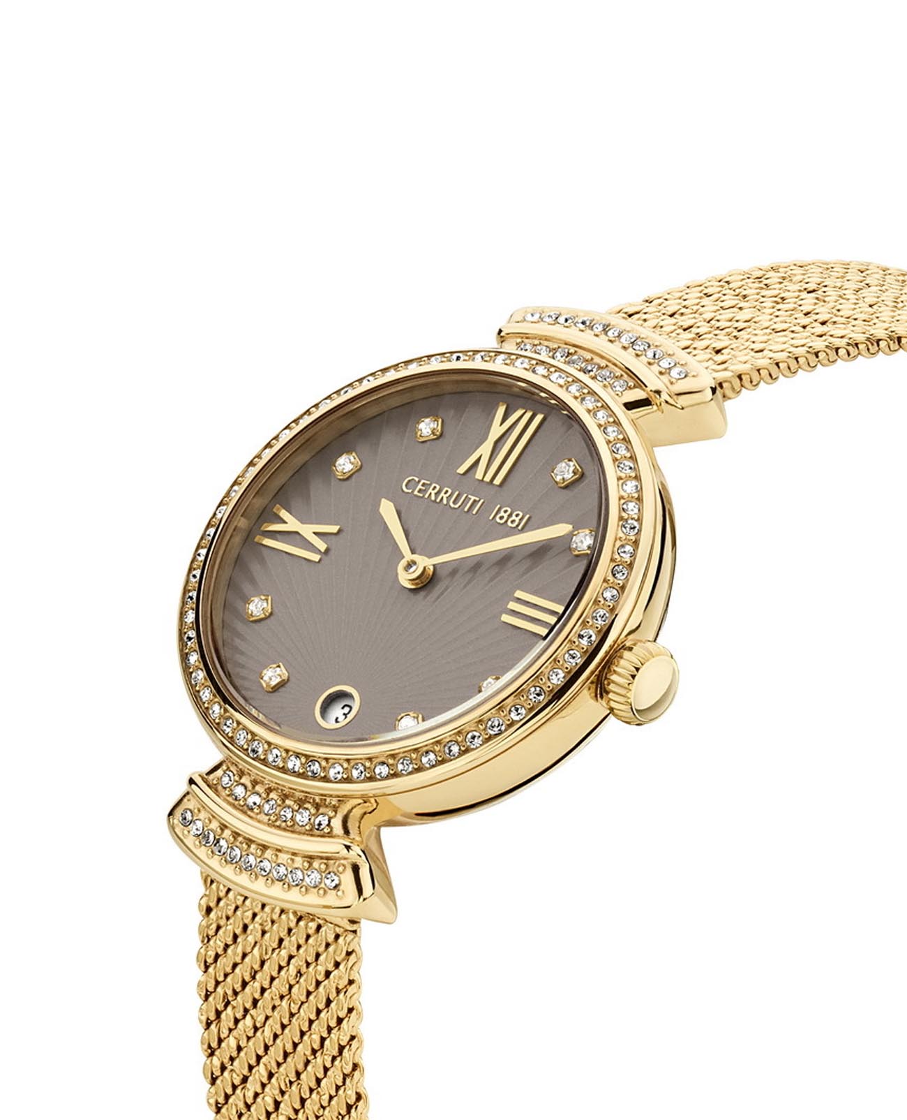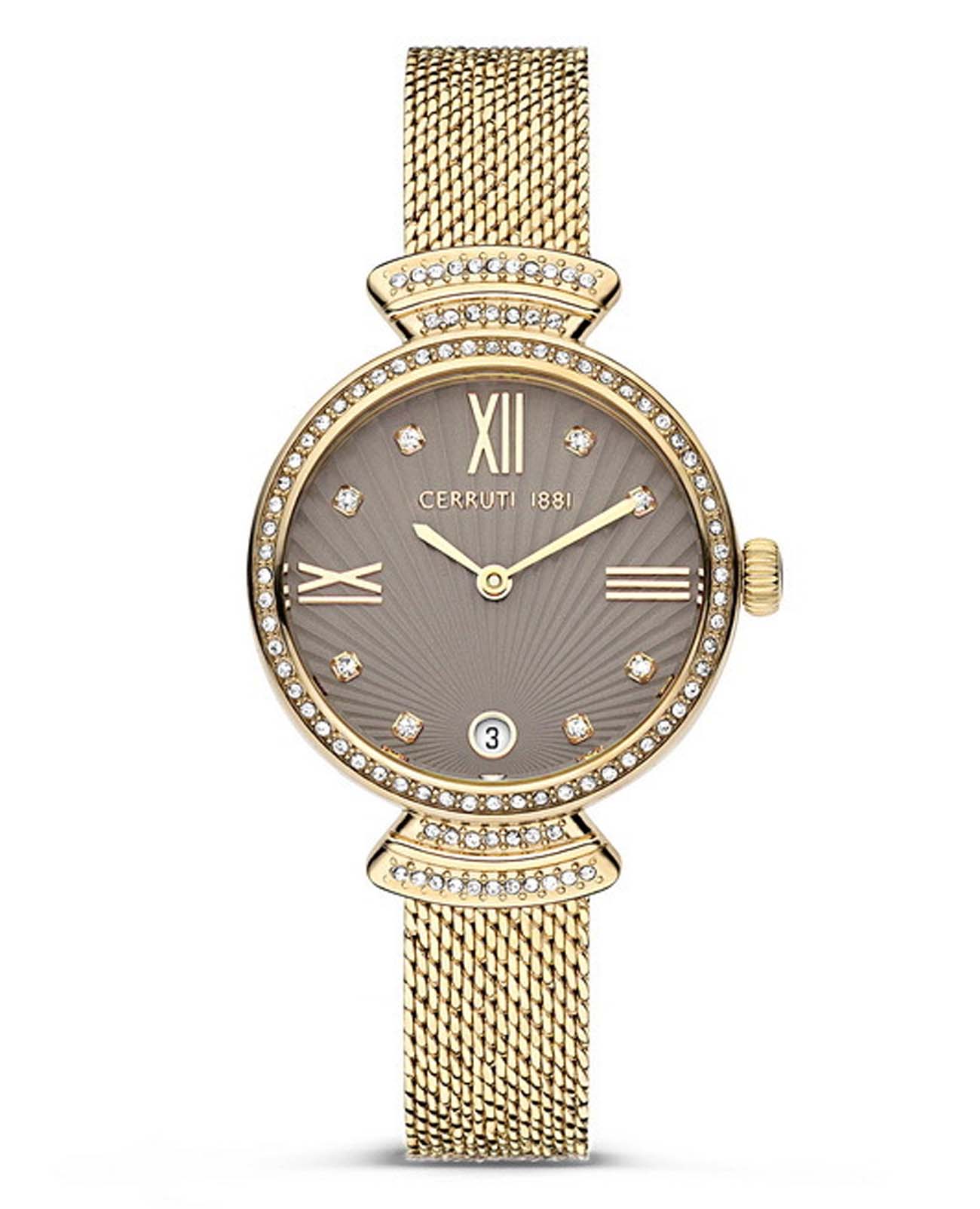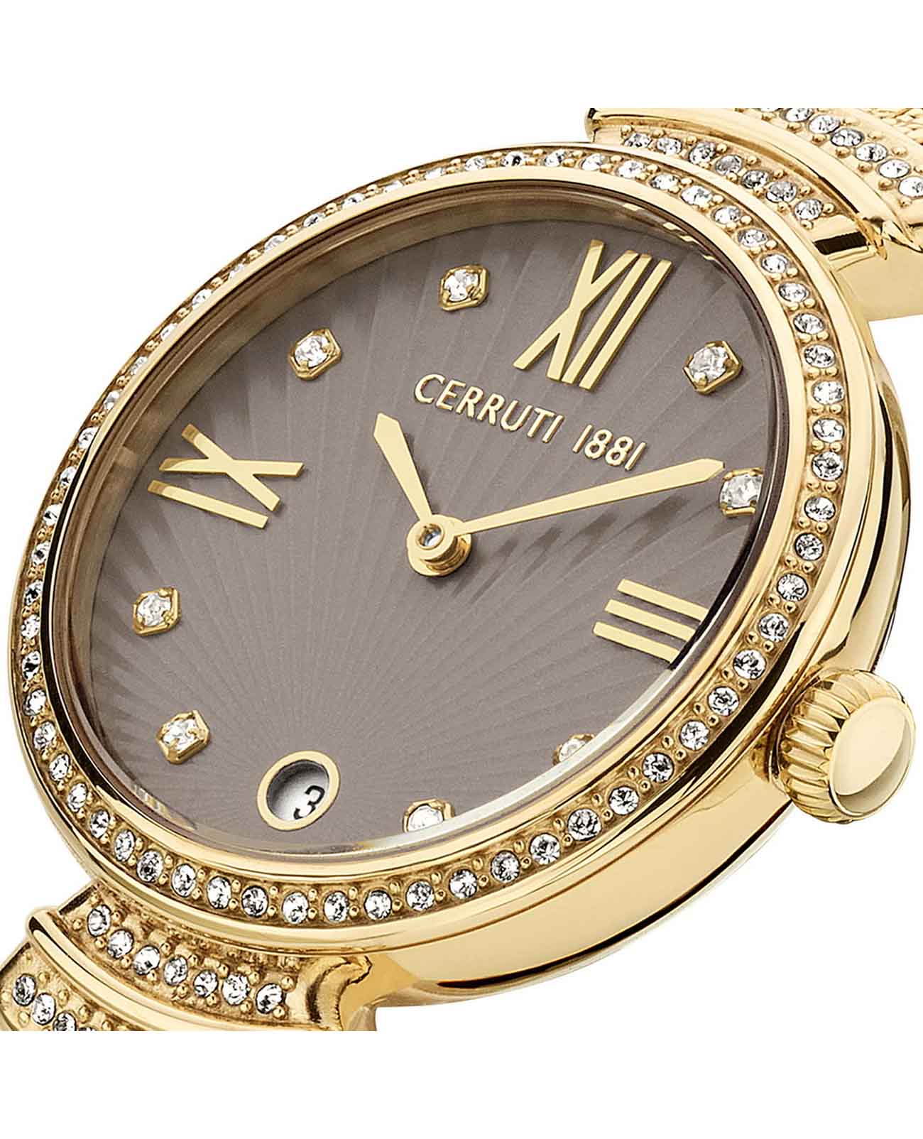 Французские женские часы с кристаллами Cerruti 1881 Cerrisi CIWLH2205503, кварцевый механизм с высокой точностью. Минеральное стеклоМинеральное стеклоМинеральное стекло представляет собой искусственно выращенный минерал кварца. Такое стекло отличается особой устойчивостью к повреждениям и царапинам. Уступает по некоторым качествам сапфировому стеклу. устойчивое к мелким механическим повреждениям. Корпус часов изготовлен из стали с IP-покрытиемIP-покрытиеМетод ионного напыления. Демонстрирует повышенную устойчивость к истиранию, окислению и химическим веществам. Под воздействием высокого давления и температуры около 1500°C молекулы металла надёжно соединяются с частицами корпуса часов.. БезельБезельВнешний ободок, закрепляющий стекло. В спортивных часах так называется поворотное кольцо с делениями на циферблате, выполняет роль таймера – замеряет отрезки времени на шкале. Неподвижный безель – элемент декора. Однонаправленно вращающийся безель на дайверских часах позволяет фиксировать моменты погружения и выныривания на поверхность. украшен кристаллами. Циферблат украшен кристаллами в виде меток. Окошко даты в положении 6 часов. Класс водозащиты: 50 метров, позволит защитить корпус от случайных брызг или капель дождя. Стальной браслет миланского плетения с IP-покрытиемIP-покрытиеМетод ионного напыления. Демонстрирует повышенную устойчивость к истиранию, окислению и химическим веществам. Под воздействием высокого давления и температуры около 1500°C молекулы металла надёжно соединяются с частицами корпуса часов. на застёжке-бабочке с кнопкамиЗастёжка "бабочка"Такой вид застёжки дополняется предохранителями, помогающими избежать случайного раскрытия браслета. Обладают изящным исполнением. .
