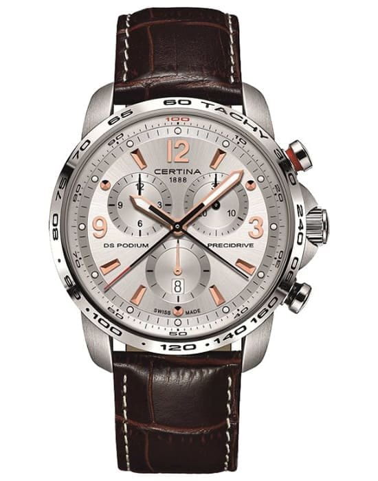 ХронографХронографФункция позволяет измерять отрезки времени с особой точностью: часы, минуты, секунды. Верным признаком хронографа является наличие на циферблате 3 дополнительных окошек-счётчиков. представлен в спортивном стиле. Харизматичная модель представляет собой отличный вариант для повседневного или делового образа, аксессуар поможет придать завершенности. Швейцарский инновационный кварцевый калибр ETA 251.264 Precidrive™Precidrive™Инновационный кварцевый механизм Certina. Часы, оснащённые этим швейцарским калибром, приравниваются к точности к сертифицированным хронометрам, точность хода составляет +/-10 секунд в год.. Антибликовое покрытие сапфирового стекла. Концепция DS ConceptDS ConceptDouble Security Concept, обозначает двойную надёжность и безупречную точность часов Certina. Двойная система защиты подразумевает обеспечение максимальной устойчивости к ударам и высоких показателей водонепроницаемости.. Водонепроницаемость до 20 бар. Ударопрочный корпусУдаропрочный корпусМеханизм заключён в корпус, выполненный из современных материалов, устойчивых к ударам, механическим повреждениям и падению с высоты: инновационный пластик, карбон, нержавеющая сталь, титан. из долговечной стали 316L. Завинчивающаяся задняя крышка. Защищённая заводная головка. Ремешок из натуральной кожи с . Показания времени с точностью до 1/100 секунды, отображение текущего числа, индикатор EOLEOLПредставляет собой систему, уведомляющую владельца часов о необходимости замены элемента питания. За 2 недели до полного разряда батарейки секундная стрелка перестаёт ходить чётко и начинает перепрыгивать на 3-4 деления., шкала тахиметраТахиметрРазмеченная шкала, располагается на ободке или безеле часов. Тахиметр позволяет рассчитать скорость на определённом участке пути, расстояние измеряется в километрах или милях.. Диаметр корпуса: 44 мм.
