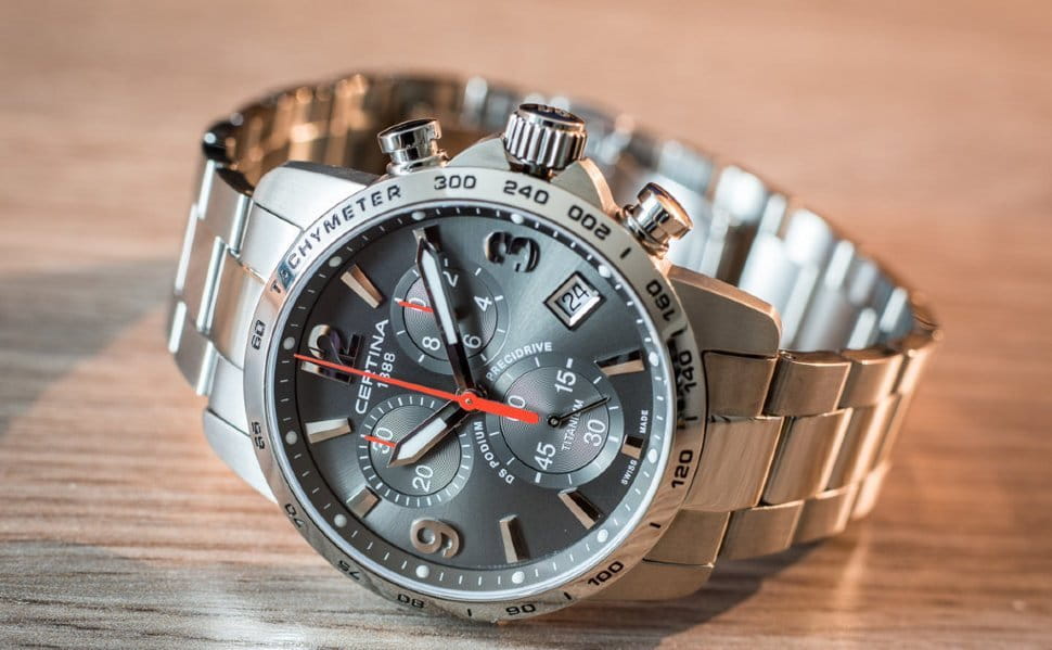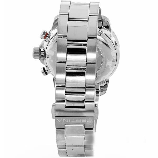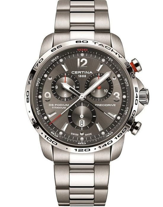 Наручные часы станут превосходным дополнением для образа, такой аксессуар выбирают успешные и уверенные в себе мужчины. Модель в серебристом цвете с красными элементами оформления выполнена из титана. Для материала характерны антикоррозионные свойства, устойчивость к магнитным полям и морской воде. Абсолютная точность хода обеспечивается благодаря швейцарскому кварцевому калибру ETA 251.264 Precidrive™Precidrive™Инновационный кварцевый механизм Certina. Часы, оснащённые этим швейцарским калибром, приравниваются к точности к сертифицированным хронометрам, точность хода составляет +/-10 секунд в год.. Ударопрочность и водонепроницаемость 200 метров - реализация технологии DS ConceptDS ConceptDouble Security Concept, обозначает двойную надёжность и безупречную точность часов Certina. Двойная система защиты подразумевает обеспечение максимальной устойчивости к ударам и высоких показателей водонепроницаемости.. Закручивающиеся заводная головка и задняя крышка. Стекло из сапфира с двухсторонним антибликовым покрытием. БезельБезельВнешний ободок, закрепляющий стекло. В спортивных часах так называется поворотное кольцо с делениями на циферблате, выполняет роль таймера – замеряет отрезки времени на шкале. Неподвижный безель – элемент декора. Однонаправленно вращающийся безель на дайверских часах позволяет фиксировать моменты погружения и выныривания на поверхность. со шкалой тахиметраТахиметрРазмеченная шкала, располагается на ободке или безеле часов. Тахиметр позволяет рассчитать скорость на определённом участке пути, расстояние измеряется в километрах или милях.. Секундомер 1/100 секунды, дата. Индикатор EOLEOLПредставляет собой систему, уведомляющую владельца часов о необходимости замены элемента питания. За 2 недели до полного разряда батарейки секундная стрелка перестаёт ходить чётко и начинает перепрыгивать на 3-4 деления.. Диаметр корпуса: 44 мм.
