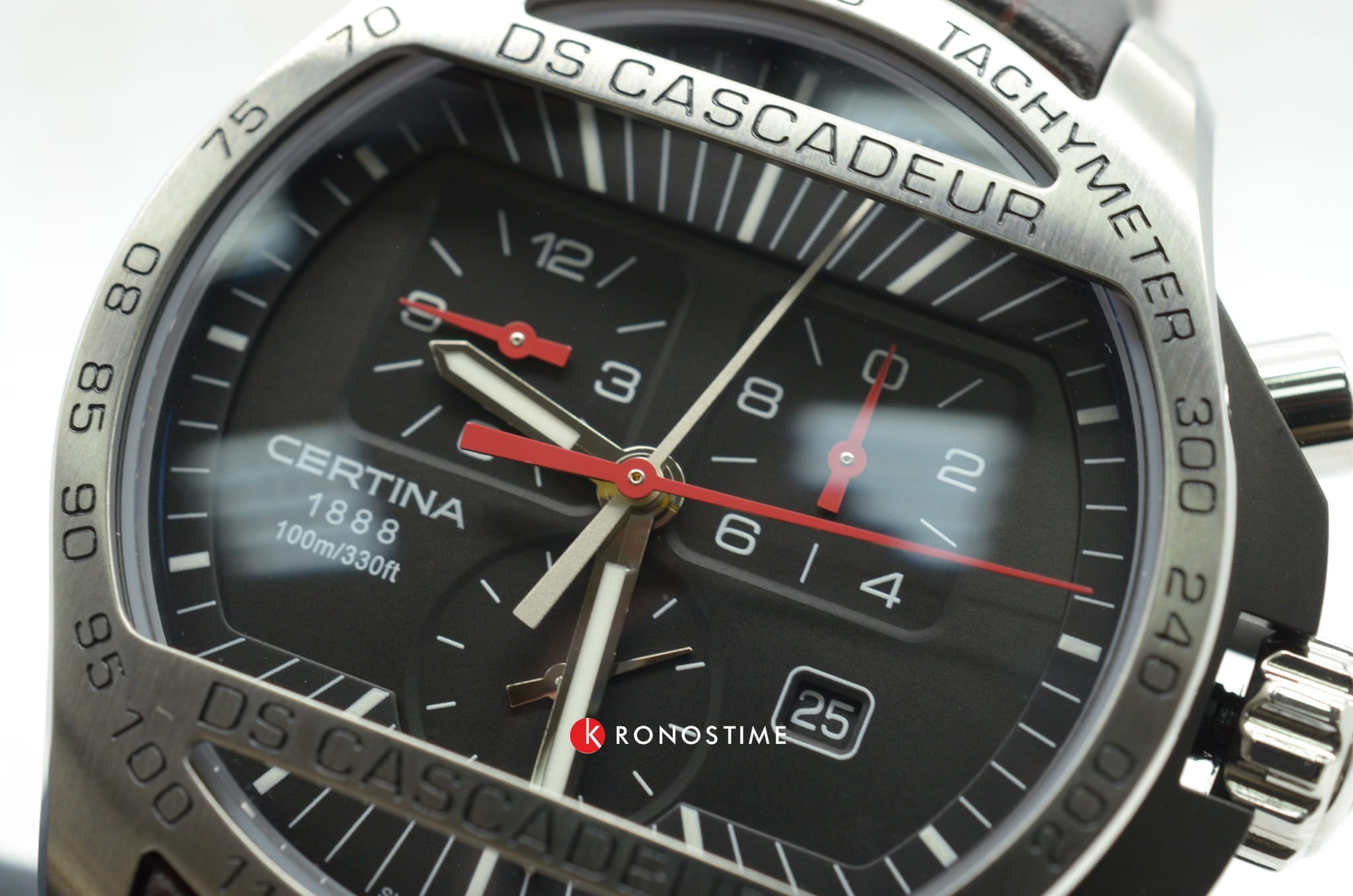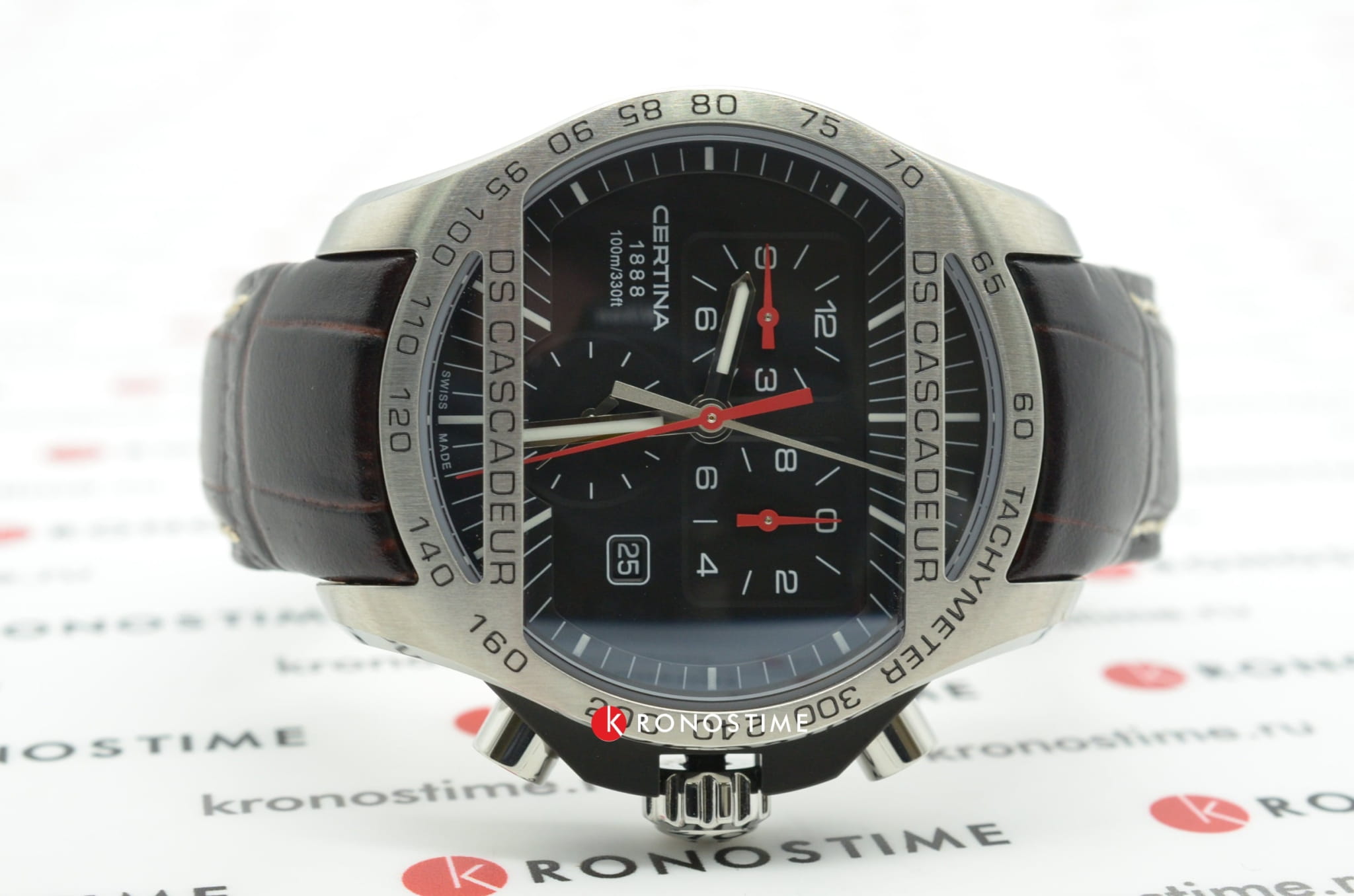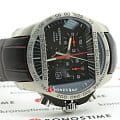 ХронографХронографФункция позволяет измерять отрезки времени с особой точностью: часы, минуты, секунды. Верным признаком хронографа является наличие на циферблате 3 дополнительных окошек-счётчиков. в спортивном стиле имеет циферблат с красными акцентами. Аксессуар оснащён функцией секундомера, тахиметраТахиметрРазмеченная шкала, располагается на ободке или безеле часов. Тахиметр позволяет рассчитать скорость на определённом участке пути, расстояние измеряется в километрах или милях., отображает текущую дату. Швейцарский кварцевый механизм ETA 251.262 отличается высокой точностью хода. Ремешок выполнен из натуральной телячьей кожи.