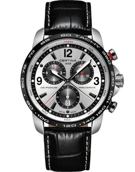 ХронографХронографФункция позволяет измерять отрезки времени с особой точностью: часы, минуты, секунды. Верным признаком хронографа является наличие на циферблате 3 дополнительных окошек-счётчиков. представлен в спортивном стиле. Харизматичная модель представляет собой отличный вариант для повседневного или делового образа, аксессуар поможет придать завершенности. Швейцарский инновационный кварцевый калибр ETA 251.264 Precidrive™Precidrive™Инновационный кварцевый механизм Certina. Часы, оснащённые этим швейцарским калибром, приравниваются к точности к сертифицированным хронометрам, точность хода составляет +/-10 секунд в год.. Антибликовое покрытие сапфирового стекла. Концепция DS ConceptDS ConceptDouble Security Concept, обозначает двойную надёжность и безупречную точность часов Certina. Двойная система защиты подразумевает обеспечение максимальной устойчивости к ударам и высоких показателей водонепроницаемости.. Водонепроницаемость до 20 бар. Ударопрочный корпусУдаропрочный корпусМеханизм заключён в корпус, выполненный из современных материалов, устойчивых к ударам, механическим повреждениям и падению с высоты: инновационный пластик, карбон, нержавеющая сталь, титан. из долговечной стали 316L с чёрным PVD-финишемPVDУльтратонкое покрытие наносится в технике вакуумного напыления, сочетает в себе нитрид титана особой прочности со слоем золота или оксида хрома. Несёт в себе декоративную или защитную функцию.. Завинчивающаяся задняя крышка. Защищённая заводная головка. Ремешок из натуральной кожи с . Показания времени с точностью до 1/100 секунды, отображение текущего числа, индикатор EOLEOLПредставляет собой систему, уведомляющую владельца часов о необходимости замены элемента питания. За 2 недели до полного разряда батарейки секундная стрелка перестаёт ходить чётко и начинает перепрыгивать на 3-4 деления., шкала тахиметраТахиметрРазмеченная шкала, располагается на ободке или безеле часов. Тахиметр позволяет рассчитать скорость на определённом участке пути, расстояние измеряется в километрах или милях.. Диаметр корпуса: 44 мм.