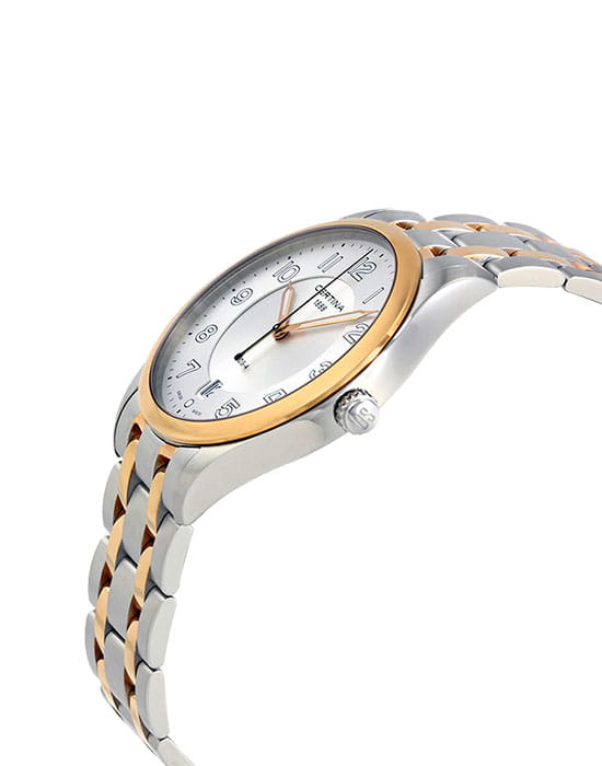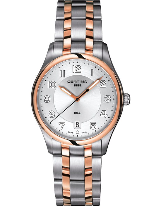 Светлый циферблат с арабскими цифрами отличается строгостью и лаконичностью, браслет из хирургической стали 316L стильно смотрится на запястье. Стрелки с люминесцентным покрытиемЛюминесцентное покрытиеПозволяет считывать показания времени в темноте. Производители наносят на стрелки, часовые индексы, безель или поверхность циферблата светонакопительный состав, дающий холодное свечение. позволяют считывать показания с циферблата в темноте. Высокоточный кварцевый механизм ETA E64.111. Надёжное стекло из сапфира с антибликовым покрытием. PVD-покрытиеPVDУльтратонкое покрытие наносится в технике вакуумного напыления, сочетает в себе нитрид титана особой прочности со слоем золота или оксида хрома. Несёт в себе декоративную или защитную функцию. цвета розового золота. Концепция DS Concept DS ConceptDouble Security Concept, обозначает двойную надёжность и безупречную точность часов Certina. Двойная система защиты подразумевает обеспечение максимальной устойчивости к ударам и высоких показателей водонепроницаемости.. Водостойкость 100 метров. Апертура даты. Диаметр корпуса: 37 мм.