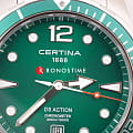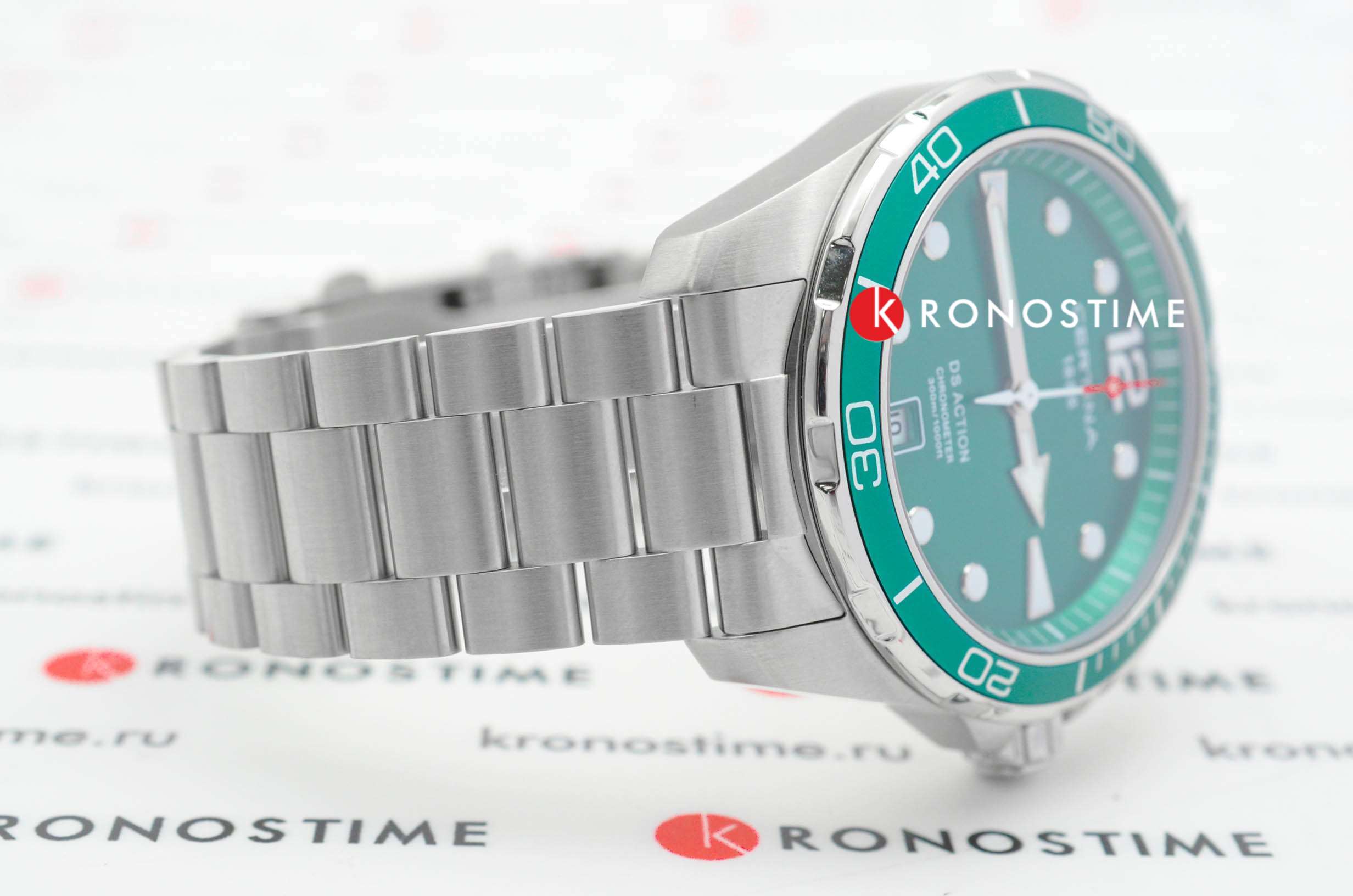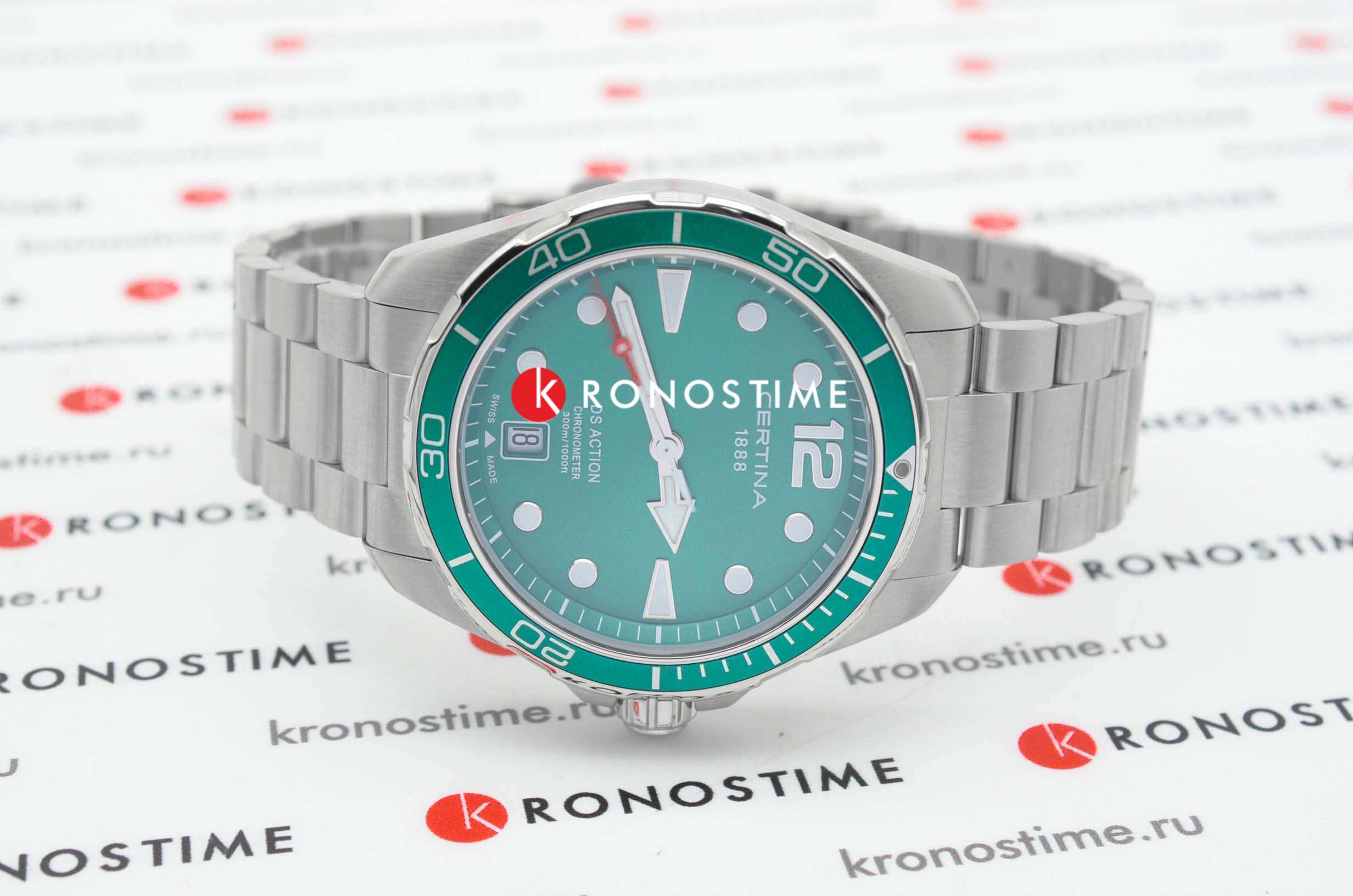 Это превосходная модель в серебристо-зелёной расцветке для тех, кто не готов соглашаться на меньшее. Наручные часы отличаются безупречными характеристиками по всем параметрам: ударопрочный корпусУдаропрочный корпусМеханизм заключён в корпус, выполненный из современных материалов, устойчивых к ударам, механическим повреждениям и падению с высоты: инновационный пластик, карбон, нержавеющая сталь, титан. из хирургической стали 316L, устойчивое к царапинам сапфировое стекло с антибликовой поверхностью, водостойкость до 30 бар, повышенная точность хода кварцевого швейцарского калибра ETA F07.412 Precidrive™Precidrive™Инновационный кварцевый механизм Certina. Часы, оснащённые этим швейцарским калибром, приравниваются к точности к сертифицированным хронометрам, точность хода составляет +/-10 секунд в год., подтверждённая сертификатом COSCСертификат COSCОфициальный сертификат, подтверждающий то, что часы ходят с особо высокой точностью. Для получения документа часы подвергаются тестовым испытаниям, разработанным швейцарским институтом тестирования хронометров COSC. Допустимая норма для механических часов -4/+6 секунд в день, для кварцевых моделей +/- 0,07 секунд в день.. Алюминиевый вращающийся безельБезельВнешний ободок, закрепляющий стекло. В спортивных часах так называется поворотное кольцо с делениями на циферблате, выполняет роль таймера – замеряет отрезки времени на шкале. Неподвижный безель – элемент декора. Однонаправленно вращающийся безель на дайверских часах позволяет фиксировать моменты погружения и выныривания на поверхность.. Закручивающиеся кнопки, заводная головка с системой защиты, задняя крышка. Индикатор EOLEOLПредставляет собой систему, уведомляющую владельца часов о необходимости замены элемента питания. За 2 недели до полного разряда батарейки секундная стрелка перестаёт ходить чётко и начинает перепрыгивать на 3-4 деления.. Апертура даты. Застёжка с фиксатором и удлинением для дайверовУдлинение для дайверовЗастёжка с удлинением для дайверов представляет собой безопасное крепление, которое позволяет надевать часы поверх гидрокостюма. Гибкая застёжка удлиняется на 1-2 миллиметра.. Диаметр корпуса: 43 мм.