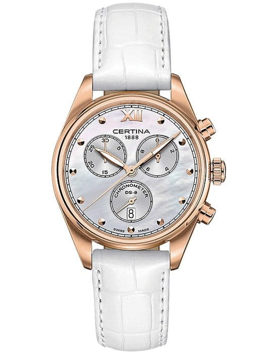 Женские швейцарские часы Certina DS-8 Lady Chronograph C033.234.36.118.00 из коллекции DS-8 – идеальное дополнение образа. Высокая точность хода швейцарского кварцевого калибра ETA G15.212 AA Precidrive™Precidrive™Инновационный кварцевый механизм Certina. Часы, оснащённые этим швейцарским калибром, приравниваются к точности к сертифицированным хронометрам, точность хода составляет +/-10 секунд в год. отмечена сертификатом COSCСертификат COSCОфициальный сертификат, подтверждающий то, что часы ходят с особо высокой точностью. Для получения документа часы подвергаются тестовым испытаниям, разработанным швейцарским институтом тестирования хронометров COSC. Допустимая норма для механических часов -4/+6 секунд в день, для кварцевых моделей +/- 0,07 секунд в день.. Стекло из сапфира с покрытием «антиблик». ХронографХронографФункция позволяет измерять отрезки времени с особой точностью: часы, минуты, секунды. Верным признаком хронографа является наличие на циферблате 3 дополнительных окошек-счётчиков., секундомер, дата, EOLEOLПредставляет собой систему, уведомляющую владельца часов о необходимости замены элемента питания. За 2 недели до полного разряда батарейки секундная стрелка перестаёт ходить чётко и начинает перепрыгивать на 3-4 деления.. Концепция Двойной Надёжности DSDS ConceptDouble Security Concept, обозначает двойную надёжность и безупречную точность часов Certina. Двойная система защиты подразумевает обеспечение максимальной устойчивости к ударам и высоких показателей водонепроницаемости.. Ремешок из натуральной кожи. PVD-покрытиеPVDУльтратонкое покрытие наносится в технике вакуумного напыления, сочетает в себе нитрид титана особой прочности со слоем золота или оксида хрома. Несёт в себе декоративную или защитную функцию. корпуса. Производство и сборка: Швейцария.