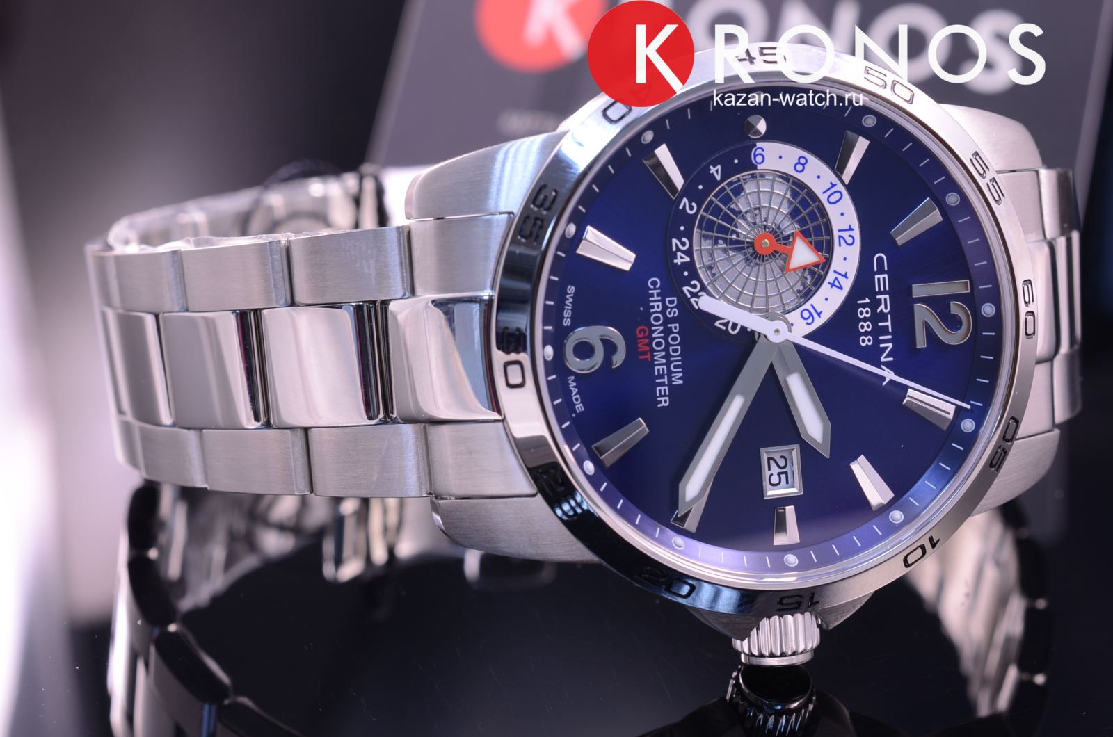 Аксессуар имеет ярко-синий циферблат, дополненный крупной индикацией времени. Оригинально смотрится функциональный счётчик, обеспечивающий индикацию часовых поясов. Корпус и браслет изготовлены из нержавеющей стали 316L, материал высоко ценится за долговечность и устойчивость к царапинам. Швейцарский кварцевый механизм ETA Precidrive™Precidrive™Инновационный кварцевый механизм Certina. Часы, оснащённые этим швейцарским калибром, приравниваются к точности к сертифицированным хронометрам, точность хода составляет +/-10 секунд в год., в 8-10 раз более точен, чем обычные кварцевые часы, это официально подтверждено сертификатом хронометра COSCСертификат COSCОфициальный сертификат, подтверждающий то, что часы ходят с особо высокой точностью. Для получения документа часы подвергаются тестовым испытаниям, разработанным швейцарским институтом тестирования хронометров COSC. Допустимая норма для механических часов -4/+6 секунд в день, для кварцевых моделей +/- 0,07 секунд в день.. Одностороннее антибликовое покрытие сапфирового стекла. Заводная головка с защитой. Люминесцентная подсветкаЛюминесцентное покрытиеПозволяет считывать показания времени в темноте. Производители наносят на стрелки, часовые индексы, безель или поверхность циферблата светонакопительный состав, дающий холодное свечение.. Водонепроницаемость 100 метров. . Календарь, функция GMTGMTОтображение времени второго часового пояса.Такая функция особенно актуальна для путешественников и бизнесменов,которые общаются с людьми из разных стран,теперь вы всегда будете знать,какой час у вашего партнёра или близкого человека., индикатор EOLEOLПредставляет собой систему, уведомляющую владельца часов о необходимости замены элемента питания. За 2 недели до полного разряда батарейки секундная стрелка перестаёт ходить чётко и начинает перепрыгивать на 3-4 деления.. Диаметр корпуса: 43 мм.