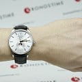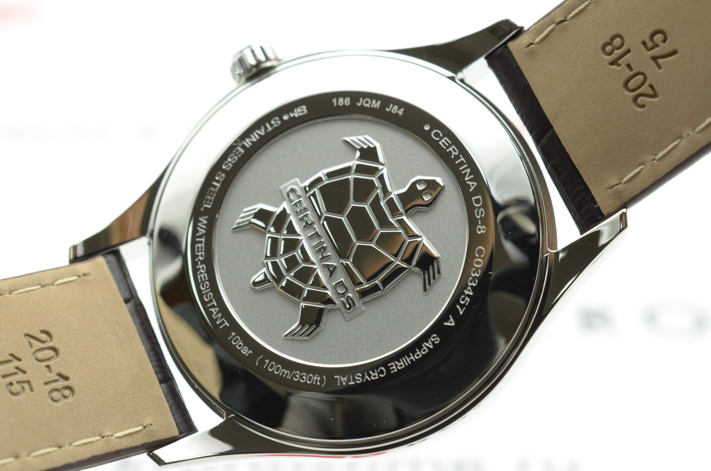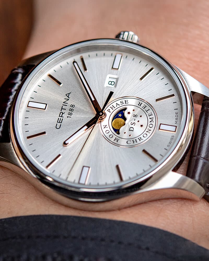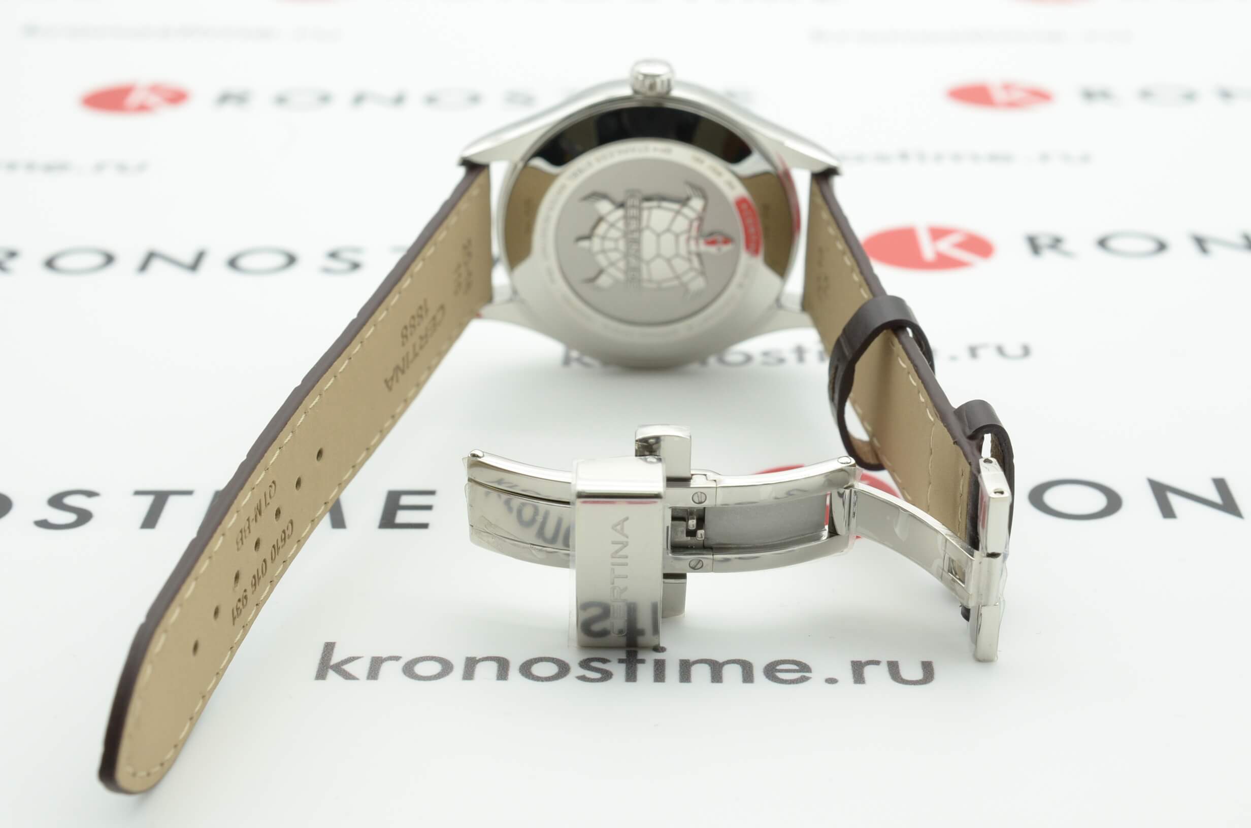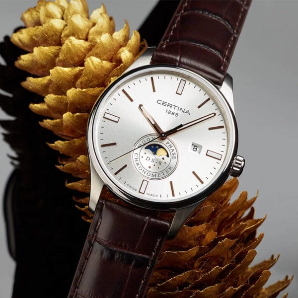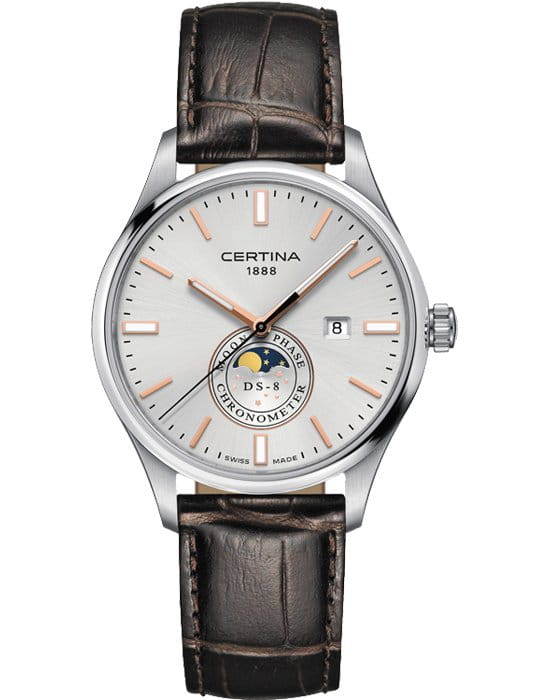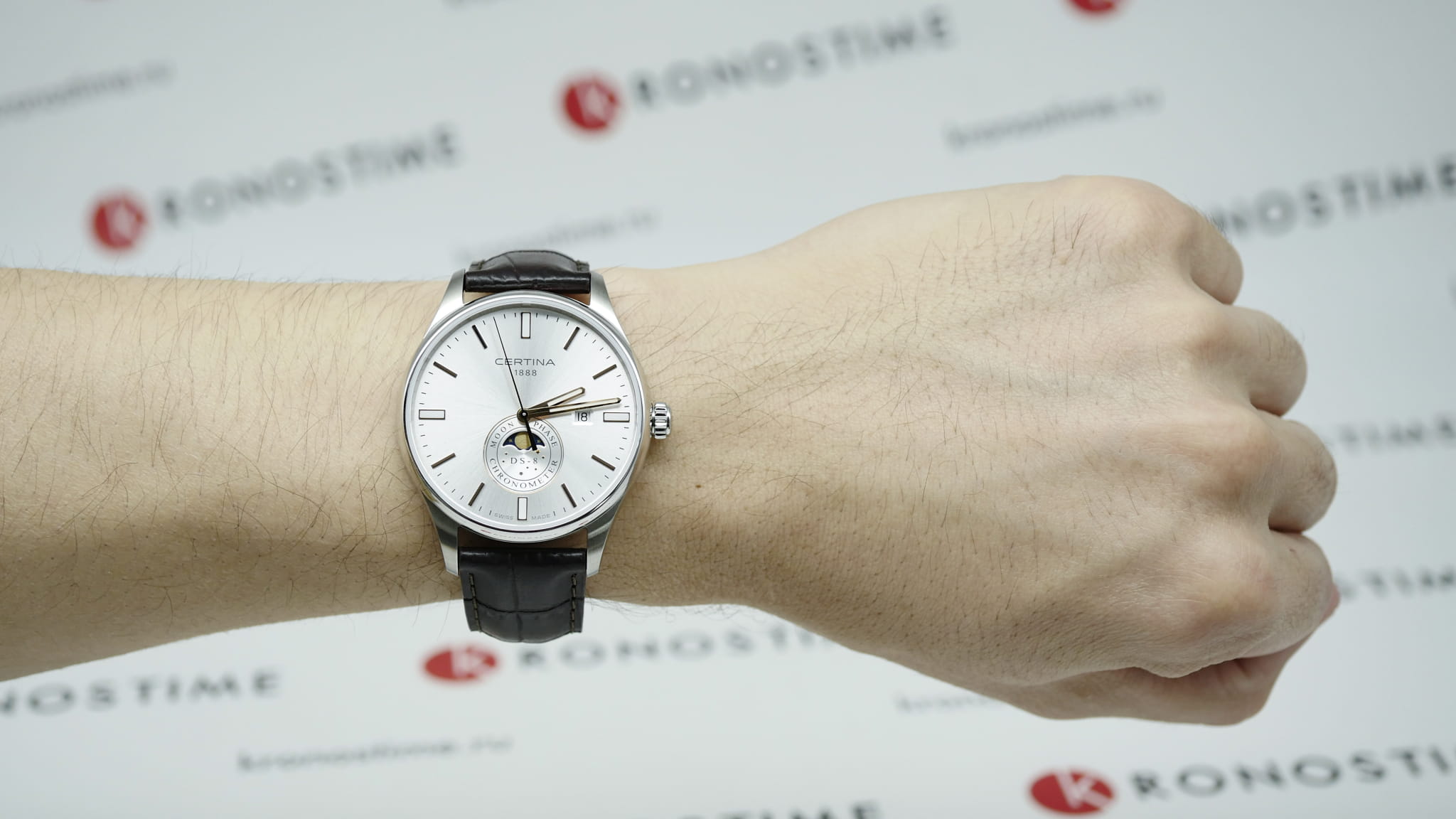Стильная модель в классическом исполнении оснащена необычным часовым усложнением, окошко в нижней части серебристого циферблата отображает лунные фазы. Аксессуар безупречен не только с точки зрения дизайна, он демонстрирует выдающуюся точность хода швейцарского кварцевого механизма ETA F05.841. Такая особенность отмечена официальным сертификатом хронометра COSCСертификат COSCОфициальный сертификат, подтверждающий то, что часы ходят с особо высокой точностью. Для получения документа часы подвергаются тестовым испытаниям, разработанным швейцарским институтом тестирования хронометров COSC. Допустимая норма для механических часов -4/+6 секунд в день, для кварцевых моделей +/- 0,07 секунд в день.. Сапфировое стекло с односторонним антибликовым покрытием. Соблюдение концепции DS ConceptDS ConceptDouble Security Concept, обозначает двойную надёжность и безупречную точность часов Certina. Двойная система защиты подразумевает обеспечение максимальной устойчивости к ударам и высоких показателей водонепроницаемости.. Водостойкость 100 метров. Люминесцентная подсветкаЛюминесцентное покрытиеПозволяет считывать показания времени в темноте. Производители наносят на стрелки, часовые индексы, безель или поверхность циферблата светонакопительный состав, дающий холодное свечение.. Корпус из стали 316L с противокоррозионными свойствами. Ремешок из натуральной кожи. . Функция EOLEOLПредставляет собой систему, уведомляющую владельца часов о необходимости замены элемента питания. За 2 недели до полного разряда батарейки секундная стрелка перестаёт ходить чётко и начинает перепрыгивать на 3-4 деления., отображение текущего числа. Диаметр корпуса: 41 мм.