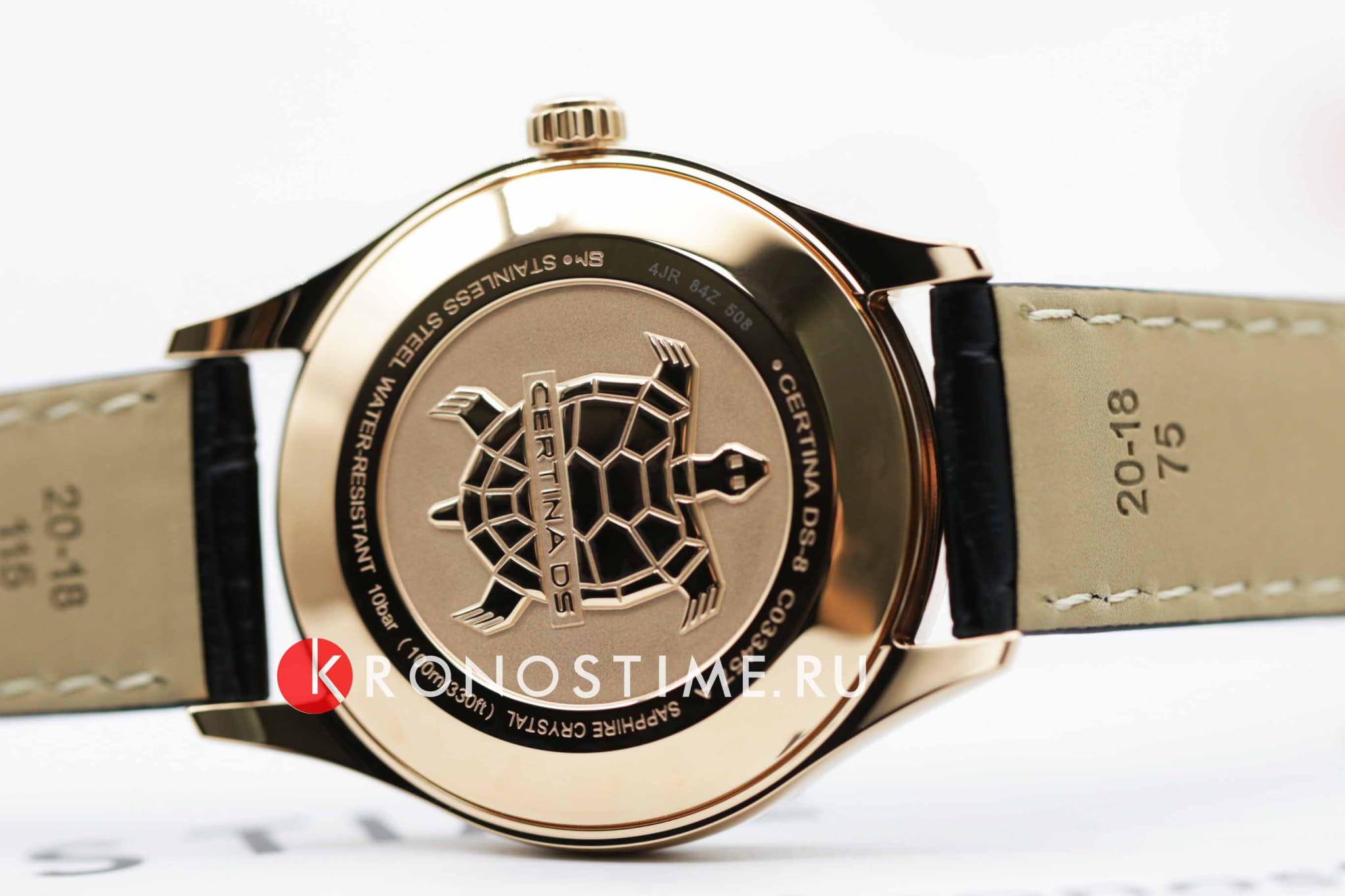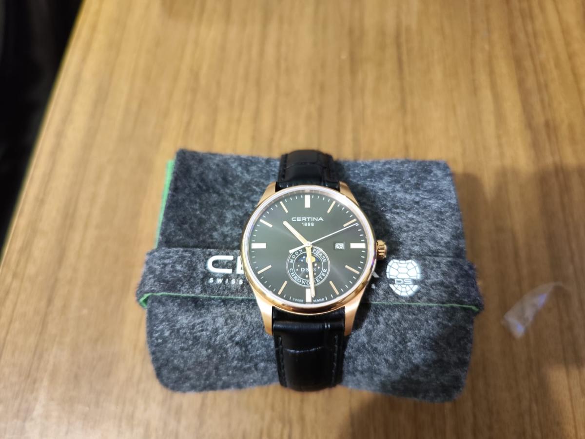 Стильная модель в классическом исполнении оснащена необычным часовым усложнением, окошко в нижней части циферблата отображает лунные фазы. Аксессуар безупречен не только с точки зрения дизайна, он демонстрирует выдающуюся точность хода швейцарского кварцевого механизма ETA F05.841. Такая особенность отмечена официальным сертификатом хронометра COSCСертификат COSCОфициальный сертификат, подтверждающий то, что часы ходят с особо высокой точностью. Для получения документа часы подвергаются тестовым испытаниям, разработанным швейцарским институтом тестирования хронометров COSC. Допустимая норма для механических часов -4/+6 секунд в день, для кварцевых моделей +/- 0,07 секунд в день.. Сапфировое стекло с односторонним антибликовым покрытием. Соблюдение концепции DS ConceptDS ConceptDouble Security Concept, обозначает двойную надёжность и безупречную точность часов Certina. Двойная система защиты подразумевает обеспечение максимальной устойчивости к ударам и высоких показателей водонепроницаемости.. Водостойкость 100 метров. Люминесцентная подсветкаЛюминесцентное покрытиеПозволяет считывать показания времени в темноте. Производители наносят на стрелки, часовые индексы, безель или поверхность циферблата светонакопительный состав, дающий холодное свечение.. Корпус из стали 316L с противокоррозионными свойствами. PVD-покрытиеPVDУльтратонкое покрытие наносится в технике вакуумного напыления, сочетает в себе нитрид титана особой прочности со слоем золота или оксида хрома. Несёт в себе декоративную или защитную функцию.. Ремешок из натуральной кожи. . Функция EOLEOLПредставляет собой систему, уведомляющую владельца часов о необходимости замены элемента питания. За 2 недели до полного разряда батарейки секундная стрелка перестаёт ходить чётко и начинает перепрыгивать на 3-4 деления., отображение текущего числа. Диаметр корпуса: 41 мм.