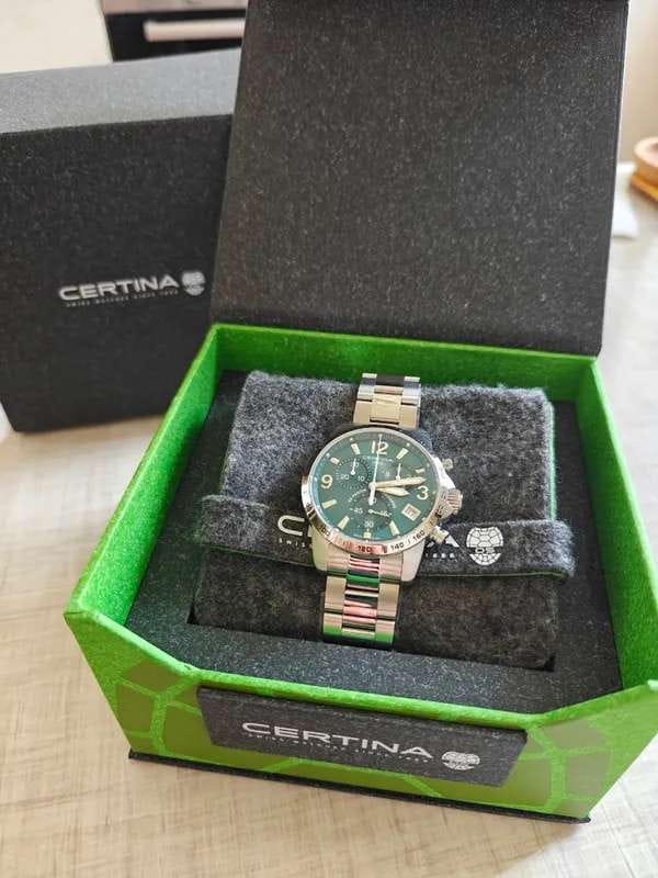 Certina DS не мои первые часы, но, безусловно, самые универсальные. Это идеальный вариант «одни на все случаи жизни»: они одинаково хорошо сочетаются и со светлой, и с темной одеждой, подходят как для шорт с майкой, так и для джинсов с рубашкой. Цвет циферблата отдельный восторг, модель очень стильная и привлекает комплименты. Единственный нюанс: секундная стрелка хронографа стоит с небольшим отклонением от метки «12», что, впрочем, типично для бюджетного швейцарского сегмента.