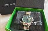 Модель гармонично соединяет в себе лаконичную элегантность и спортивную составляющую. Зелёный циферблат имеет крупные элементы, обеспечивающими оптимальную читаемость показаний времени. Часы устойчивы к высоким нагрузкам благодаря концепции DS ConceptDS ConceptDouble Security Concept, обозначает двойную надёжность и безупречную точность часов Certina. Двойная система защиты подразумевает обеспечение максимальной устойчивости к ударам и высоких показателей водонепроницаемости., дополнительной неуязвимости способствуют сапфировое стекло, заводная головка с защитным уплотнением и нержавеющая сталь в качестве основного материала. Швейцарский кварцевый механизм ETA G10.212 AA Precidrive™Precidrive™Инновационный кварцевый механизм Certina. Часы, оснащённые этим швейцарским калибром, приравниваются к точности к сертифицированным хронометрам, точность хода составляет +/-10 секунд в год.. Водостойкость 100 метров. Задняя крышка с гравировкой. БезельБезельВнешний ободок, закрепляющий стекло. В спортивных часах так называется поворотное кольцо с делениями на циферблате, выполняет роль таймера – замеряет отрезки времени на шкале. Неподвижный безель – элемент декора. Однонаправленно вращающийся безель на дайверских часах позволяет фиксировать моменты погружения и выныривания на поверхность., размеченный тахиметрической шкалойТахиметрРазмеченная шкала, располагается на ободке или безеле часов. Тахиметр позволяет рассчитать скорость на определённом участке пути, расстояние измеряется в километрах или милях.. Люминесцентная подсветкаЛюминесцентное покрытиеПозволяет считывать показания времени в темноте. Производители наносят на стрелки, часовые индексы, безель или поверхность циферблата светонакопительный состав, дающий холодное свечение. стрелок. . Измерение десятых долей секунд в режиме реального времени, хронографХронографФункция позволяет измерять отрезки времени с особой точностью: часы, минуты, секунды. Верным признаком хронографа является наличие на циферблате 3 дополнительных окошек-счётчиков., отображение числа, индикатор , EOLEOLПредставляет собой систему, уведомляющую владельца часов о необходимости замены элемента питания. За 2 недели до полного разряда батарейки секундная стрелка перестаёт ходить чётко и начинает перепрыгивать на 3-4 деления.. Диаметр корпуса: 41 мм.