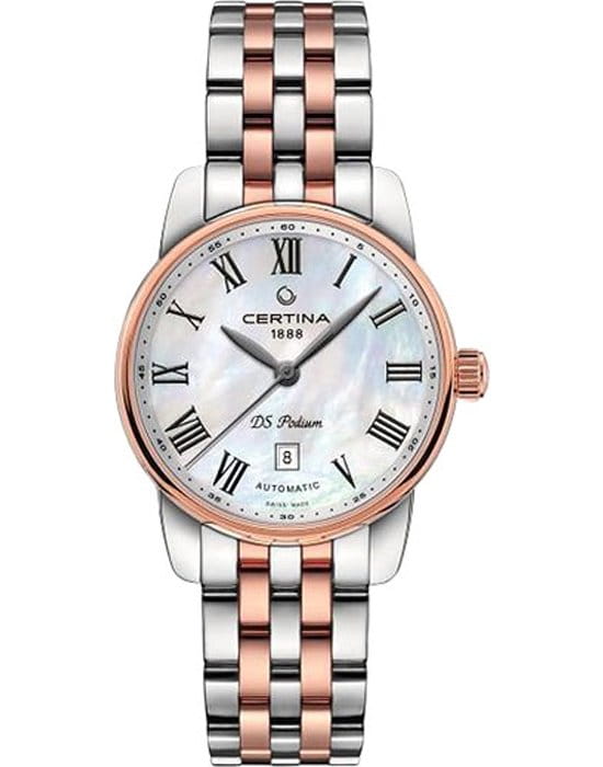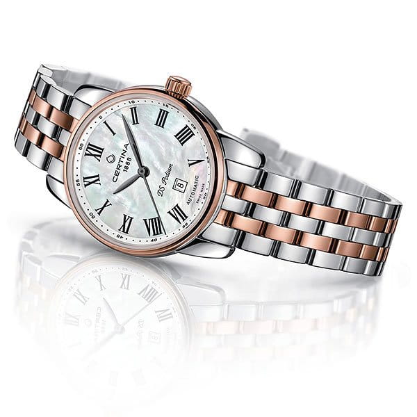 Элегантный аксессуар обладает вневременным дизайном, перламутровый циферблат дополнен римскими цифрами с винтажным оттенком. Часы с автоматической системой завода для своей работы используют энергию от движений руки носительницы, позволяя забыть о необходимости регулярного завода. Швейцарский механизм ETA 2671 с 38-часовым запасом хода. Скелетонизированная задняя крышка. Сапфировое стекло с двухсторонней обработкой «антиблик». Концепция Double SecurityDS ConceptDouble Security Concept, обозначает двойную надёжность и безупречную точность часов Certina. Двойная система защиты подразумевает обеспечение максимальной устойчивости к ударам и высоких показателей водонепроницаемости.. Корпус и браслет из нержавеющей стали 316L с PVD-покрытиемPVDУльтратонкое покрытие наносится в технике вакуумного напыления, сочетает в себе нитрид титана особой прочности со слоем золота или оксида хрома. Несёт в себе декоративную или защитную функцию. «розовое золото». Водозащита 100 метров. . Отображение числа. Диаметр корпуса: 29 мм.