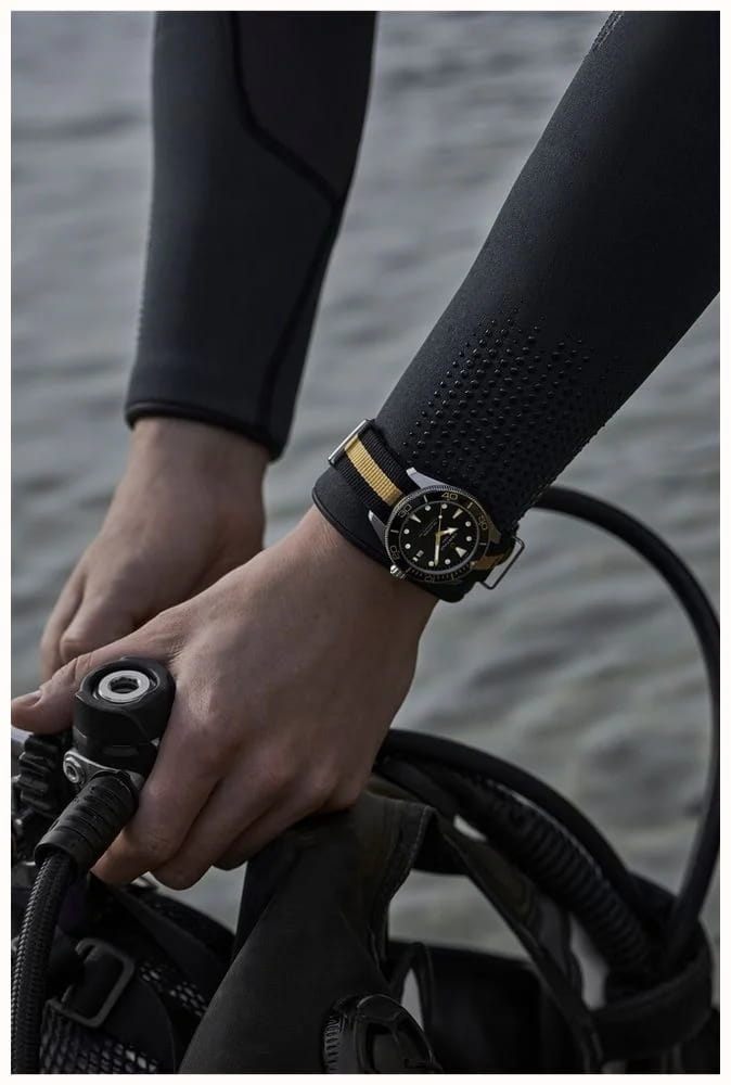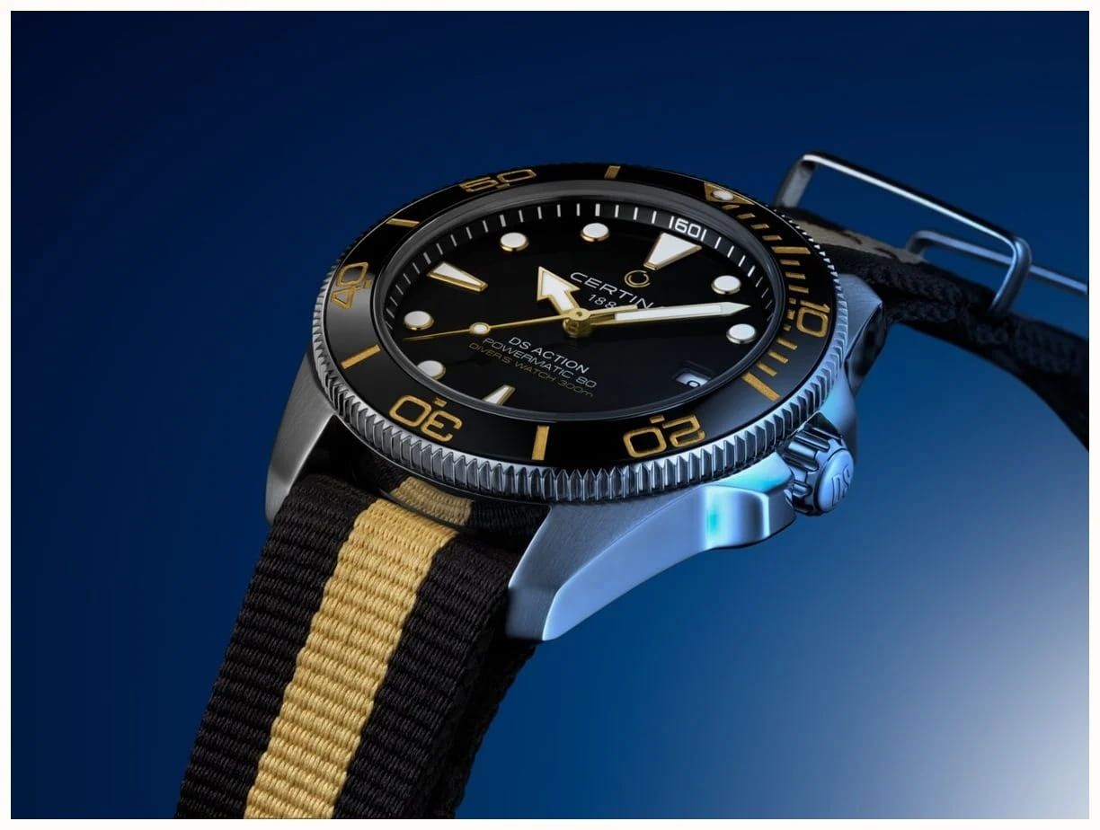 Мужские механические часы Certina DS-Action C0484071805101 — это надёжный аксессуар, созданный для тех, кто ценит сочетание швейцарского качества, функциональности и стиля. Модель входит в коллекцию Aqua, что подчёркивает её предназначение для водных активностей. Корпус диаметром 40,5 мм выполнен из нержавеющей стали с чёрной керамической рамкой, которая не только придаёт модели спортивный вид, но и защищает механизм от царапин. Циферблат чёрного цвета дополнен люминесцентными стрелками и индексами, обеспечивающими отличную читаемость даже в условиях слабого освещения. Защиту механизма обеспечивает сапфировое стеклоСапфировое стеклоПрочный и надёжный материал из кристалла сапфира синтетического происхождения, характеризующийся особой твёрдостью и устойчивостью к царапинам и повреждениям. с антибликовым покрытиемАнтибликовое покрытиеСлой оксида металла в 0,13-0,3 микрон, благодаря которому стекло часов не бликует и не отражает свет. Антибликовое покрытие уменьшает отражение света в 10 раз, обеспечивая отличную читаемость показателей циферблата., устойчивое к повреждениям. Часы оснащены автоматическим механизмом с запасом хода до 80 часов и пружиной баланса Nivachron™, что гарантирует высокую точность и долговечность. Функция отображения времени (часы, минуты, секунды) и даты делает модель удобной для повседневного использования. Водонепроницаемость позволяет использовать часы на глубине до 300 метров — идеально для плавания и ныряния. Ремешок NATO чёрного и золотистого цвета застёгивается на булавку, обеспечивая комфорт и надёжную фиксацию на запястье. Концепция DS, лежащая в основе всех моделей бренда, обеспечивает двойную защиту от ударов и вибраций, а также повышенную устойчивость к внешним воздействиям. Эти часы станут универсальным аксессуаром для тех, кто ценит сочетание стиля, функциональности и надёжности — идеальный выбор для повседневной носки и активного образа жизни.