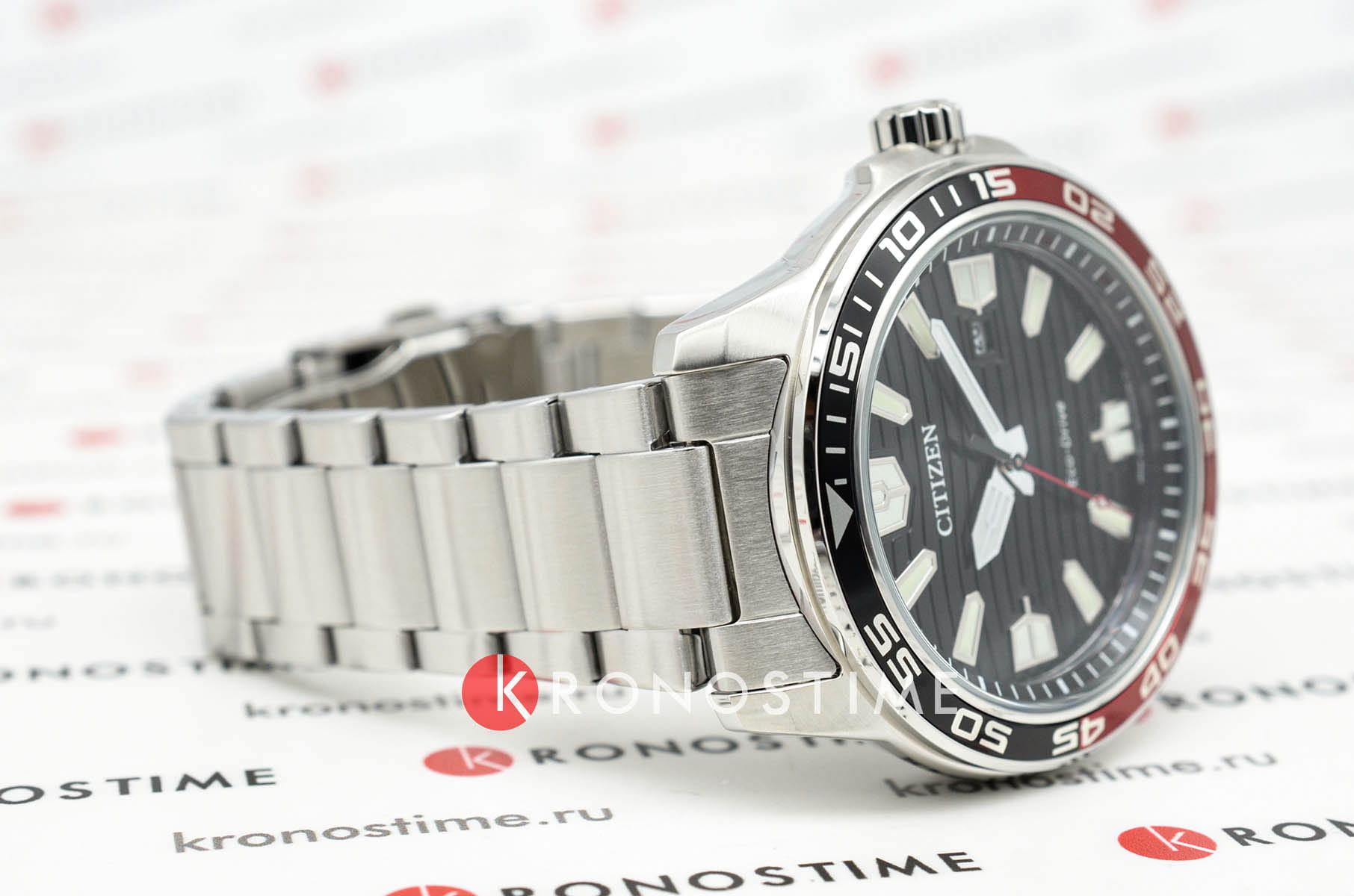 Часы Citizen AW1527-86E – это стильная и надежная модель японского производства, идеально подходящая для активного образа жизни. Корпус выполнен из высококачественной нержавеющей стали, в то время как на безельБезельВнешний ободок, закрепляющий стекло. В спортивных часах так называется поворотное кольцо с делениями на циферблате, выполняет роль таймера – замеряет отрезки времени на шкале. Неподвижный безель – элемент декора. Однонаправленно вращающийся безель на дайверских часах позволяет фиксировать моменты погружения и выныривания на поверхность. нанесено черное и красное PVD-покрытиеPVDУльтратонкое покрытие наносится в технике вакуумного напыления, сочетает в себе нитрид титана особой прочности со слоем золота или оксида хрома. Несёт в себе декоративную или защитную функцию., браслет также стальной. Черный циферблат украшен метками в виде штрихов и оснащен календарем с окошком даты. Защиту от повреждений обеспечивает прочное минеральное стеклоМинеральное стеклоМинеральное стекло представляет собой искусственно выращенный минерал кварца. Такое стекло отличается особой устойчивостью к повреждениям и царапинам. Уступает по некоторым качествам сапфировому стеклу., а водонепроницаемость до 100 метров позволяет не снимать часы во время плавания и занятий спортом. Внутри установлен надежный кварцевый механизм Citizen J810 с инновационной системой Eco-Drive, которая питается от солнечной энергии и не требует замены батарейки, обеспечивая запас хода до 240 дней. Стрелки и часовые метки с люминесцентным покрытиемЛюминесцентное покрытиеПозволяет считывать показания времени в темноте. Производители наносят на стрелки, часовые индексы, безель или поверхность циферблата светонакопительный состав, дающий холодное свечение. обеспечивают отличную читаемость даже в темноте. Функция индикации заряда EOLEOLПредставляет собой систему, уведомляющую владельца часов о необходимости замены элемента питания. За 2 недели до полного разряда батарейки секундная стрелка перестаёт ходить чётко и начинает перепрыгивать на 3-4 деления. подскажет, когда потребуется подзарядка. Корпус диаметром 45,9 мм, толщина 11,8 мм, ширина браслета 22 мм, вес модели составляет 160 граммов. Завинчивающаяся задняя крышка украшена фирменной гравировкой Eco-Drive, а заводная головка оснащена защитой. Надежная раскладная застёжкаРаскладная застёжкаТакой тип застёжки используется только на браслетах из металла. Она никогда не раскрывается полностью, происходит разделение на 2 и более частей. Раскладывающая застёжка снизит вероятность потери часов к минимуму. браслета с системой блокировки гарантирует комфортное и безопасное ношение.