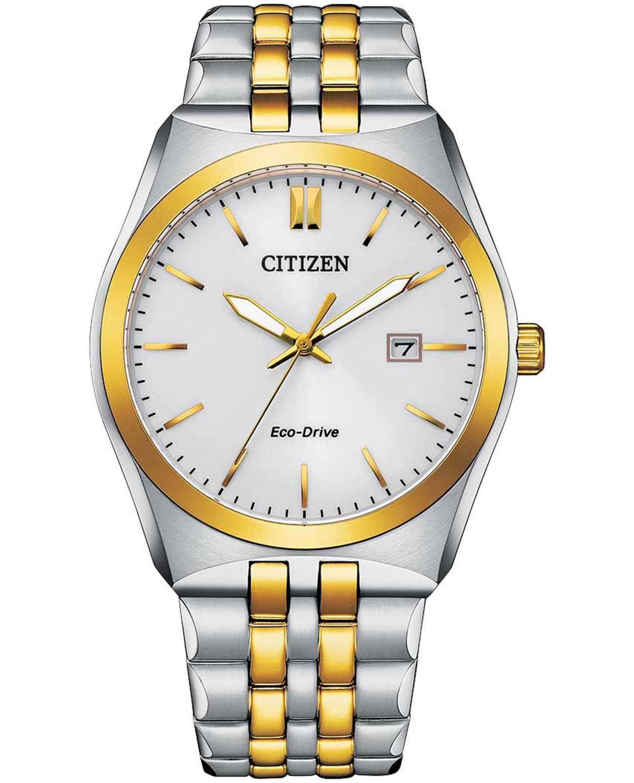 Citizen BM7334-58B — стильные японские часы, сочетающие классический дизайн и современные технологии. Корпус и браслет выполнены из прочной нержавеющей стали, а на безельБезельВнешний ободок, закрепляющий стекло. В спортивных часах так называется поворотное кольцо с делениями на циферблате, выполняет роль таймера – замеряет отрезки времени на шкале. Неподвижный безель – элемент декора. Однонаправленно вращающийся безель на дайверских часах позволяет фиксировать моменты погружения и выныривания на поверхность. с браслетом частично нанесено золотистое IP-покрытиеIP-покрытиеМетод ионного напыления. Демонстрирует повышенную устойчивость к истиранию, окислению и химическим веществам. Под воздействием высокого давления и температуры около 1500°C молекулы металла надёжно соединяются с частицами корпуса часов., что придает модели элегантный внешний вид и дополнительную износостойкость. Белый циферблат украшен аккуратными штриховыми метками, а окошко даты расположено на отметке 3 часа. Часы оснащены кварцевым механизмом Citizen E111 с фирменной системой Eco-Drive, благодаря которой питание осуществляется от солнечной энергии и не требуется регулярная замена батарейки. Запас хода составляет до 180 дней, предусмотрены функции индикации окончания заряда EOLEOLПредставляет собой систему, уведомляющую владельца часов о необходимости замены элемента питания. За 2 недели до полного разряда батарейки секундная стрелка перестаёт ходить чётко и начинает перепрыгивать на 3-4 деления. и предотвращения перезарядки аккумулятора. Минеральное стеклоМинеральное стеклоМинеральное стекло представляет собой искусственно выращенный минерал кварца. Такое стекло отличается особой устойчивостью к повреждениям и царапинам. Уступает по некоторым качествам сапфировому стеклу. надежно защищает циферблат от повреждений, а водозащита 100WR позволяет не снимать часы во время плавания и занятий водными видами спорта. Стрелки с люминесцентным покрытиемЛюминесцентное покрытиеПозволяет считывать показания времени в темноте. Производители наносят на стрелки, часовые индексы, безель или поверхность циферблата светонакопительный состав, дающий холодное свечение. обеспечивают отличную читаемость времени даже в темное время суток. Браслет снабжен удобной раскладной застёжкойРаскладная застёжкаТакой тип застёжки используется только на браслетах из металла. Она никогда не раскрывается полностью, происходит разделение на 2 и более частей. Раскладывающая застёжка снизит вероятность потери часов к минимуму., обеспечивая комфортную посадку на запястье. Диаметр корпуса составляет 40 мм, толщина — 9,2 мм, вес — 139 г. Эта модель станет отличным выбором для тех, кто ценит надежность, функциональность и безупречный стиль.