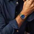 Citizen BM7532-54L — стильные японские часы для современных мужчин, сочетающие в себе высокую функциональность и элегантный внешний вид. Надежный кварцевый механизм Citizen E111 с инновационной технологией Eco-Drive обеспечивает питание от солнечной энергии и полностью избавляет от необходимости замены батарейки, а запас хода составляет до 180 дней. Корпус и браслет выполнены из нержавеющей стали с износостойким золотистым IP-покрытиеIP-покрытиеМетод ионного напыления. Демонстрирует повышенную устойчивость к истиранию, окислению и химическим веществам. Под воздействием высокого давления и температуры около 1500°C молекулы металла надёжно соединяются с частицами корпуса часов., что гарантирует долговечность и сохранение внешнего вида. Синий текстурированный циферблат с аккуратными метками и стрелками с люминесцентным покрытиемЛюминесцентное покрытиеПозволяет считывать показания времени в темноте. Производители наносят на стрелки, часовые индексы, безель или поверхность циферблата светонакопительный состав, дающий холодное свечение. надежно защищён сапфировым стекломСапфировое стеклоПрочный и надёжный материал из кристалла сапфира синтетического происхождения, характеризующийся особой твёрдостью и устойчивостью к царапинам и повреждениям., устойчивым к царапинам. Окно даты расположено в районе 3 часов, а заводная головка оснащена защитой. Часы обладают водозащитой до 100 метров, подходят для повседневного ношения и активного образа жизни. Браслет дополнен удобной раскладной застёжкойРаскладная застёжкаТакой тип застёжки используется только на браслетах из металла. Она никогда не раскрывается полностью, происходит разделение на 2 и более частей. Раскладывающая застёжка снизит вероятность потери часов к минимуму., обеспечивающей комфорт и безопасность. Размер корпуса — 41 мм, толщина — 9,4 мм, что делает модель универсальным выбором для любого случая.