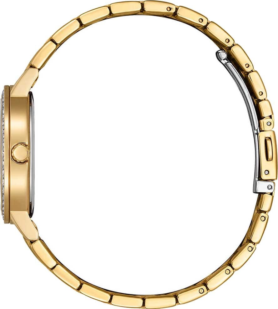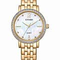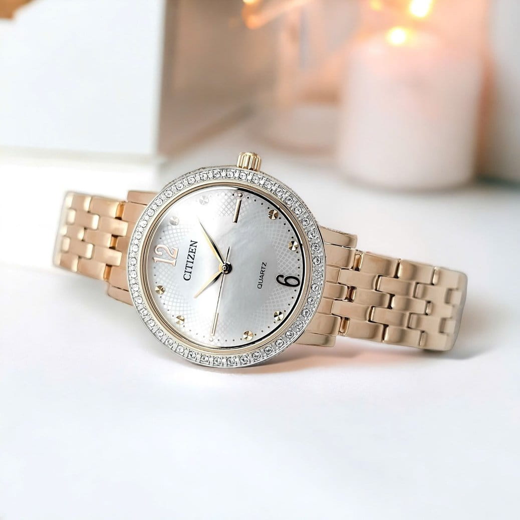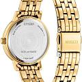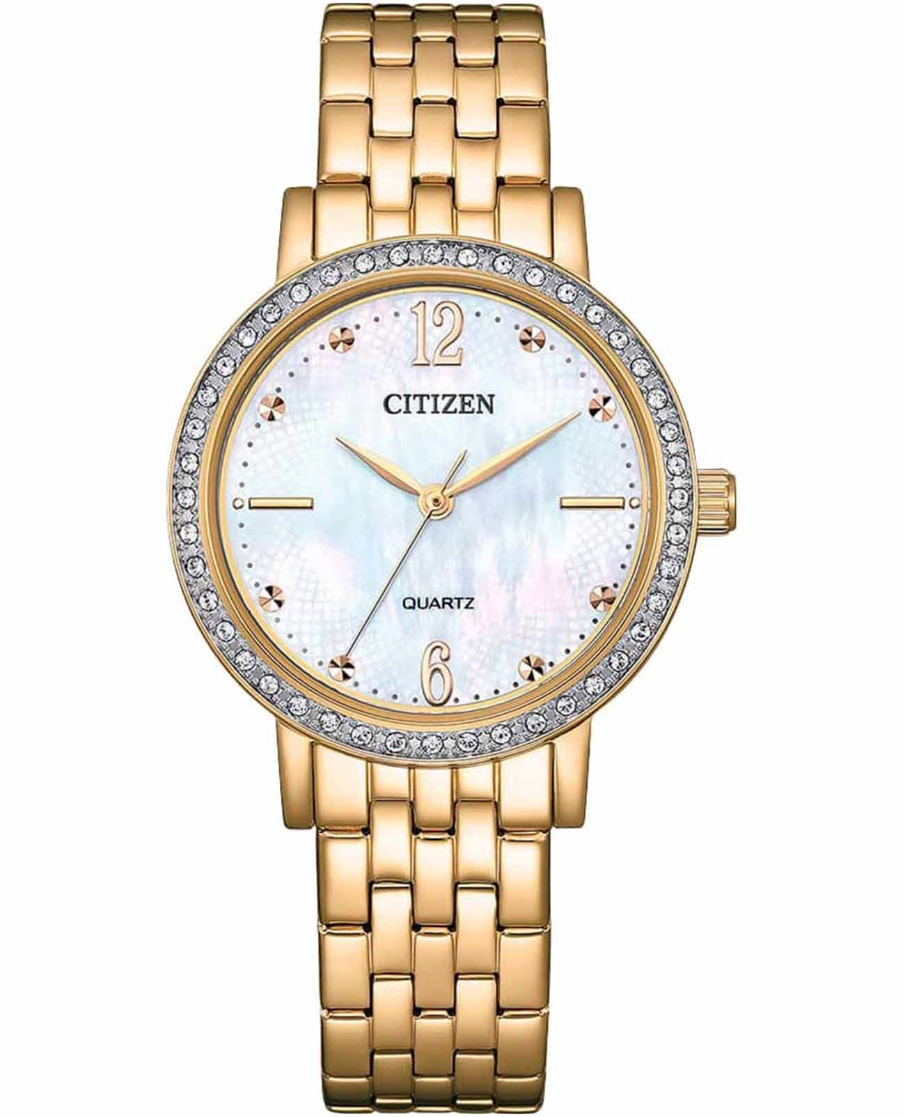 Часы Citizen EL3103-57D представляют собой элегантную модель, выполненную в Японии, сочетающую в себе современные технологии и утончённый дизайн. Корпус и браслет изготовлены из прочной нержавеющей стали с золотистым IP-покрытиемIP-покрытиеМетод ионного напыления. Демонстрирует повышенную устойчивость к истиранию, окислению и химическим веществам. Под воздействием высокого давления и температуры около 1500°C молекулы металла надёжно соединяются с частицами корпуса часов., что обеспечивает долговечность и привлекательный внешний вид. Диаметр корпуса составляет 31 мм, а толщина — всего 7 мм, что делает часы изящными и аккуратными на запястье. Особое внимание привлекает безельБезельВнешний ободок, закрепляющий стекло. В спортивных часах так называется поворотное кольцо с делениями на циферблате, выполняет роль таймера – замеряет отрезки времени на шкале. Неподвижный безель – элемент декора. Однонаправленно вращающийся безель на дайверских часах позволяет фиксировать моменты погружения и выныривания на поверхность., украшенный мерцающими кристаллами, которые придают часам особый шарм и изысканность. Надёжный кварцевый механизм гарантирует точность хода, а водозащита уровня WR 50 позволяет не снимать часы при мытье рук или во время дождя. Перламутровый циферблат украшен часовыми индексами в виде точек и цифр, а также оснащён центральными стрелками часов, минут и секунд для удобного считывания времени и кристаллами. Минеральное стеклоМинеральное стеклоМинеральное стекло представляет собой искусственно выращенный минерал кварца. Такое стекло отличается особой устойчивостью к повреждениям и царапинам. Уступает по некоторым качествам сапфировому стеклу. устойчиво к появлению мелких царапин, сохраняя прозрачность и презентабельный вид.  Стальной браслет с золотистым  IP-покрытиемIP-покрытиеМетод ионного напыления. Демонстрирует повышенную устойчивость к истиранию, окислению и химическим веществам. Под воздействием высокого давления и температуры около 1500°C молекулы металла надёжно соединяются с частицами корпуса часов. и раскладной застёжкойРаскладная застёжкаТакой тип застёжки используется только на браслетах из металла. Она никогда не раскрывается полностью, происходит разделение на 2 и более частей. Раскладывающая застёжка снизит вероятность потери часов к минимуму. надежно фиксирует часы на запястье, обеспечивая комфорт при ежедневном ношении.