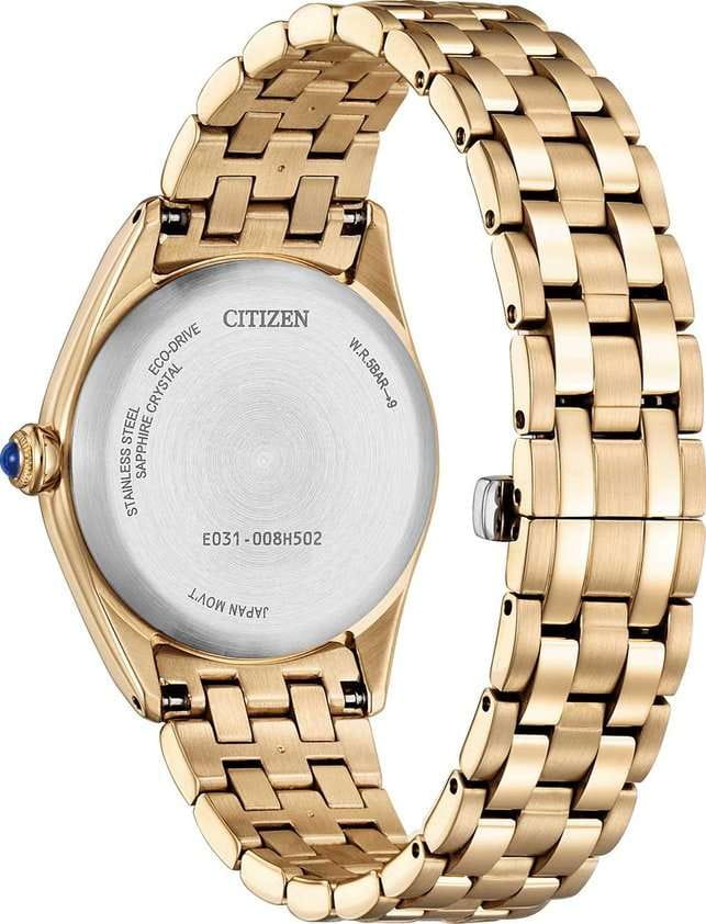 Часы Citizen EM1143-81X созданы для тех, кто ценит изящество и передовые технологии. Модель выполнена в Японии и оснащена кварцевым механизмом Citizen E031 с инновационной системой Eco-Drive, которая обеспечивает питание от солнечной энергии и не требует замены батарейки. Запаса энергии хватает на 180 дней, а функция индикации заряда и система предотвращения перезарядки гарантируют стабильную работу. Корпус диаметром 33 мм и толщиной 8,7 мм изготовлен из высококачественной стали с золотистым IP-покрытиемIP-покрытиеМетод ионного напыления. Демонстрирует повышенную устойчивость к истиранию, окислению и химическим веществам. Под воздействием высокого давления и температуры около 1500°C молекулы металла надёжно соединяются с частицами корпуса часов., а белый циферблат с римскими цифрами и штрихами придает часам утончённый вид. Сапфировое стеклоСапфировое стеклоПрочный и надёжный материал из кристалла сапфира синтетического происхождения, характеризующийся особой твёрдостью и устойчивостью к царапинам и повреждениям. надежно защищает циферблат от царапин и повреждений. Заводная головка украшена камнем в форме кабошона, что добавляет особого шарма аксессуару. Стальной браслет с золотистым IP-покрытиемIP-покрытиеМетод ионного напыления. Демонстрирует повышенную устойчивость к истиранию, окислению и химическим веществам. Под воздействием высокого давления и температуры около 1500°C молекулы металла надёжно соединяются с частицами корпуса часов. с удобной застежкой «бабочка»Застёжка "бабочка"Такой вид застёжки дополняется предохранителями, помогающими избежать случайного раскрытия браслета. Обладают изящным исполнением. обеспечивает комфортную посадку на запястье. Водозащита уровня 50WR позволяет использовать часы в повседневной жизни, не опасаясь попадания влаги. Эта модель станет стильным и надежным дополнением к вашему образу.