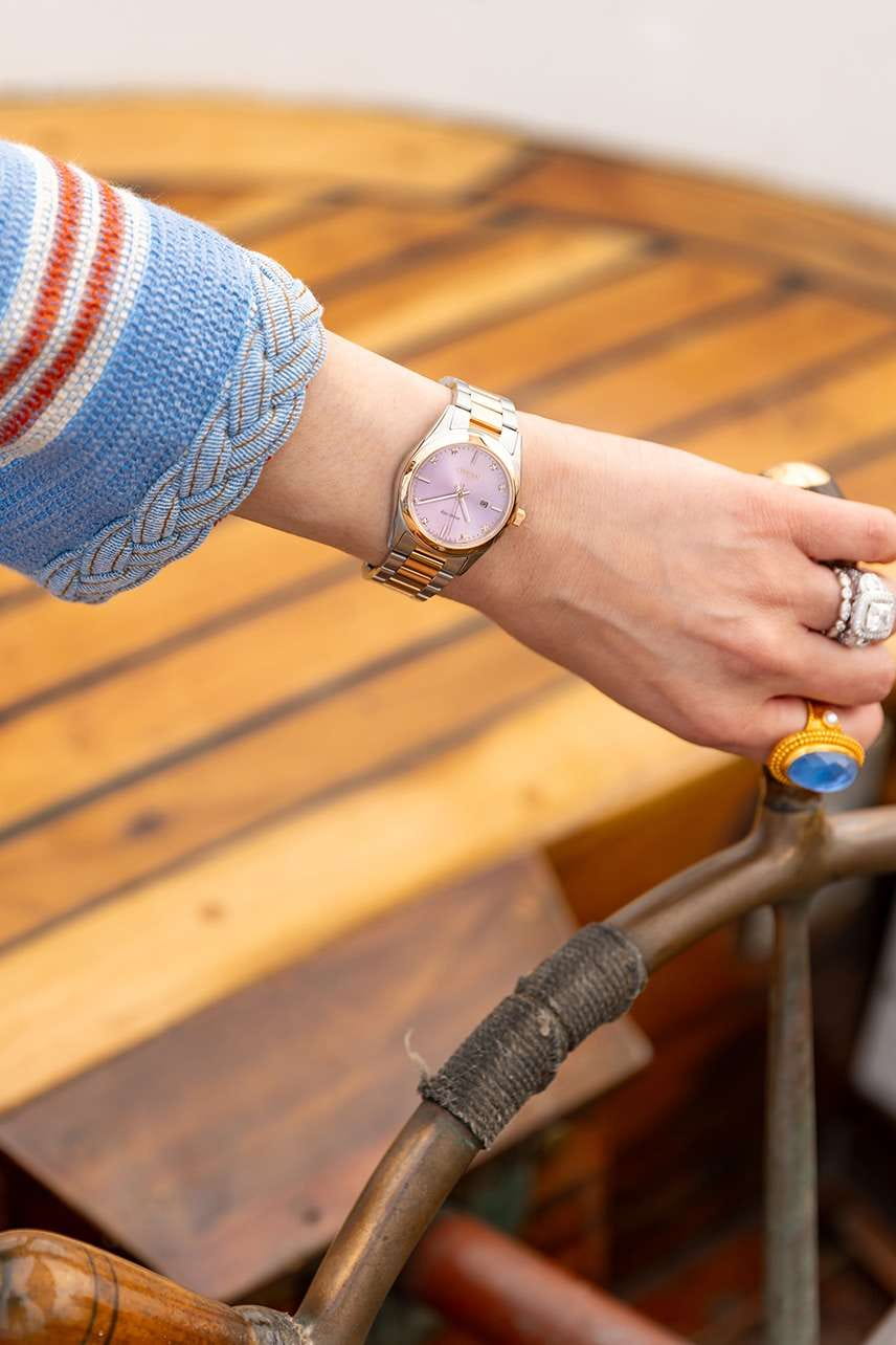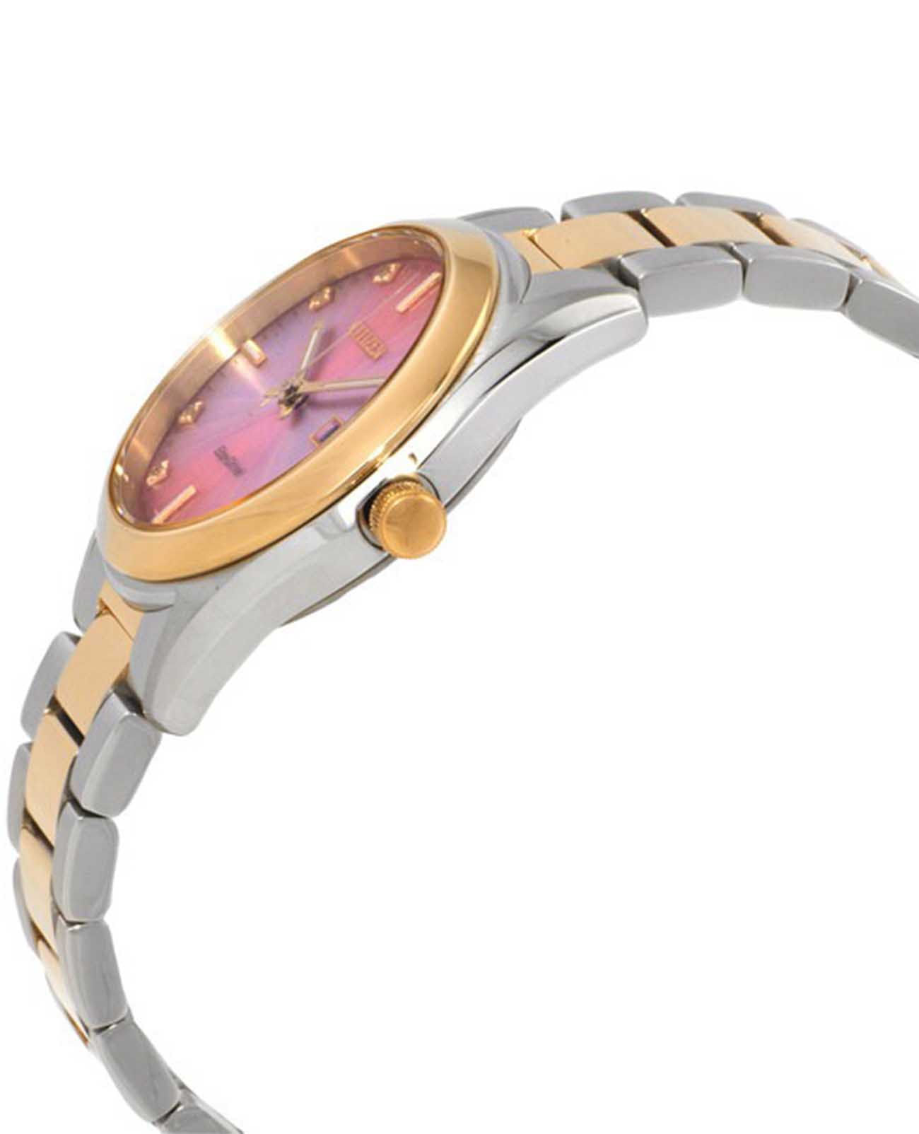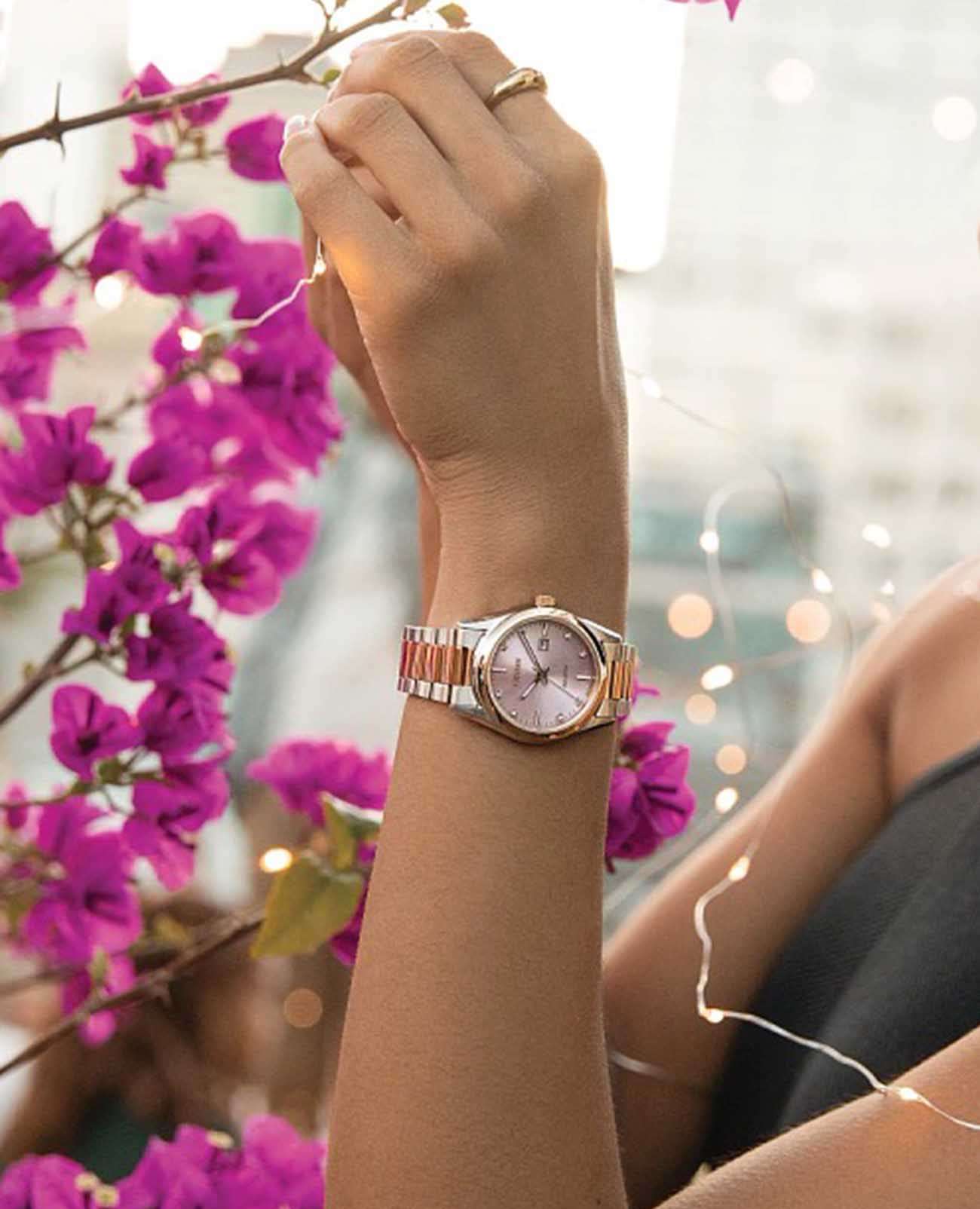 Часы Citizen EW2706-58X гармонично сочетают элегантность и современные технологии, привлекая внимание изысканным дизайном. Круглый корпус диаметром 33 мм и толщиной 8 мм выполнен из нержавеющей стали, а безельБезельВнешний ободок, закрепляющий стекло. В спортивных часах так называется поворотное кольцо с делениями на циферблате, выполняет роль таймера – замеряет отрезки времени на шкале. Неподвижный безель – элемент декора. Однонаправленно вращающийся безель на дайверских часах позволяет фиксировать моменты погружения и выныривания на поверхность. с золотистым IP-покрытиемIP-покрытиеМетод ионного напыления. Демонстрирует повышенную устойчивость к истиранию, окислению и химическим веществам. Под воздействием высокого давления и температуры около 1500°C молекулы металла надёжно соединяются с частицами корпуса часов., что придаёт аксессуару изящный и утончённый вид. Розовый циферблат украшен восемью настоящими бриллиантами, выступающими в роли часовых индексов, а также дополнен окошком даты, расположенным на отметке 3 часа. Модель оснащена японским кварцевым механизмом, обеспечивающим высокую точность и надёжность хода. Прочное сапфировое стеклоСапфировое стеклоПрочный и надёжный материал из кристалла сапфира синтетического происхождения, характеризующийся особой твёрдостью и устойчивостью к царапинам и повреждениям. защищает циферблат от царапин и других внешних воздействий, сохраняя его безупречный внешний вид на долгое время. Стрелки и метки с люминесцентным покрытиемЛюминесцентное покрытиеПозволяет считывать показания времени в темноте. Производители наносят на стрелки, часовые индексы, безель или поверхность циферблата светонакопительный состав, дающий холодное свечение. обеспечивают отличную читаемость времени даже в темное время суток. Стальной браслет с частичным золотистым IP-покрытиемIP-покрытиеМетод ионного напыления. Демонстрирует повышенную устойчивость к истиранию, окислению и химическим веществам. Под воздействием высокого давления и температуры около 1500°C молекулы металла надёжно соединяются с частицами корпуса часов. и раскладной застёжкойРаскладная застёжкаТакой тип застёжки используется только на браслетах из металла. Она никогда не раскрывается полностью, происходит разделение на 2 и более частей. Раскладывающая застёжка снизит вероятность потери часов к минимуму. на кнопке гарантирует удобство и надёжную фиксацию на запястье. Водонепроницаемость уровня WR 100 позволяет использовать часы во время плавания и занятий сноркелингом, не опасаясь за их сохранность. Часы разработаны и произведены в Японии, что подтверждает их высокое качество и долговечность.