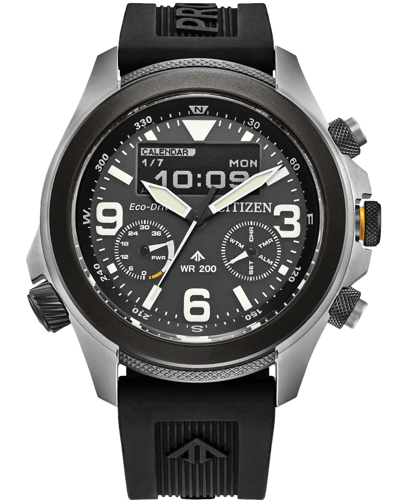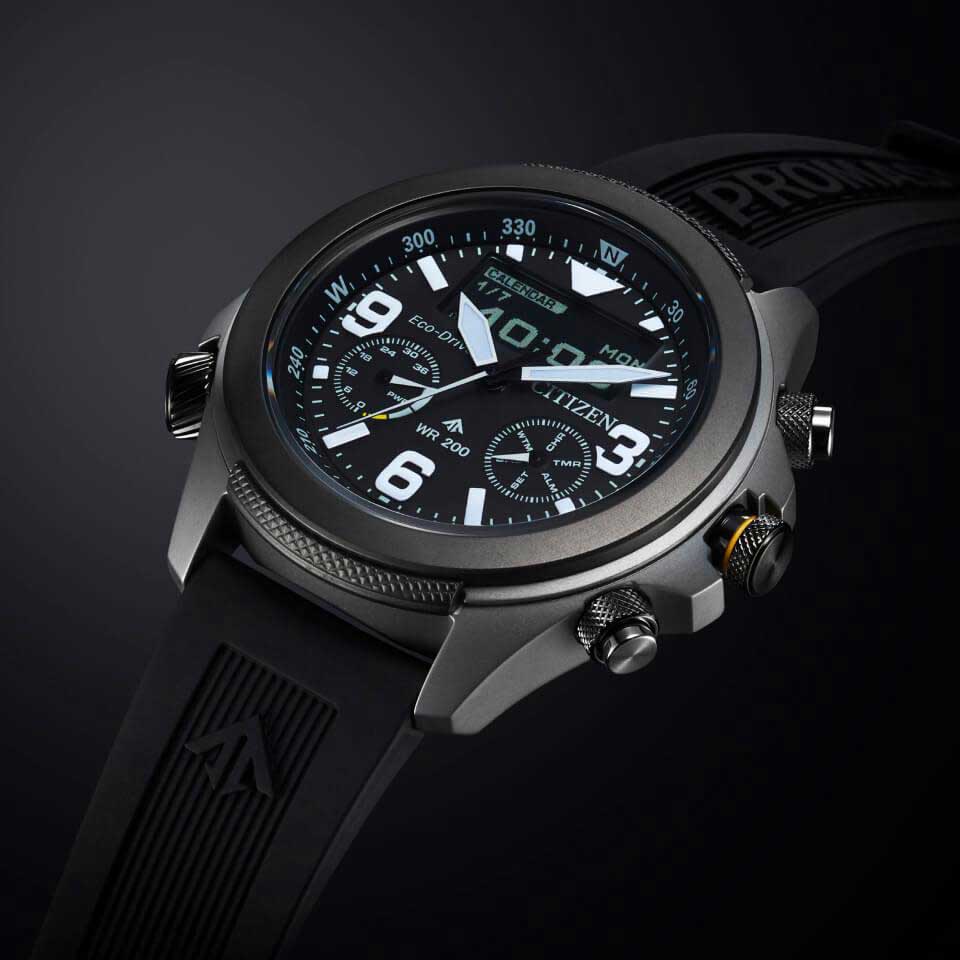 Citizen Promaster JV1007-07E часы-хронографХронографФункция позволяет измерять отрезки времени с особой точностью: часы, минуты, секунды. Верным признаком хронографа является наличие на циферблате 3 дополнительных окошек-счётчиков. с секундомеромСекундомерСекундоме́р — прибор, способный измерять интервалы времени с точностью до долей секунды. спортивного дизайна с высоким уровнем водозащиты. Корпус из нержавеющей стали диаметром 43,9 мм идеально сбалансирован. Сапфировое стеклоСапфировое стеклоПрочный и надёжный материал из кристалла сапфира синтетического происхождения, характеризующийся особой твёрдостью и устойчивостью к царапинам и повреждениям. с антибликовым покрытием обеспечивает отличную защиту циферблата от царапин. Часы работают на основе кварцевого механизма, питание от солнечной энергии, запас энергии на 360 дней. Время работы при полной зарядке и включенной функции сохранения энергии до 3 лет. Полиуретановый ремешок на стандартной застежке идеально дополняют дизайн часов, обеспечивая комфортное ношение. Стрелки и метки на циферблате имеют люминесцентное покрытиеЛюминесцентное покрытиеПозволяет считывать показания времени в темноте. Производители наносят на стрелки, часовые индексы, безель или поверхность циферблата светонакопительный состав, дающий холодное свечение. позволяющее легко определять время даже в темноте. LCD дисплей с светодиодной подсветкойСветодиодная подсветкаСветодиодная или LED-подсветка обеспечивает появление яркого холодного свечения за счёт LED-элементов - маленьких лампочек. Они потребляют минимальное количество энергии, чаще всего можно встретить 1 светодиод, в нижней части циферблата.. Вращающийся внутренний безельБезельВнешний ободок, закрепляющий стекло. В спортивных часах так называется поворотное кольцо с делениями на циферблате, выполняет роль таймера – замеряет отрезки времени на шкале. Неподвижный безель – элемент декора. Однонаправленно вращающийся безель на дайверских часах позволяет фиксировать моменты погружения и выныривания на поверхность. с IP-покрытиемIP-покрытиеМетод ионного напыления. Демонстрирует повышенную устойчивость к истиранию, окислению и химическим веществам. Под воздействием высокого давления и температуры около 1500°C молекулы металла надёжно соединяются с частицами корпуса часов. со шкалой компаса. Функция индикации заряда (EOL) и предотвращения перезарядки. Мировое времяМировое время Полезное часовое усложнение, отображающее время в основных городах и известных областях по всему миру, оно связано с часовыми поясами, удобно для путешественников и бизнесменов. - 43 города (29 часовых поясов), переход на зимнее и летнее время. Сплит-хронографСплит-хронографИспользуется для измерения продолжительности нескольких временных отрезков, начинающихся одновременно, а заканчивающихся в разное время.. ТаймерТаймерОтсчитывает секунды в обратном направлении в заданном интервале времени. обратного отсчета до 100мин. Всемирное координированное время UTCUTCВсемирное кординационное время, не имеющее привязки к географическому положению Гринвича, основывается на атомном отсчёте времени. Регулировка времени осуществляется более точно, чем устаревшее GMT.
