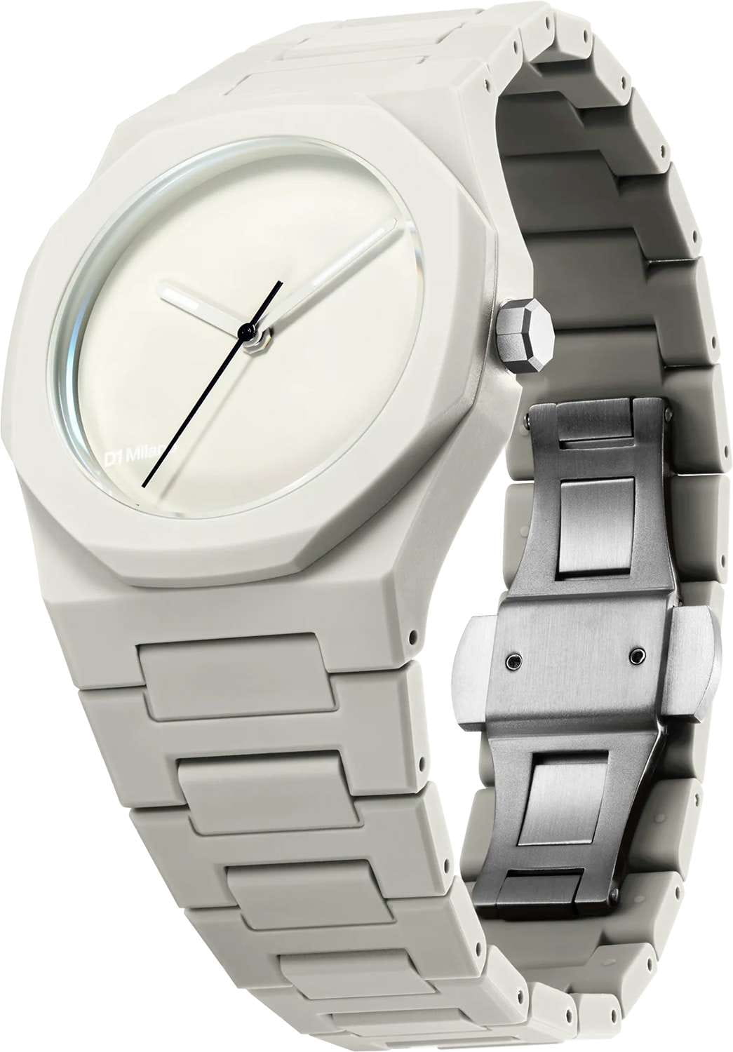 Часы D1 Milano Polycarbon PCBU08 – молодежные часы в стиле унисекс для повседневных образов, стильные и комфортные. Модель имеет белый корпус и браслет из поликарбоната с покрытием Софт-Тач.. Циферблат лаконичный с индексами в виде штрихов, защищен минеральным стекломМинеральное стеклоМинеральное стекло представляет собой искусственно выращенный минерал кварца. Такое стекло отличается особой устойчивостью к повреждениям и царапинам. Уступает по некоторым качествам сапфировому стеклу. с антибликовым покрытием. Стальная задняя крышка на 4 винтах. Пластиковый браслет на застёжке-бабочке с кнопкамиЗастёжка "бабочка"Такой вид застёжки дополняется предохранителями, помогающими избежать случайного раскрытия браслета. Обладают изящным исполнением. .
