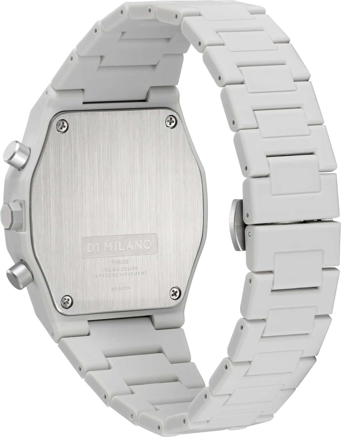 Часы D1 Milano PHBJ08 — это элегантные кварцевые часы, которые впечатляют своим функциональным дизайном, подходят как для мужчин, так и для женщин. Их высокая надежность превращает эти часы в незаменимый аксессуар на каждый день. ХронографХронографФункция позволяет измерять отрезки времени с особой точностью: часы, минуты, секунды. Верным признаком хронографа является наличие на циферблате 3 дополнительных окошек-счётчиков. оснащен секундомеромСекундомерСекундоме́р — прибор, способный измерять интервалы времени с точностью до долей секунды. и серым циферблатом, защищенным минеральным стекломМинеральное стеклоМинеральное стекло представляет собой искусственно выращенный минерал кварца. Такое стекло отличается особой устойчивостью к повреждениям и царапинам. Уступает по некоторым качествам сапфировому стеклу.. На циферблате расположены накладные метки в виде штрихов и три дополнительных циферблата с серыми стрелками, а также окошко календаря в районе отметки «4:30». Пластиковый серый безельБезельВнешний ободок, закрепляющий стекло. В спортивных часах так называется поворотное кольцо с делениями на циферблате, выполняет роль таймера – замеряет отрезки времени на шкале. Неподвижный безель – элемент декора. Однонаправленно вращающийся безель на дайверских часах позволяет фиксировать моменты погружения и выныривания на поверхность. отлично сочетается с таким же пластиковым браслетом, застежкой «бабочка»Застёжка "бабочка"Такой вид застёжки дополняется предохранителями, помогающими избежать случайного раскрытия браслета. Обладают изящным исполнением. . Стальная задняя крышка этих часов крепится на 4-х винтах. Водонепроницаемость до 50 метров делает эти часы идеальным выбором для повседневного использования.