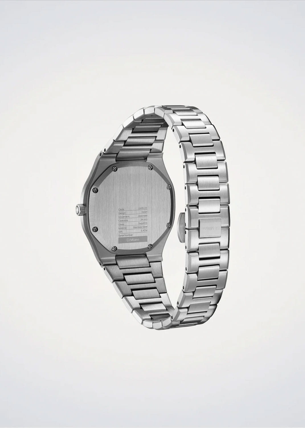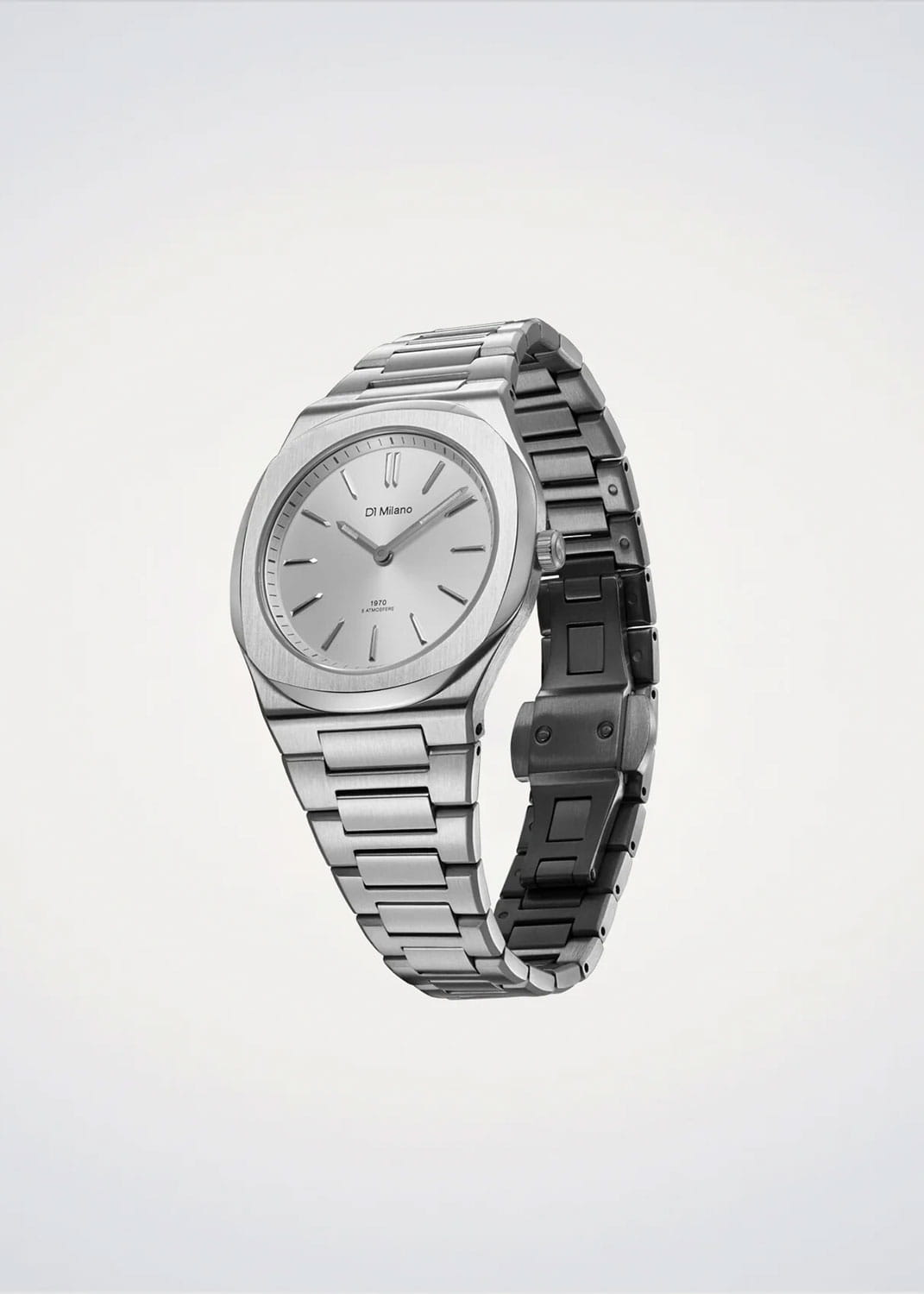 Женские кварцевые часы D1 Milano Ultra Thin UHBL01 — это стильное сочетание элегантности и современного дизайна. Изящный ультратонкий корпус выполнен из нержавеющей стали, диаметром 34 мм, что придаст образу элегантности и надежности. Изысканный циферблат с метками в виде штрихов придает модели особый блеск. Циферблат защищен сапфировым стекломСапфировое стеклоПрочный и надёжный материал из кристалла сапфира синтетического происхождения, характеризующийся особой твёрдостью и устойчивостью к царапинам и повреждениям. с антибликовым покрытиемАнтибликовое покрытиеСлой оксида металла в 0,13-0,3 микрон, благодаря которому стекло часов не бликует и не отражает свет. Антибликовое покрытие уменьшает отражение света в 10 раз, обеспечивая отличную читаемость показателей циферблата., обеспечивающий устойчивость к царапинам. Стрелки с люминесцентным покрытиемЛюминесцентное покрытиеПозволяет считывать показания времени в темноте. Производители наносят на стрелки, часовые индексы, безель или поверхность циферблата светонакопительный состав, дающий холодное свечение.. Часы оснащены надежным кварцевым механизмом. Стальной браслет на застёжке-бабочке с кнопкамиЗастёжка "бабочка"Такой вид застёжки дополняется предохранителями, помогающими избежать случайного раскрытия браслета. Обладают изящным исполнением. , гарантирует комфортное и безопасное ношение. Класс водозащиты: 50 метров позволит защитить корпус от случайных брызг или капель дождя. Отличный выбор для тех, кто ценит утонченность и качество.