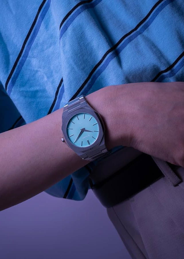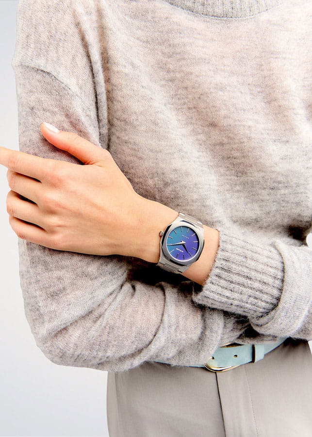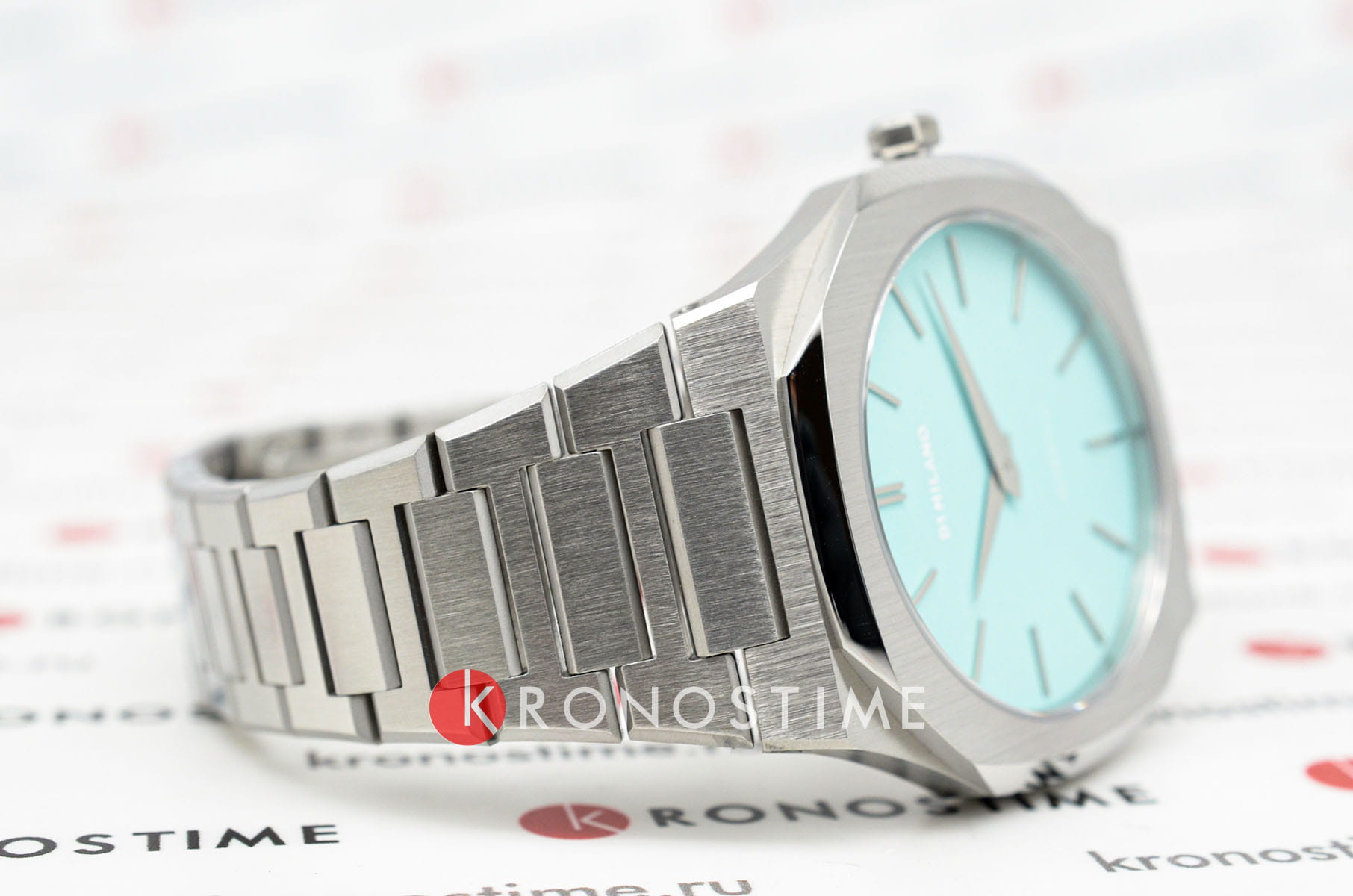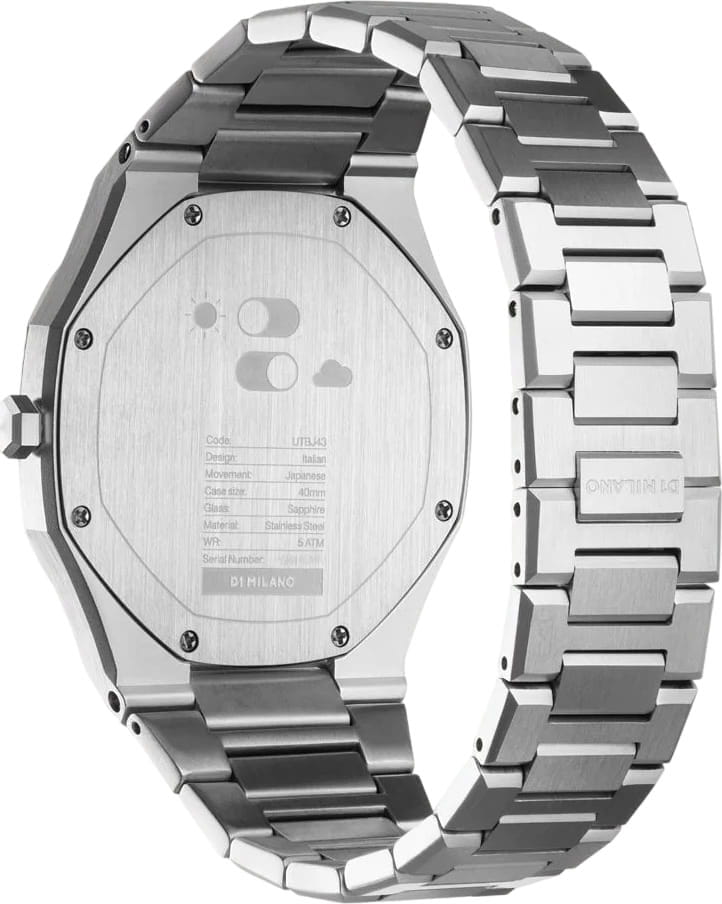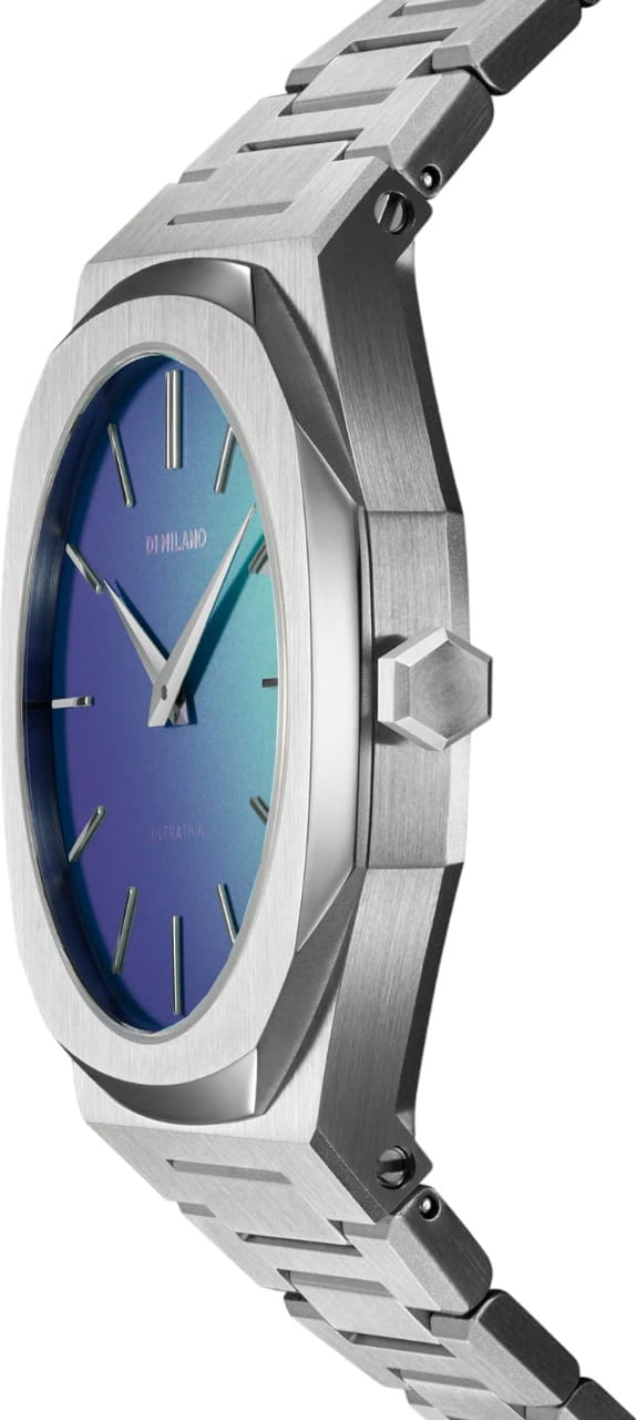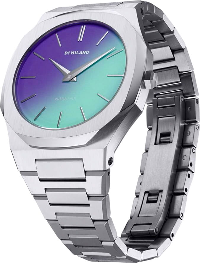 Часы D1 Milano Ultra Thin Chromo Sync UTBJ43 — это уникальные кварцевые часы, которые подчеркнут ваш изысканный стиль. Эти наручные часы из коллекции Ultra Thin с эффектным фотохромным циферблатом станут выразительным акцентом вашего образа. Корпус диаметром 40 мм из нержавеющей стали придает часам современный и утонченный вид. Циферблат с метками в виде штрихов, а стрелки создают стильный контраст, подчёркивая элегантность модели. Задняя крышка из нержавеющей стали закреплена на 8-х винтах. Стальной браслет с застежкой «бабочка»Застёжка "бабочка"Такой вид застёжки дополняется предохранителями, помогающими избежать случайного раскрытия браслета. Обладают изящным исполнением. обеспечивает надежность и комфорт в повседневном использовании. Сапфировое стеклоСапфировое стеклоПрочный и надёжный материал из кристалла сапфира синтетического происхождения, характеризующийся особой твёрдостью и устойчивостью к царапинам и повреждениям.  с антибликовым покрытиемАнтибликовое покрытиеСлой оксида металла в 0,13-0,3 микрон, благодаря которому стекло часов не бликует и не отражает свет. Антибликовое покрытие уменьшает отражение света в 10 раз, обеспечивая отличную читаемость показателей циферблата. защищает циферблат, а водозащита до 50WR делает эти часы практичным выбором для любых условий. Благодаря калибру Miyota 1L22, они отличаются точностью и надежностью. Эти итальянские часы представляют собой идеальное сочетание традиционного мастерства и инновационного подхода, воплощая в себе новый взгляд на классическую элегантность.
