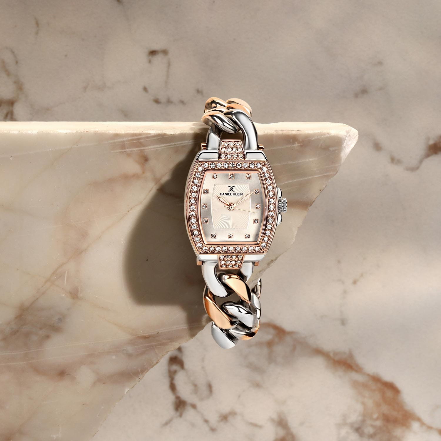 Женские кварцевые часы Daniel Klein — это великолепный аксессуар, который поможет создать идеальный момент. Корпус размером 25×35 мм выполнен из нержавеющей стали. БезельБезельВнешний ободок, закрепляющий стекло. В спортивных часах так называется поворотное кольцо с делениями на циферблате, выполняет роль таймера – замеряет отрезки времени на шкале. Неподвижный безель – элемент декора. Однонаправленно вращающийся безель на дайверских часах позволяет фиксировать моменты погружения и выныривания на поверхность. с IP-покрытиемIP-покрытиеМетод ионного напыления. Демонстрирует повышенную устойчивость к истиранию, окислению и химическим веществам. Под воздействием высокого давления и температуры около 1500°C молекулы металла надёжно соединяются с частицами корпуса часов.. Циферблат серебристого цвета гильоширован и выполнен по технологии Sunray («солнечные лучи»), оформлен точками с кристаллами и стрелками. Стрелки с люминесцентным покрытиемЛюминесцентное покрытиеПозволяет считывать показания времени в темноте. Производители наносят на стрелки, часовые индексы, безель или поверхность циферблата светонакопительный состав, дающий холодное свечение., обеспечивающим хорошую читаемость в темноте. Циферблат защищён минеральным стекломМинеральное стеклоМинеральное стекло представляет собой искусственно выращенный минерал кварца. Такое стекло отличается особой устойчивостью к повреждениям и царапинам. Уступает по некоторым качествам сапфировому стеклу.. Часы оснащены стальным браслетом-цепью с частичным IP-покрытиемIP-покрытиеМетод ионного напыления. Демонстрирует повышенную устойчивость к истиранию, окислению и химическим веществам. Под воздействием высокого давления и температуры около 1500°C молекулы металла надёжно соединяются с частицами корпуса часов.. Водонепроницаемость 30 м позволяет использовать часы в повседневных условиях. Идеальный выбор для тех, кто ценит турецкое качество и роскошный дизайн.