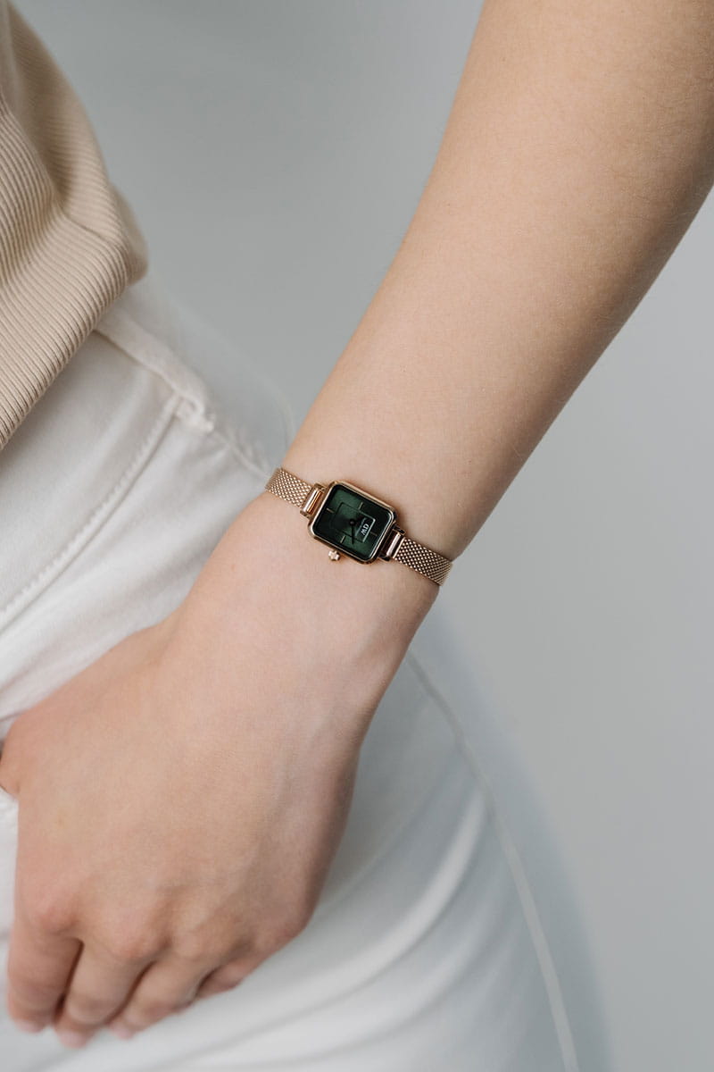 Женские наручные часы с минеральным стекломМинеральное стеклоМинеральное стекло представляет собой искусственно выращенный минерал кварца. Такое стекло отличается особой устойчивостью к повреждениям и царапинам. Уступает по некоторым качествам сапфировому стеклу. Daniel Wellington Quadro Mini Melrose Emerald DW00100648, кварцевый механизм с высокой точностью. Класс водозащиты: 30 метров, позволит защитить корпус от случайных брызг или капель дождя. Корпус часов изготовлен из стали с PVD-покрытиемPVDУльтратонкое покрытие наносится в технике вакуумного напыления, сочетает в себе нитрид титана особой прочности со слоем золота или оксида хрома. Несёт в себе декоративную или защитную функцию.. Стальной браслет на раскладной застёжкеРаскладная застёжкаТакой тип застёжки используется только на браслетах из металла. Она никогда не раскрывается полностью, происходит разделение на 2 и более частей. Раскладывающая застёжка снизит вероятность потери часов к минимуму. с PVD-покрытиемPVDУльтратонкое покрытие наносится в технике вакуумного напыления, сочетает в себе нитрид титана особой прочности со слоем золота или оксида хрома. Несёт в себе декоративную или защитную функцию.. Двухуровневый циферблат выполнен по технологии Sunray (солнечные лучи) и украшен фирменным логотипом Daniel Wellington. Накладные метки в виде штрихов. Рифленая заводная головка. Индивидуальный серийный номер.