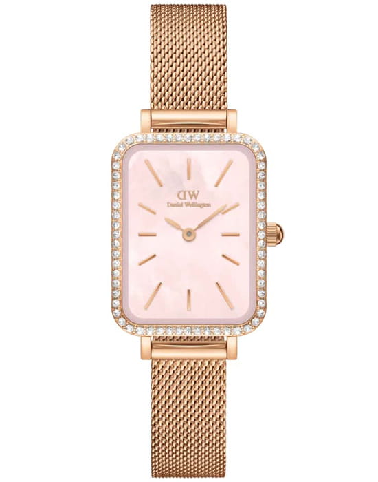 Женские наручные часы с минеральным стекломМинеральное стеклоМинеральное стекло представляет собой искусственно выращенный минерал кварца. Такое стекло отличается особой устойчивостью к повреждениям и царапинам. Уступает по некоторым качествам сапфировому стеклу. Daniel Wellington Quadro DW00100669, кварцевый механизм с высокой точностью. Корпус часов изготовлен из нержавеющей стали 316L с PVD-покрытиемPVDУльтратонкое покрытие наносится в технике вакуумного напыления, сочетает в себе нитрид титана особой прочности со слоем золота или оксида хрома. Несёт в себе декоративную или защитную функцию.. БезельБезельВнешний ободок, закрепляющий стекло. В спортивных часах так называется поворотное кольцо с делениями на циферблате, выполняет роль таймера – замеряет отрезки времени на шкале. Неподвижный безель – элемент декора. Однонаправленно вращающийся безель на дайверских часах позволяет фиксировать моменты погружения и выныривания на поверхность. украшен кристаллами Swarovski. Розовый циферблат украшен фирменным логотипом Daniel Wellington. Накладные метки в виде штрихов. Японский кварцевый механизм. Рифленая заводная головка. Класс водозащиты: 30 метров, позволит защитить корпус от случайных брызг или капель дождя. Стальной браслет с PVD-покрытиемPVDУльтратонкое покрытие наносится в технике вакуумного напыления, сочетает в себе нитрид титана особой прочности со слоем золота или оксида хрома. Несёт в себе декоративную или защитную функцию. миланского плетения на раскладном замкеРаскладной замокДанный вариант застежки используется только на часах с металлическим браслетом. Отличительная особенность такого крепления в том, что длина браслета становится универсальной и вы можете самостоятельно отрегулировать нужный вам размер – застежка просто двигается по браслету часов..