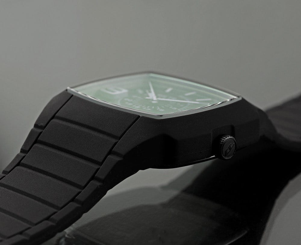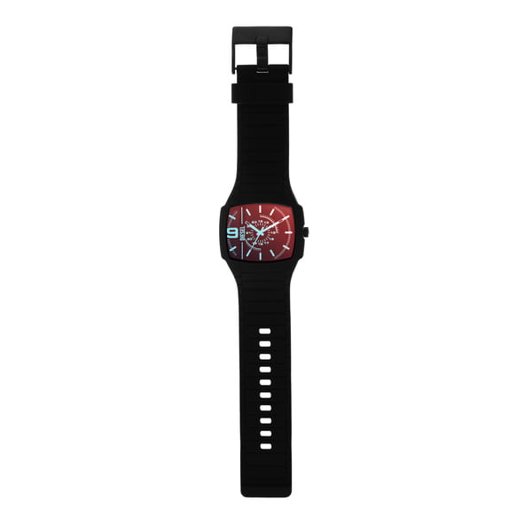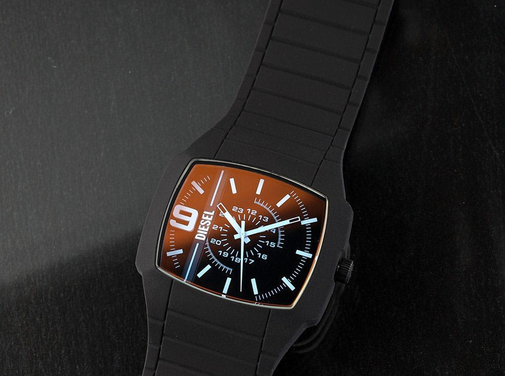 Мужские наручные часы с минеральным стекломМинеральное стеклоМинеральное стекло представляет собой искусственно выращенный минерал кварца. Такое стекло отличается особой устойчивостью к повреждениям и царапинам. Уступает по некоторым качествам сапфировому стеклу. Diesel Cliffhanger 2.0 DZ2166, кварцевый механизм с высокой точностью. Класс водозащиты: 30 метров, позволит защитить корпус от случайных брызг или капель дождя. Квадратный корпус часов изготовлен из стали и пластика. Циферблат содержит накладные метки. Силиконовый ремешок на стандартной застёжке. Стекло с эффектом бензинового пятна. Стрелки и метки с люминесцентным покрытиемЛюминесцентное покрытиеПозволяет считывать показания времени в темноте. Производители наносят на стрелки, часовые индексы, безель или поверхность циферблата светонакопительный состав, дающий холодное свечение..