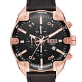 Мужские наручные часы-хронографХронографФункция позволяет измерять отрезки времени с особой точностью: часы, минуты, секунды. Верным признаком хронографа является наличие на циферблате 3 дополнительных окошек-счётчиков. с секундомеромСекундомерСекундоме́р — прибор, способный измерять интервалы времени с точностью до долей секунды. Diesel Spiked DZ4607, кварцевый механизм с высокой точностью. Минеральное стеклоМинеральное стеклоМинеральное стекло представляет собой искусственно выращенный минерал кварца. Такое стекло отличается особой устойчивостью к повреждениям и царапинам. Уступает по некоторым качествам сапфировому стеклу. устойчивое к мелким механическим повреждениям. Класс водозащиты: 50 метров, позволит защитить корпус от случайных брызг или капель дождя. Корпус часов изготовлен из стали с IP-покрытиемIP-покрытиеМетод ионного напыления. Демонстрирует повышенную устойчивость к истиранию, окислению и химическим веществам. Под воздействием высокого давления и температуры около 1500°C молекулы металла надёжно соединяются с частицами корпуса часов.. Циферблат содержит накладные метки. Кожаный ремешок на стандартной застёжке. Окошко даты находится в положении 4 часа.