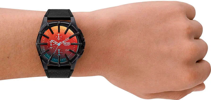 Мужские кварцевые часы Diesel DZ4658 — это стильный аксессуар, который подчеркнёт индивидуальность и чувство моды своего владельца. Модель выполнена в брутальном спортивном стиле, но при этом сохраняет универсальность, подходя как для повседневной носки, так и для неформальных случаев. Часы оснащены точным кварцевым механизмом и функцией секундомераСекундомерСекундоме́р — прибор, способный измерять интервалы времени с точностью до долей секунды., что делает их не только аксессуаром, но и практичным инструментом. Циферблат чёрного цвета дополнен штриховыми метками, а также крупными контрастными элементами, обеспечивающими отличную читаемость. Защиту циферблата обеспечивает минеральное стеклоМинеральное стеклоМинеральное стекло представляет собой искусственно выращенный минерал кварца. Такое стекло отличается особой устойчивостью к повреждениям и царапинам. Уступает по некоторым качествам сапфировому стеклу. с цветным покрытием, устойчивое к мелким повреждениям. Корпус изготовлен из стали с PVD-покрытиемPVDУльтратонкое покрытие наносится в технике вакуумного напыления, сочетает в себе нитрид титана особой прочности со слоем золота или оксида хрома. Несёт в себе декоративную или защитную функцию., что придаёт модели благородный внешний вид и повышает устойчивость к царапинам. Заводная головка имеет защиту, обеспечивающую дополнительную надёжность и комфорт при использовании. Ремешок из натуральной кожи чёрного цвета дополнен классической застёжкой, обеспечивая плотную и удобную посадку на запястье. Ширина ремешка составляет 22 мм, что гармонично сочетается с диаметром корпуса 44 мм и толщиной 14,5 мм. Часы водонепроницаемы до 50 метров (), что позволяет использовать их в повседневных условиях — при мытье рук или под дождём. Эти часы станут универсальным аксессуаром для тех, кто ценит сочетание стиля, точности и надёжности — идеальный выбор для уверенных в себе мужчин, следящих за своим образом и предпочитающих выделяться.