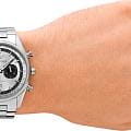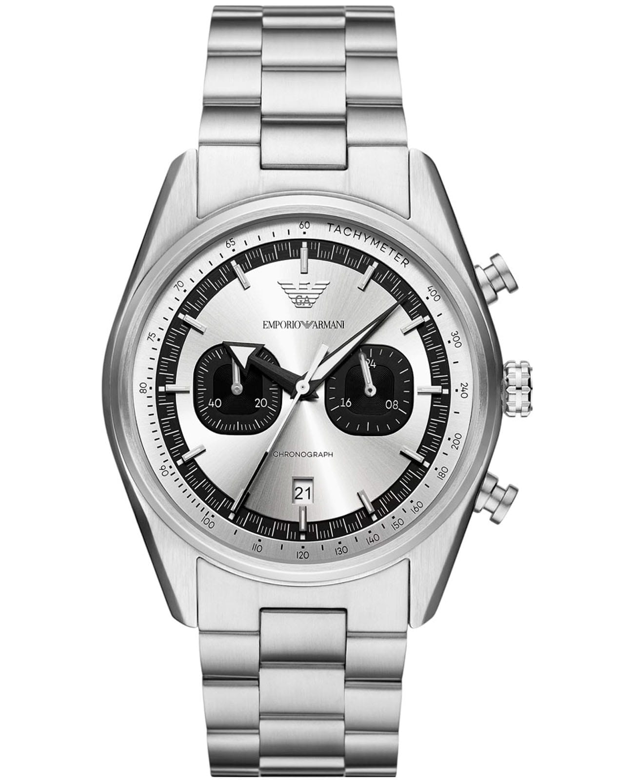Мужские часы Emporio Armani Racer AR11636  - стильные кварцевые часы-хронографХронографФункция позволяет измерять отрезки времени с особой точностью: часы, минуты, секунды. Верным признаком хронографа является наличие на циферблате 3 дополнительных окошек-счётчиков. с секундомеромСекундомерСекундоме́р — прибор, способный измерять интервалы времени с точностью до долей секунды. сочетают в себе элегантность и функциональность, что делает их идеальным аксессуаром для современного мужчины. Корпус часов из нержавеющей стали, что обеспечивает долговечность и устойчивость к внешним воздействиям. Минеральное стеклоМинеральное стеклоМинеральное стекло представляет собой искусственно выращенный минерал кварца. Такое стекло отличается особой устойчивостью к повреждениям и царапинам. Уступает по некоторым качествам сапфировому стеклу. защищает циферблат, добавляя изысканности всей конструкции. Размер корпуса составляет 42 мм, а толщина — 11 мм, что придаёт часам солидный внешний вид, не утяжеляя при этом запястье. Часы имеют водонепроницаемость WR50 (5 атм), это позволяет использовать их в повседневной жизни, не опасаясь воздействия воды. Стальной браслет на застёжке-бабочке с кнопкамиЗастёжка "бабочка"Такой вид застёжки дополняется предохранителями, помогающими избежать случайного раскрытия браслета. Обладают изящным исполнением. обеспечивает комфортное и надёжное крепление на запястье. 12-ти и 24-х часовой формат времени добавляет практичности и удобства в использовании. ТахиметрТахиметрРазмеченная шкала, располагается на ободке или безеле часов. Тахиметр позволяет рассчитать скорость на определённом участке пути, расстояние измеряется в километрах или милях. по внешнему краю. Окошко даты находится в положении 6 часов. Стрелки с люминесцентным покрытиемЛюминесцентное покрытиеПозволяет считывать показания времени в темноте. Производители наносят на стрелки, часовые индексы, безель или поверхность циферблата светонакопительный состав, дающий холодное свечение. обеспечивают удобное считывание времени в темноте после кратковременного пребывания на свету, что делает эти часы практичными в любых условиях.