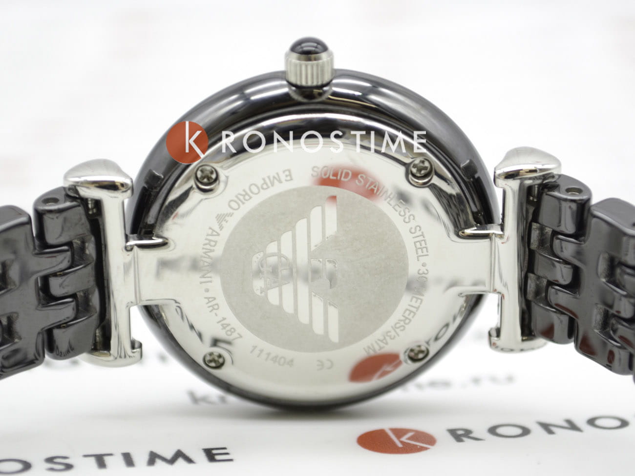 Женские итальянские часы с минеральным стекломМинеральное стеклоМинеральное стекло представляет собой искусственно выращенный минерал кварца. Такое стекло отличается особой устойчивостью к повреждениям и царапинам. Уступает по некоторым качествам сапфировому стеклу. Emporio Armani AR1487, кварцевый механизм с высокой точностью. Корпус часов изготовлен из стали с PVD-покрытиемPVDУльтратонкое покрытие наносится в технике вакуумного напыления, сочетает в себе нитрид титана особой прочности со слоем золота или оксида хрома. Несёт в себе декоративную или защитную функцию. и керамики. Класс водозащиты: 50 метров, позволит защитить корпус от случайных брызг или капель дождя. Кермический браслет на застёжке-бабочке с кнопкамиЗастёжка "бабочка"Такой вид застёжки дополняется предохранителями, помогающими избежать случайного раскрытия браслета. Обладают изящным исполнением. .