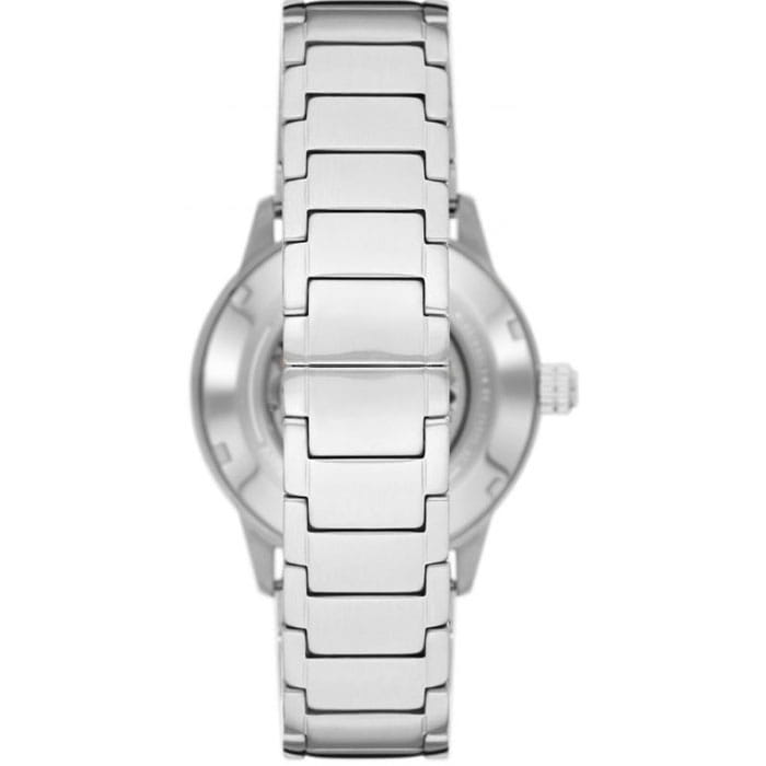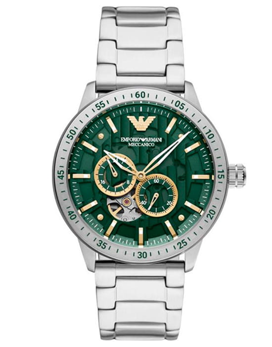 Итальянские мужские часы Emporio Armani Mario AR60053, механический механизм (автоматический калибр) с высокой точностью. Класс водозащиты: 50 метров, позволит защитить корпус от случайных брызг или капель дождя. Корпус и браслет часов изготовлены из стали. Браслет с застёжкой-бабочкой с кнопкамиЗастёжка "бабочка"Такой вид застёжки дополняется предохранителями, помогающими избежать случайного раскрытия браслета. Обладают изящным исполнением. . На безелеБезельВнешний ободок, закрепляющий стекло. В спортивных часах так называется поворотное кольцо с делениями на циферблате, выполняет роль таймера – замеряет отрезки времени на шкале. Неподвижный безель – элемент декора. Однонаправленно вращающийся безель на дайверских часах позволяет фиксировать моменты погружения и выныривания на поверхность. расположилась шкала тахиметраТахиметрРазмеченная шкала, располагается на ободке или безеле часов. Тахиметр позволяет рассчитать скорость на определённом участке пути, расстояние измеряется в километрах или милях..