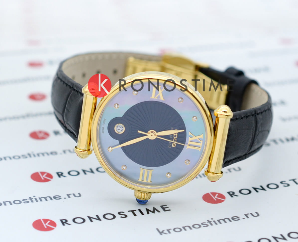 Женские швейцарские наручные часы с кварцевым механизмом с высокой точностью. Сапфировое стеклоСапфировое стеклоПрочный и надёжный материал из кристалла сапфира синтетического происхождения, характеризующийся особой твёрдостью и устойчивостью к царапинам и повреждениям. устойчивое к появлению царапин, обладающее высокой прозрачностью. Класс водозащиты: 30 метров, позволит защитить корпус от случайных брызг или капель дождя. Корпус часов изготовлен из стали с PVD-покрытиемPVDУльтратонкое покрытие наносится в технике вакуумного напыления, сочетает в себе нитрид титана особой прочности со слоем золота или оксида хрома. Несёт в себе декоративную или защитную функцию.. Кожаный ремешок с классической застежкой.<br>