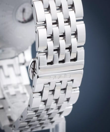 Мужские механические часы с ручным подзаводом Epos из коллекции Oeuvre d'art Limited Edition — это уникальное произведение часового искусства. Корпус диаметром 43,5 мм и толщиной 11 мм выполнен из нержавеющей стали 316L. Циферблат белого цвета с винтажным дизайном оформлен печатными римскими цифрами чёрного цвета. Циферблат защищён сапфировым стекломСапфировое стеклоПрочный и надёжный материал из кристалла сапфира синтетического происхождения, характеризующийся особой твёрдостью и устойчивостью к царапинам и повреждениям.. Часовая и минутная стрелки смещены от центра, а малая секундная стрелка пульсометра выведена на обратную сторону корпуса. Механизм — швейцарский калибр ETA Unitas 6497 с ручным подзаводом, частично скелетонизированный, с декорированными мостами, гравировкой и жемчужным зернением. Заводная головка — винтовая, формы «луковица». Модель оснащена стальным браслетом из литых звеньев в 7 рядов с застёжкой «бабочка» с кнопкамиЗастёжка "бабочка"Такой вид застёжки дополняется предохранителями, помогающими избежать случайного раскрытия браслета. Обладают изящным исполнением. . Функция пульсометра позволяет измерять частоту сердечных сокращений. Модель выпущена ограниченной серией — 888 экземпляров. Водонепроницаемость 50 м позволяет использовать часы в повседневных условиях. Гарантия — 24 месяца. Уникальный выбор для ценителя редких и эксклюзивных механизмов.