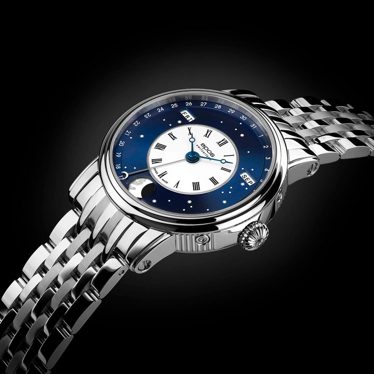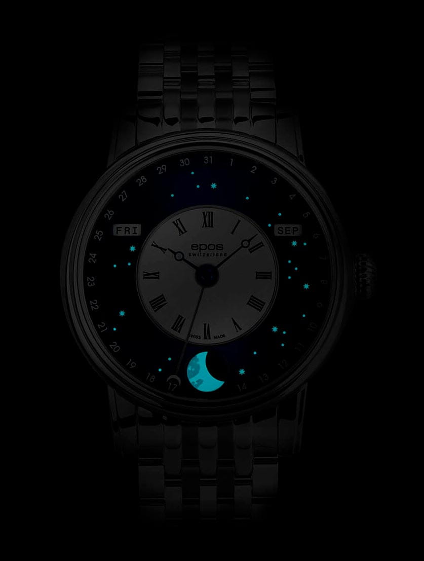 Мужские швейцарские механические часы с автоподзаводом Epos Oeuvre d'art 3439.322.20.26.30. Сапфировое стеклоСапфировое стеклоПрочный и надёжный материал из кристалла сапфира синтетического происхождения, характеризующийся особой твёрдостью и устойчивостью к царапинам и повреждениям. устойчивое к появлению царапин, обладающее высокой прозрачностью. Корпус часов изготовлен из нержавеющей стали. В механизме 25 камней, частота 28800 полуколебаний в час. Запас хода 42 часа. Механизм декорирован узором Cotes de Geneve. Циферблат в виде симбиоза белой лакированной вставки с римскими цифрами и вставки в виде ночного неба, выполненной по технологии Sunray (солнечные лучи). Светящиеся звезды и большая луна с люминесцентной подсветкойЛюминесцентное покрытиеПозволяет считывать показания времени в темноте. Производители наносят на стрелки, часовые индексы, безель или поверхность циферблата светонакопительный состав, дающий холодное свечение.. Дата отображается центральной стрелкой. Окошко дня недели и месяца. Автоматический указатель фазы луны. Винтажная заводная головка. Прозрачная задняя крышка. Класс водозащиты: 50 метров, позволит защитить корпус от случайных брызг или капель дождя. Стальной браслет на раскладной застёжкеРаскладная застёжкаТакой тип застёжки используется только на браслетах из металла. Она никогда не раскрывается полностью, происходит разделение на 2 и более частей. Раскладывающая застёжка снизит вероятность потери часов к минимуму..