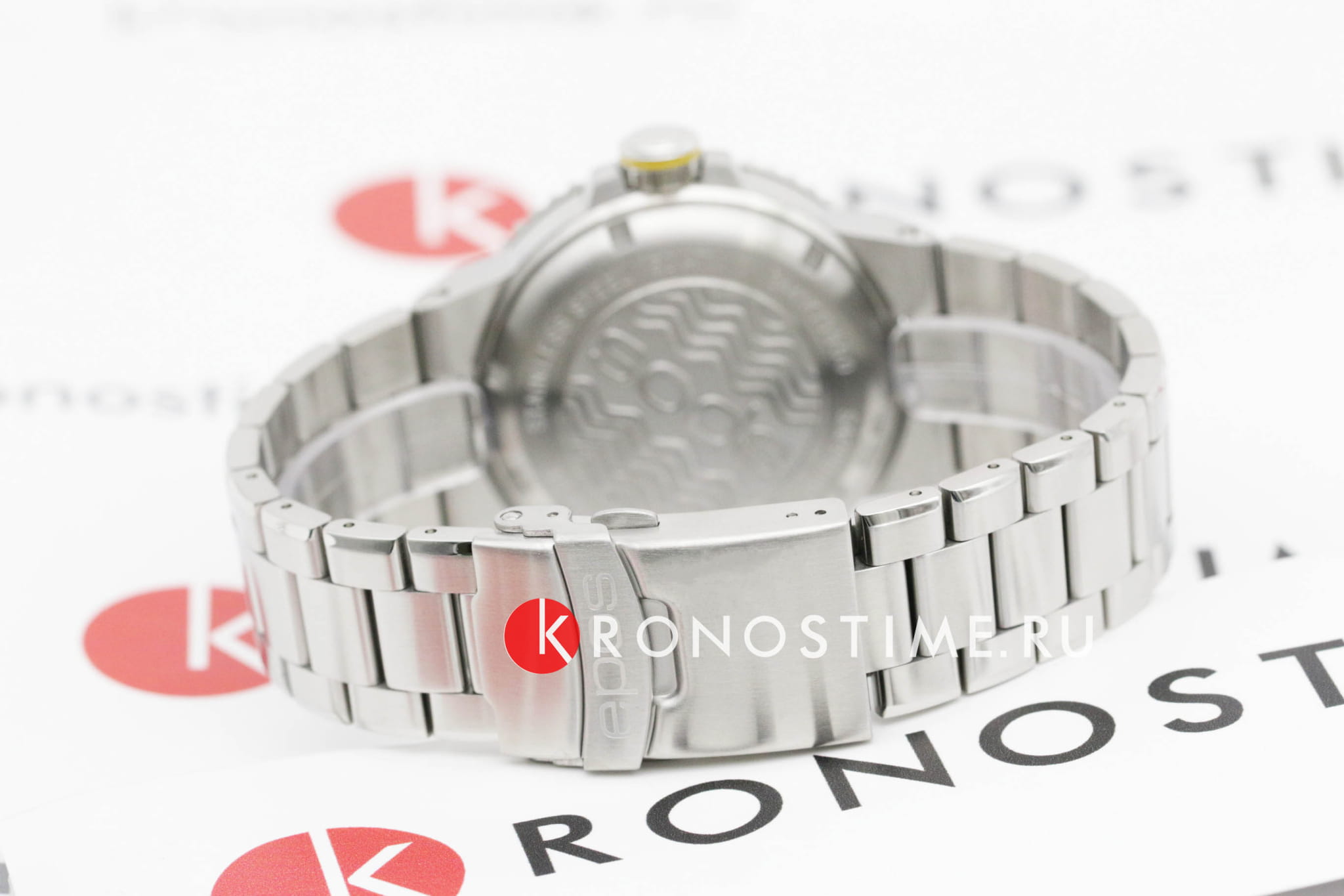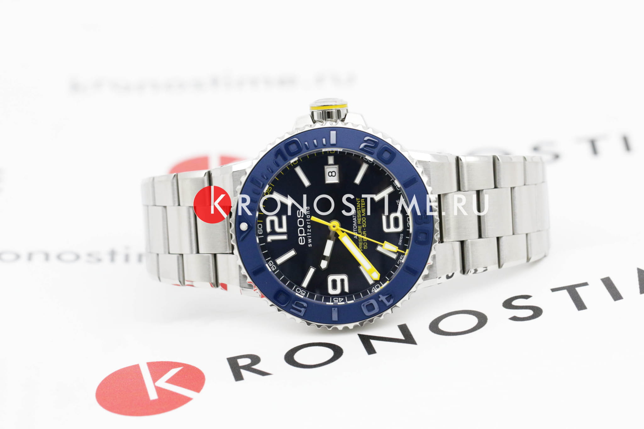 Мужские механические часы с автоподзаводом Epos из коллекции Diver — это профессиональный дайверский инструмент с швейцарским качеством. Корпус диаметром 43 мм и толщиной 14 мм выполнен из нержавеющей стали 316L с PVD-покрытиемPVDУльтратонкое покрытие наносится в технике вакуумного напыления, сочетает в себе нитрид титана особой прочности со слоем золота или оксида хрома. Несёт в себе декоративную или защитную функцию.. Циферблат синего цвета с пескоструйной обработкой оформлен аппликациями часовых индексов и крупными цифрами с покрытием. Циферблат защищён сапфировым стекломСапфировое стеклоПрочный и надёжный материал из кристалла сапфира синтетического происхождения, характеризующийся особой твёрдостью и устойчивостью к царапинам и повреждениям.. Стрелки и метки с люминесцентным покрытиемЛюминесцентное покрытиеПозволяет считывать показания времени в темноте. Производители наносят на стрелки, часовые индексы, безель или поверхность циферблата светонакопительный состав, дающий холодное свечение. Super-Luminova, обеспечивающим отличную читаемость в темноте. Механизм — швейцарский калибр ETA 2824. Окошко даты расположено в положении 3 часов. БезельБезельВнешний ободок, закрепляющий стекло. В спортивных часах так называется поворотное кольцо с делениями на циферблате, выполняет роль таймера – замеряет отрезки времени на шкале. Неподвижный безель – элемент декора. Однонаправленно вращающийся безель на дайверских часах позволяет фиксировать моменты погружения и выныривания на поверхность. — однонаправленный вращающийся, с синей керамической накладкой и рельефной шкалой погружений. Завинчивающаяся коронка и задняя крышка обеспечивают повышенную защиту. Часы оснащены стальным браслетом с литыми звеньями в 3 ряда и раскладной застёжкойРаскладная застёжкаТакой тип застёжки используется только на браслетах из металла. Она никогда не раскрывается полностью, происходит разделение на 2 и более частей. Раскладывающая застёжка снизит вероятность потери часов к минимуму. с двойной блокировкой и дополнительным фиксатором. Автоматический гелиевый клапан позволяет использовать часы при профессиональном дайвинге. Водонепроницаемость 500 м соответствует требованиям для глубоководных погружений. Гарантия — 24 месяца. Идеальный выбор для тех, кто ценит надёжность, точность и экстремальные испытания.