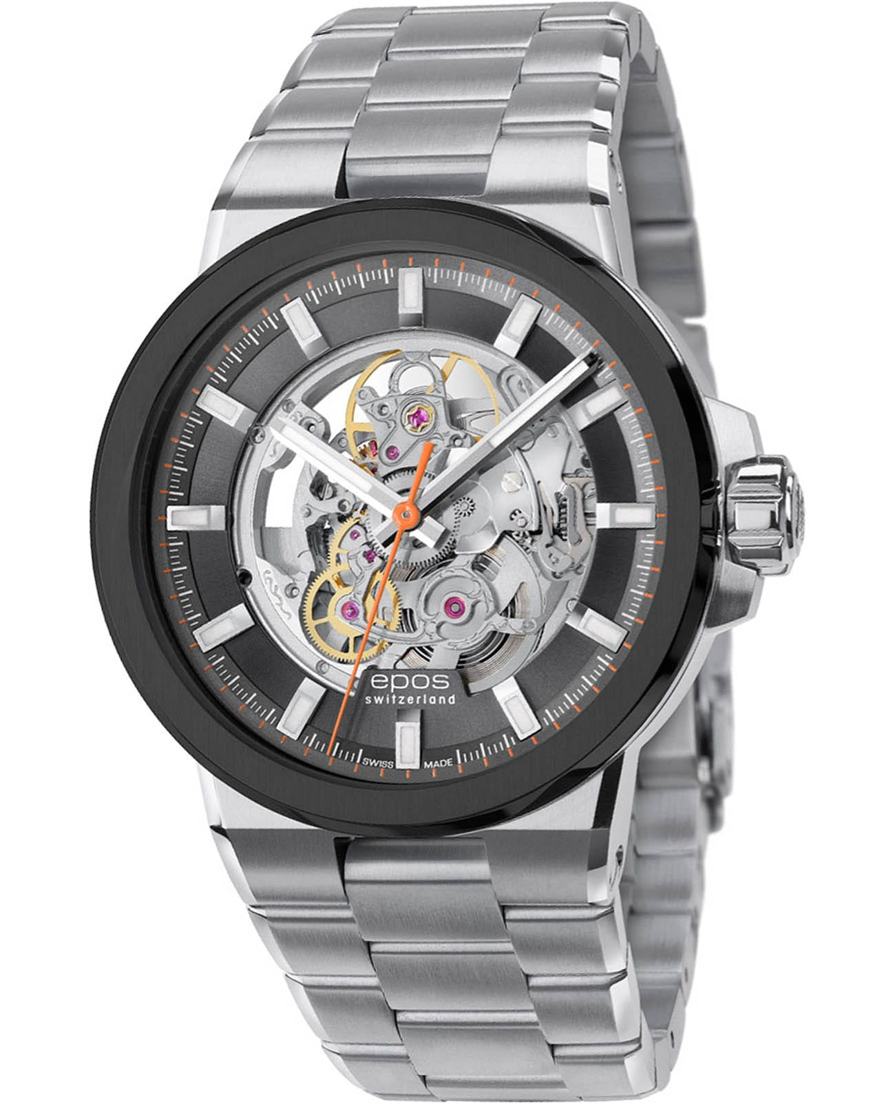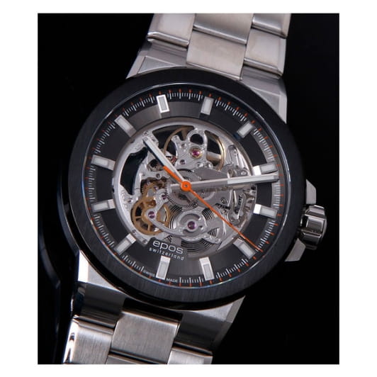 Мужские механические часы с автоподзаводом Epos из коллекции Sportive — это стильный спортивный аксессуар с элементами скелетонизации и швейцарским качеством. Корпус диаметром 42 мм и толщиной 10,4 мм выполнен из нержавеющей стали 316L. Циферблат графитового цвета частично скелетонизирован, что позволяет наблюдать за работой механизма. Циферблат защищён сапфировым стекломСапфировое стеклоПрочный и надёжный материал из кристалла сапфира синтетического происхождения, характеризующийся особой твёрдостью и устойчивостью к царапинам и повреждениям.. Индексы и стрелки серебристого цвета с люминесцентным покрытиемЛюминесцентное покрытиеПозволяет считывать показания времени в темноте. Производители наносят на стрелки, часовые индексы, безель или поверхность циферблата светонакопительный состав, дающий холодное свечение., обеспечивающим хорошую читаемость в темноте. Механизм — швейцарский калибр Sellita SW200, декорированный узором «Côtes de Genève». Прозрачная задняя крышка открывает вид на отделку механизма. Часы оснащены стальным браслетом на раскладной застёжкеРаскладная застёжкаТакой тип застёжки используется только на браслетах из металла. Она никогда не раскрывается полностью, происходит разделение на 2 и более частей. Раскладывающая застёжка снизит вероятность потери часов к минимуму.. Водонепроницаемость 100 м позволяет использовать часы для плавания и других водных видов спорта. Гарантия — 24 месяца. Универсальный выбор для тех, кто ценит техническое совершенство и современный дизайн.
