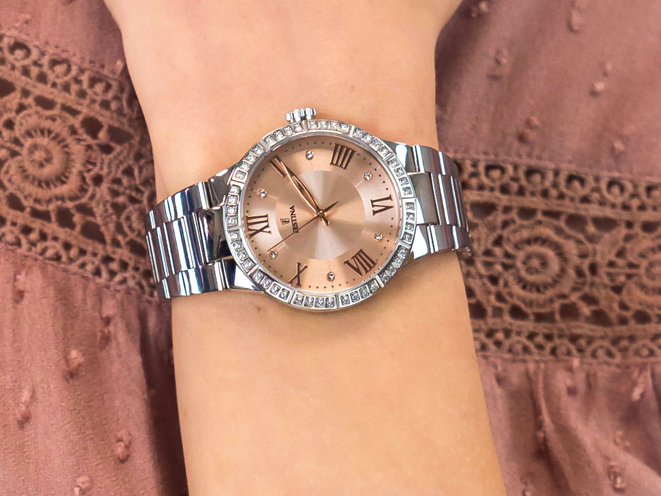 Яркий стиль и функциональность этих часов придутся по душе активной девушке. Кварцевый механизм с высокой точностью. Минеральное стеклоМинеральное стеклоМинеральное стекло представляет собой искусственно выращенный минерал кварца. Такое стекло отличается особой устойчивостью к повреждениям и царапинам. Уступает по некоторым качествам сапфировому стеклу. устойчивое к появлению царапин, обладающее высокой прозрачностью. Класс водозащиты: 50 метров, позволит защитить корпус от случайных брызг или капель дождя. Корпус часов изготовлен из нержавеющей стали 316L. БезельБезельВнешний ободок, закрепляющий стекло. В спортивных часах так называется поворотное кольцо с делениями на циферблате, выполняет роль таймера – замеряет отрезки времени на шкале. Неподвижный безель – элемент декора. Однонаправленно вращающийся безель на дайверских часах позволяет фиксировать моменты погружения и выныривания на поверхность. украшен фианитами. Браслет с раскладной застёжкойРаскладная застёжкаТакой тип застёжки используется только на браслетах из металла. Она никогда не раскрывается полностью, происходит разделение на 2 и более частей. Раскладывающая застёжка снизит вероятность потери часов к минимуму..