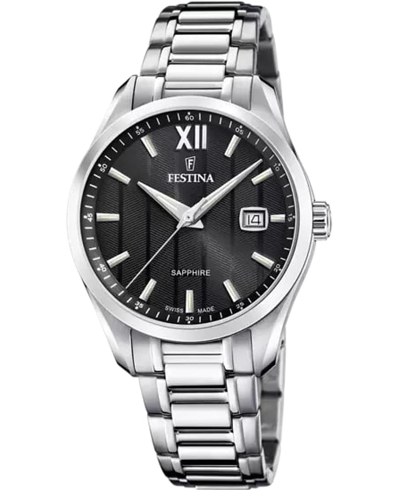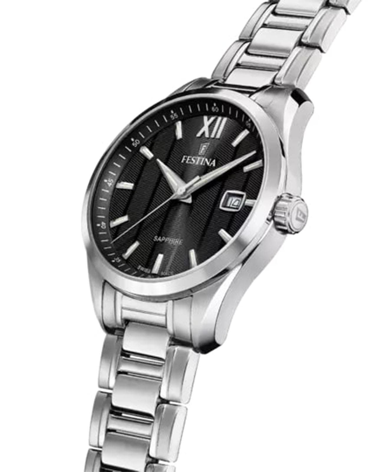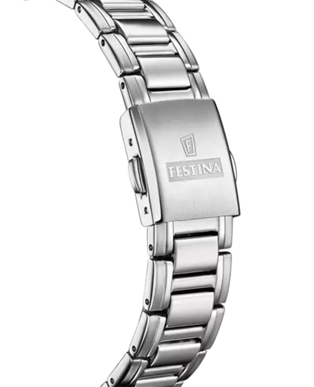 Практичные и стильные часы Festina F20026/4 с круглым корпусом на стальном браслете идеальны для современного ритма жизни. Кварцевый механизм с высокой точностью. Сапфировое стеклоСапфировое стеклоПрочный и надёжный материал из кристалла сапфира синтетического происхождения, характеризующийся особой твёрдостью и устойчивостью к царапинам и повреждениям. устойчивое к появлению царапин, обладающее высокой прозрачностью. Класс водозащиты: 50 метров, позволит защитить корпус от случайных брызг или капель дождя. Корпус часов изготовлен из нержавеющей стали. Браслет с раскладной застёжкойРаскладная застёжкаТакой тип застёжки используется только на браслетах из металла. Она никогда не раскрывается полностью, происходит разделение на 2 и более частей. Раскладывающая застёжка снизит вероятность потери часов к минимуму.. Стрелки с люминесцентным покрытиемЛюминесцентное покрытиеПозволяет считывать показания времени в темноте. Производители наносят на стрелки, часовые индексы, безель или поверхность циферблата светонакопительный состав, дающий холодное свечение.. Окошко даты находится в положении 3 часа.