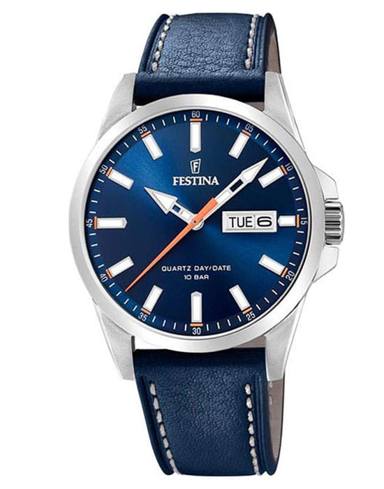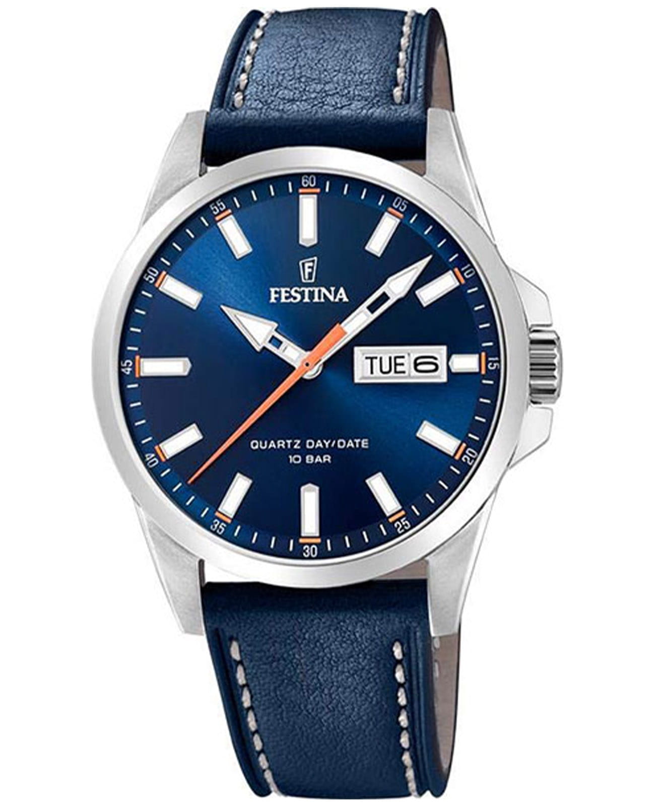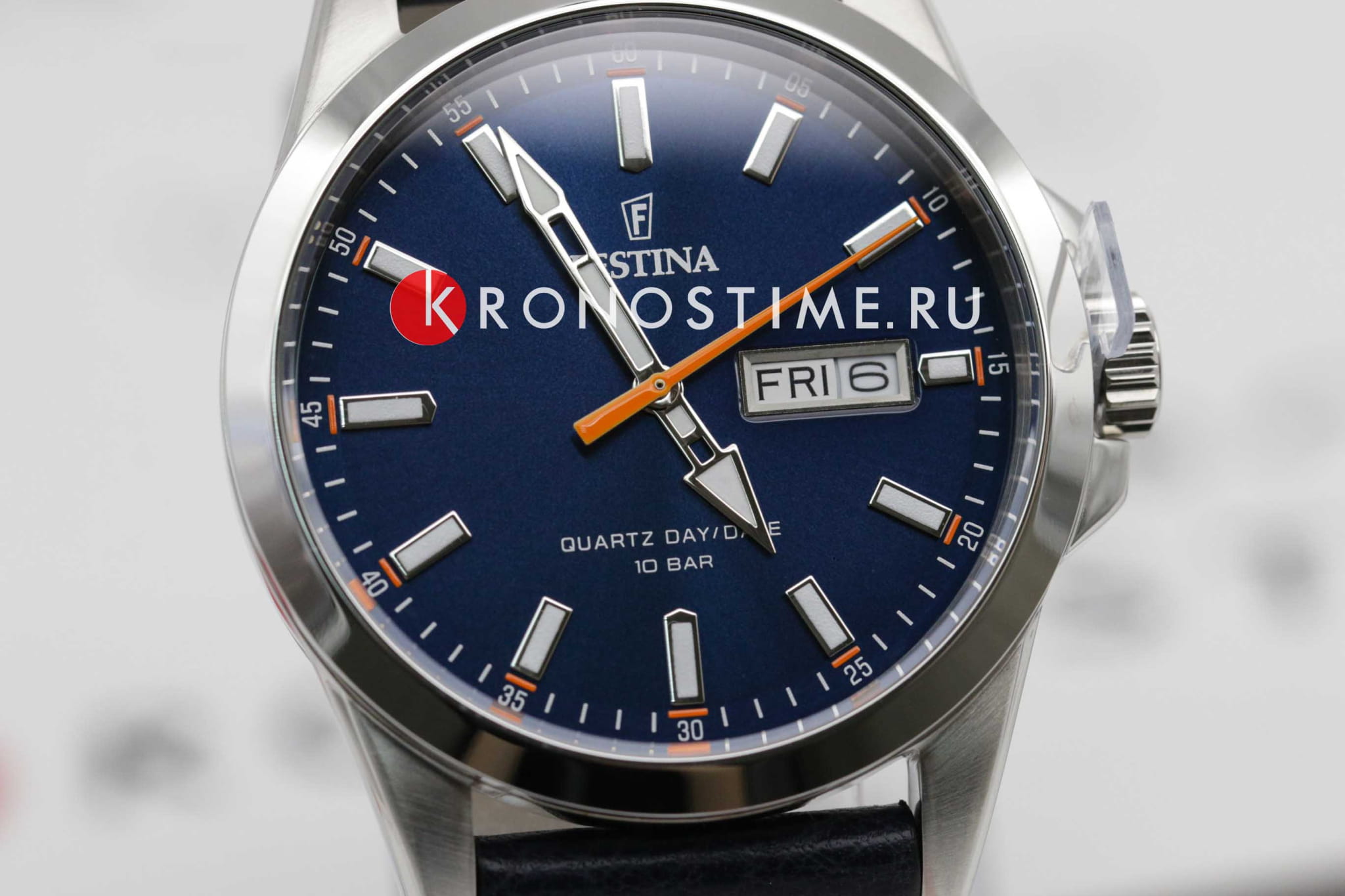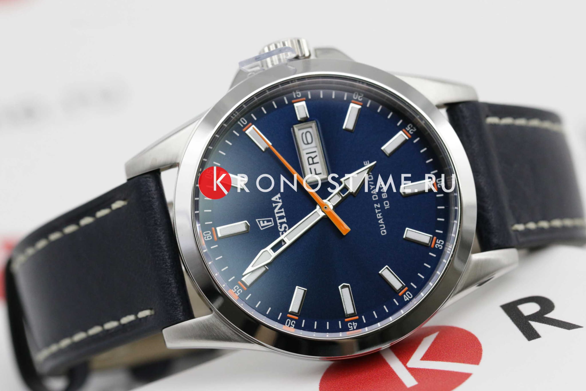 Наручные мужские часы с минеральным стекломМинеральное стеклоМинеральное стекло представляет собой искусственно выращенный минерал кварца. Такое стекло отличается особой устойчивостью к повреждениям и царапинам. Уступает по некоторым качествам сапфировому стеклу. Festina Acero Clasico F20358/3, кварцевый механизм с высокой точностью. Класс водозащиты: 50 метров, позволит защитить корпус от случайных брызг или капель дождя. Корпус часов изготовлен из стали. Люминесцентное покрытиеЛюминесцентное покрытиеПозволяет считывать показания времени в темноте. Производители наносят на стрелки, часовые индексы, безель или поверхность циферблата светонакопительный состав, дающий холодное свечение. стрелок и меток. Кожаный ремешок на стандартной застёжке.