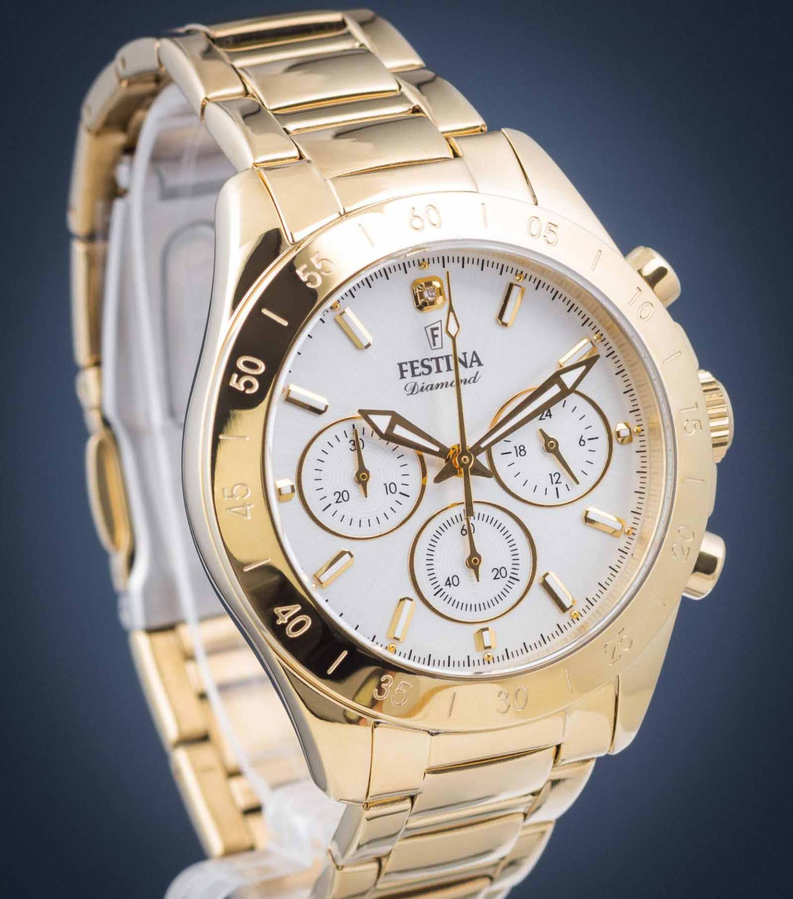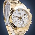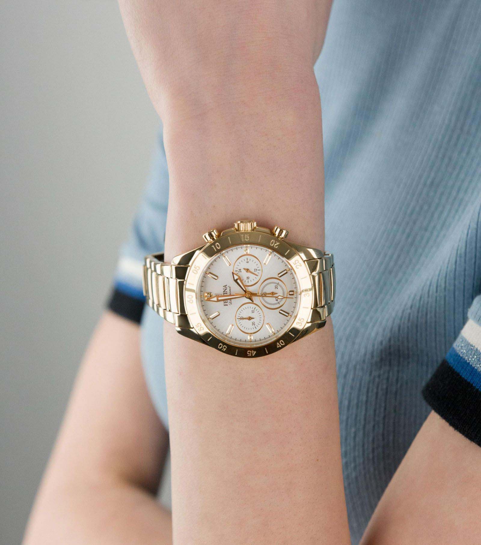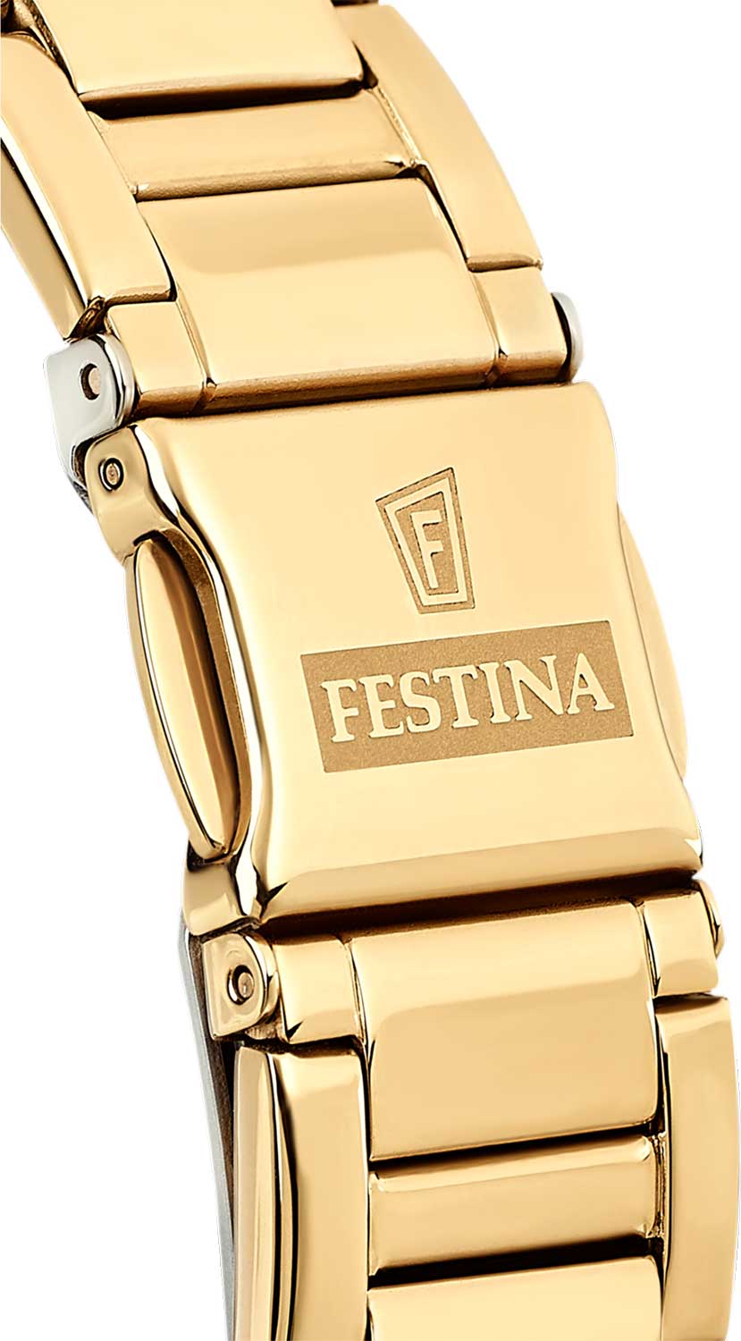 Женские кварцевые часы-хронографХронографФункция позволяет измерять отрезки времени с особой точностью: часы, минуты, секунды. Верным признаком хронографа является наличие на циферблате 3 дополнительных окошек-счётчиков. с секундомеромСекундомерСекундоме́р — прибор, способный измерять интервалы времени с точностью до долей секунды. Festina Boyfriend F20400/1, кварцевый механизм с высокой точностью. Минеральное стеклоМинеральное стеклоМинеральное стекло представляет собой искусственно выращенный минерал кварца. Такое стекло отличается особой устойчивостью к повреждениям и царапинам. Уступает по некоторым качествам сапфировому стеклу. устойчивое к мелким механическим повреждениям. Класс водозащиты: 100 метров, позволит плавать, нырять и заниматься другими водными видами спорта. Корпус часов изготовлен из стали с PVD-покрытиемPVDУльтратонкое покрытие наносится в технике вакуумного напыления, сочетает в себе нитрид титана особой прочности со слоем золота или оксида хрома. Несёт в себе декоративную или защитную функцию.. Стальной браслет на раскладной застёжкеРаскладная застёжкаТакой тип застёжки используется только на браслетах из металла. Она никогда не раскрывается полностью, происходит разделение на 2 и более частей. Раскладывающая застёжка снизит вероятность потери часов к минимуму. с PVD-покрытиемPVDУльтратонкое покрытие наносится в технике вакуумного напыления, сочетает в себе нитрид титана особой прочности со слоем золота или оксида хрома. Несёт в себе декоративную или защитную функцию.. БезельБезельВнешний ободок, закрепляющий стекло. В спортивных часах так называется поворотное кольцо с делениями на циферблате, выполняет роль таймера – замеряет отрезки времени на шкале. Неподвижный безель – элемент декора. Однонаправленно вращающийся безель на дайверских часах позволяет фиксировать моменты погружения и выныривания на поверхность. с PVD-покрытиемPVDУльтратонкое покрытие наносится в технике вакуумного напыления, сочетает в себе нитрид титана особой прочности со слоем золота или оксида хрома. Несёт в себе декоративную или защитную функцию.. Рифленая заводная головка с защитой. Стрелки и метки с люминесцентным покрытиемЛюминесцентное покрытиеПозволяет считывать показания времени в темноте. Производители наносят на стрелки, часовые индексы, безель или поверхность циферблата светонакопительный состав, дающий холодное свечение..