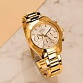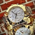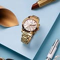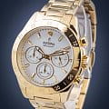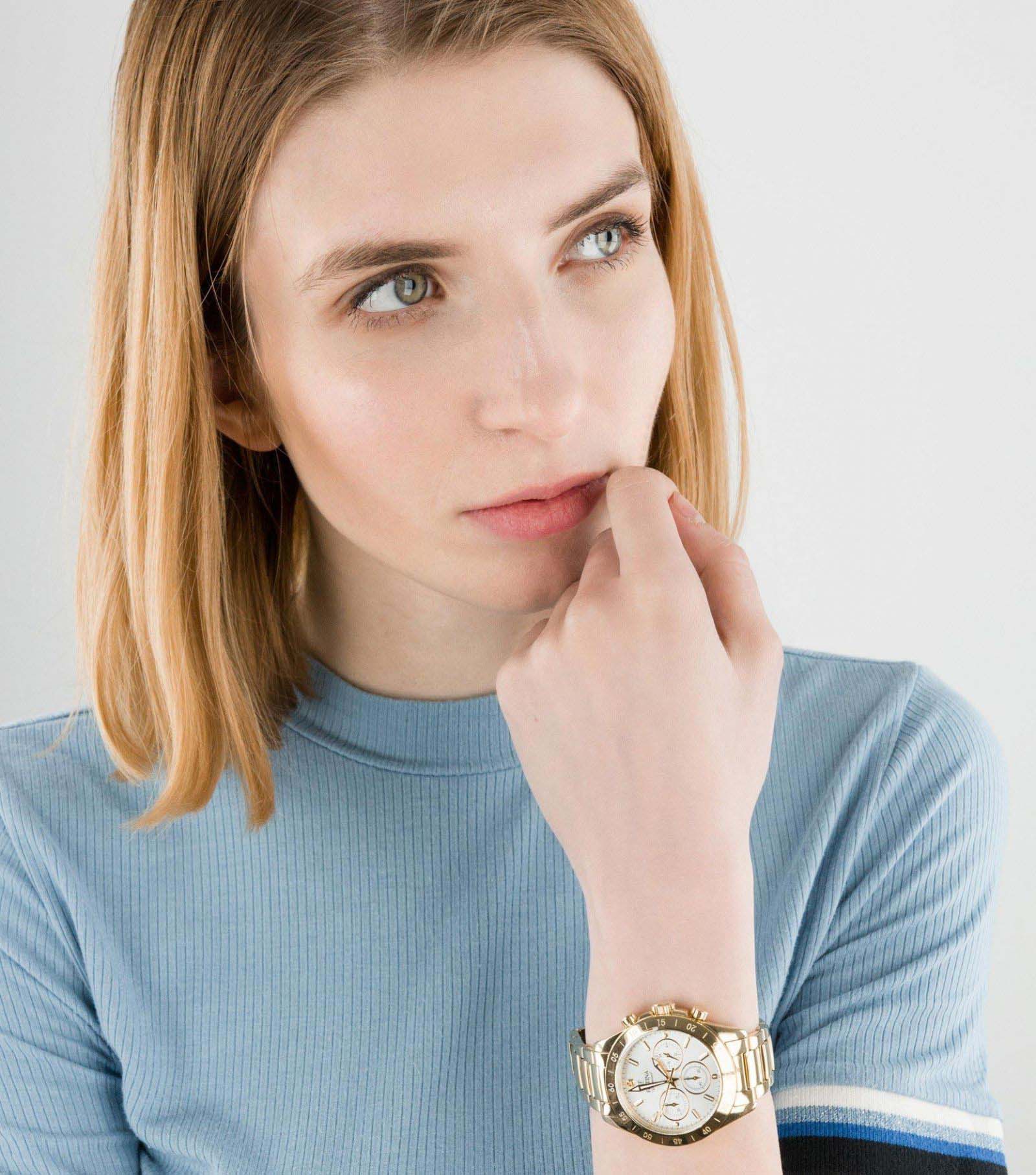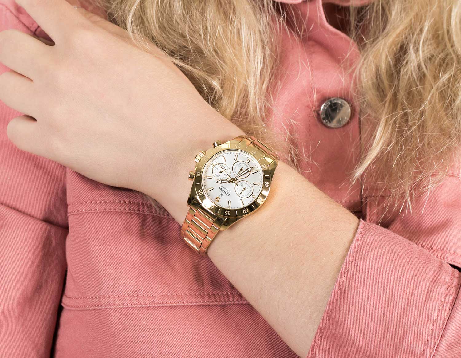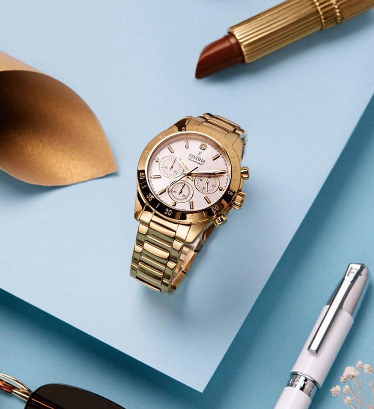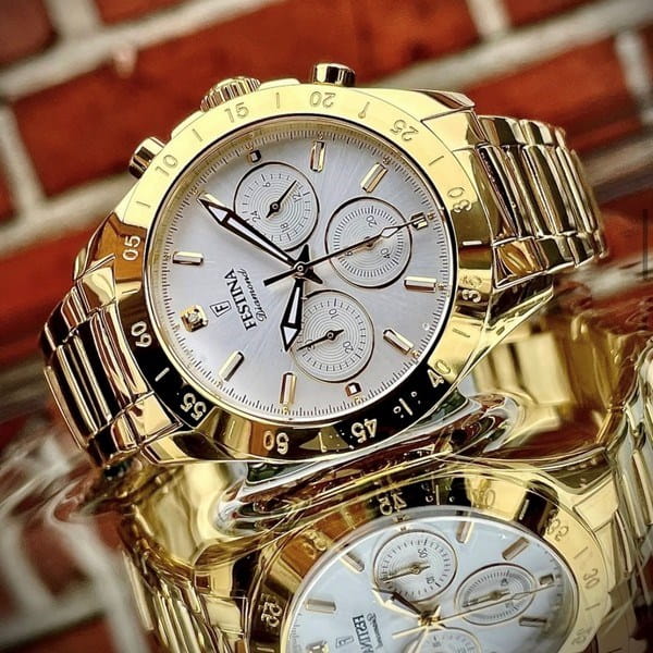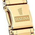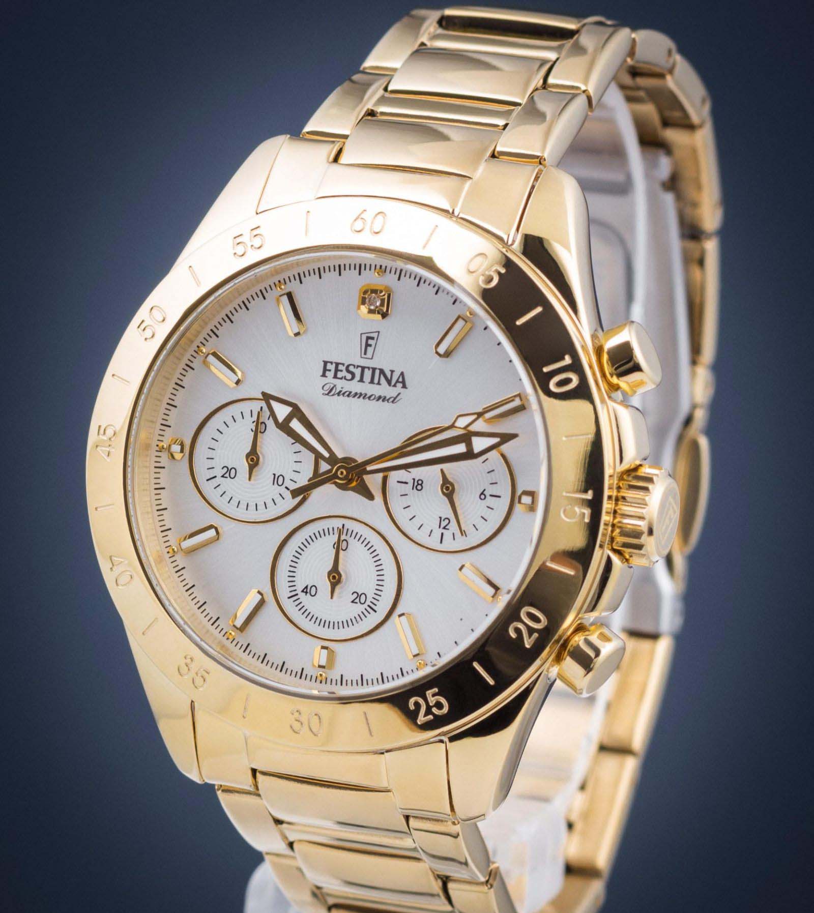 Женские кварцевые часы-хронографХронографФункция позволяет измерять отрезки времени с особой точностью: часы, минуты, секунды. Верным признаком хронографа является наличие на циферблате 3 дополнительных окошек-счётчиков. с секундомеромСекундомерСекундоме́р — прибор, способный измерять интервалы времени с точностью до долей секунды. Festina Boyfriend F20400/1, кварцевый механизм с высокой точностью. Минеральное стеклоМинеральное стеклоМинеральное стекло представляет собой искусственно выращенный минерал кварца. Такое стекло отличается особой устойчивостью к повреждениям и царапинам. Уступает по некоторым качествам сапфировому стеклу. устойчивое к мелким механическим повреждениям. Класс водозащиты: 100 метров, позволит плавать, нырять и заниматься другими водными видами спорта. Корпус часов изготовлен из стали с PVD-покрытиемPVDУльтратонкое покрытие наносится в технике вакуумного напыления, сочетает в себе нитрид титана особой прочности со слоем золота или оксида хрома. Несёт в себе декоративную или защитную функцию.. Стальной браслет на раскладной застёжкеРаскладная застёжкаТакой тип застёжки используется только на браслетах из металла. Она никогда не раскрывается полностью, происходит разделение на 2 и более частей. Раскладывающая застёжка снизит вероятность потери часов к минимуму. с PVD-покрытиемPVDУльтратонкое покрытие наносится в технике вакуумного напыления, сочетает в себе нитрид титана особой прочности со слоем золота или оксида хрома. Несёт в себе декоративную или защитную функцию.. БезельБезельВнешний ободок, закрепляющий стекло. В спортивных часах так называется поворотное кольцо с делениями на циферблате, выполняет роль таймера – замеряет отрезки времени на шкале. Неподвижный безель – элемент декора. Однонаправленно вращающийся безель на дайверских часах позволяет фиксировать моменты погружения и выныривания на поверхность. с PVD-покрытиемPVDУльтратонкое покрытие наносится в технике вакуумного напыления, сочетает в себе нитрид титана особой прочности со слоем золота или оксида хрома. Несёт в себе декоративную или защитную функцию.. Рифленая заводная головка с защитой. Стрелки и метки с люминесцентным покрытиемЛюминесцентное покрытиеПозволяет считывать показания времени в темноте. Производители наносят на стрелки, часовые индексы, безель или поверхность циферблата светонакопительный состав, дающий холодное свечение..