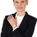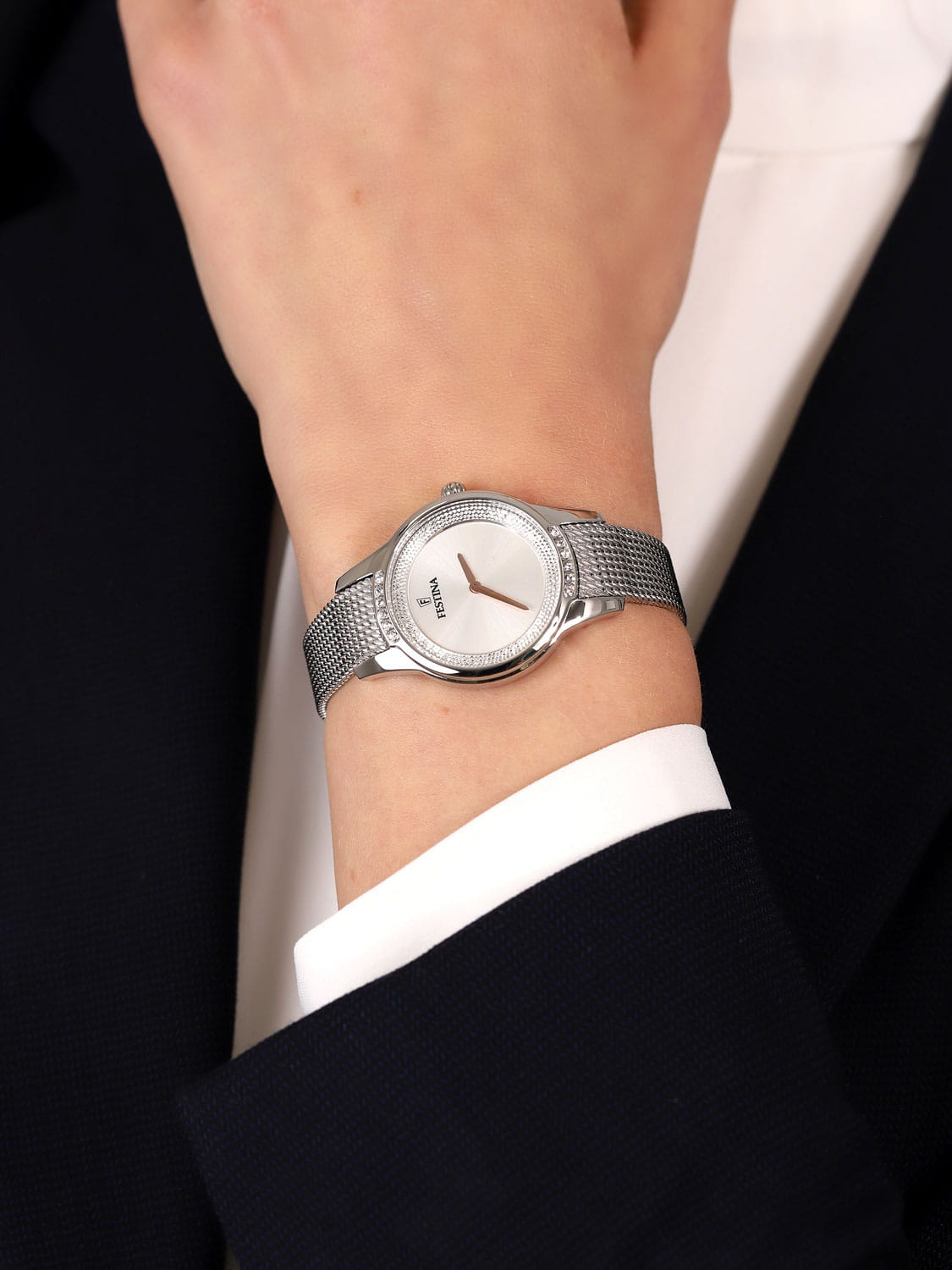 Яркий стиль и функциональность этих часов придутся по душе активной девушке. Кварцевый механизм с высокой точностью. Минеральное стеклоМинеральное стеклоМинеральное стекло представляет собой искусственно выращенный минерал кварца. Такое стекло отличается особой устойчивостью к повреждениям и царапинам. Уступает по некоторым качествам сапфировому стеклу. устойчивое к появлению царапин, обладающее высокой прозрачностью. Класс водозащиты: 50 метров, позволит защитить корпус от случайных брызг или капель дождя. Корпус часов изготовлен из нержавеющей стали 316L. БезельБезельВнешний ободок, закрепляющий стекло. В спортивных часах так называется поворотное кольцо с делениями на циферблате, выполняет роль таймера – замеряет отрезки времени на шкале. Неподвижный безель – элемент декора. Однонаправленно вращающийся безель на дайверских часах позволяет фиксировать моменты погружения и выныривания на поверхность. украшен цирконами. Браслет с раскладной застёжкойРаскладная застёжкаТакой тип застёжки используется только на браслетах из металла. Она никогда не раскрывается полностью, происходит разделение на 2 и более частей. Раскладывающая застёжка снизит вероятность потери часов к минимуму..