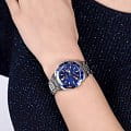 Кварцевый механизм с высокой точностью. Минеральное стеклоМинеральное стеклоМинеральное стекло представляет собой искусственно выращенный минерал кварца. Такое стекло отличается особой устойчивостью к повреждениям и царапинам. Уступает по некоторым качествам сапфировому стеклу. устойчивое к появлению царапин, обладающее высокой прозрачностью. Стрелки и метки с люминесцентным покрытиемЛюминесцентное покрытиеПозволяет считывать показания времени в темноте. Производители наносят на стрелки, часовые индексы, безель или поверхность циферблата светонакопительный состав, дающий холодное свечение.. Окошко даты с увеличительным стеклом. Класс водозащиты: 100 метров, позволит плавать, нырять и заниматься другими водными видами спорта. Поворотный безельБезельВнешний ободок, закрепляющий стекло. В спортивных часах так называется поворотное кольцо с делениями на циферблате, выполняет роль таймера – замеряет отрезки времени на шкале. Неподвижный безель – элемент декора. Однонаправленно вращающийся безель на дайверских часах позволяет фиксировать моменты погружения и выныривания на поверхность.с PVDPVDУльтратонкое покрытие наносится в технике вакуумного напыления, сочетает в себе нитрид титана особой прочности со слоем золота или оксида хрома. Несёт в себе декоративную или защитную функцию. покрытием. Корпус часов изготовлен из нержавеющей стали. Браслет с раскладной застёжкойРаскладная застёжкаТакой тип застёжки используется только на браслетах из металла. Она никогда не раскрывается полностью, происходит разделение на 2 и более частей. Раскладывающая застёжка снизит вероятность потери часов к минимуму.. Застежка с системой блокировки.