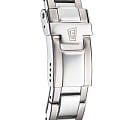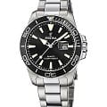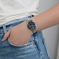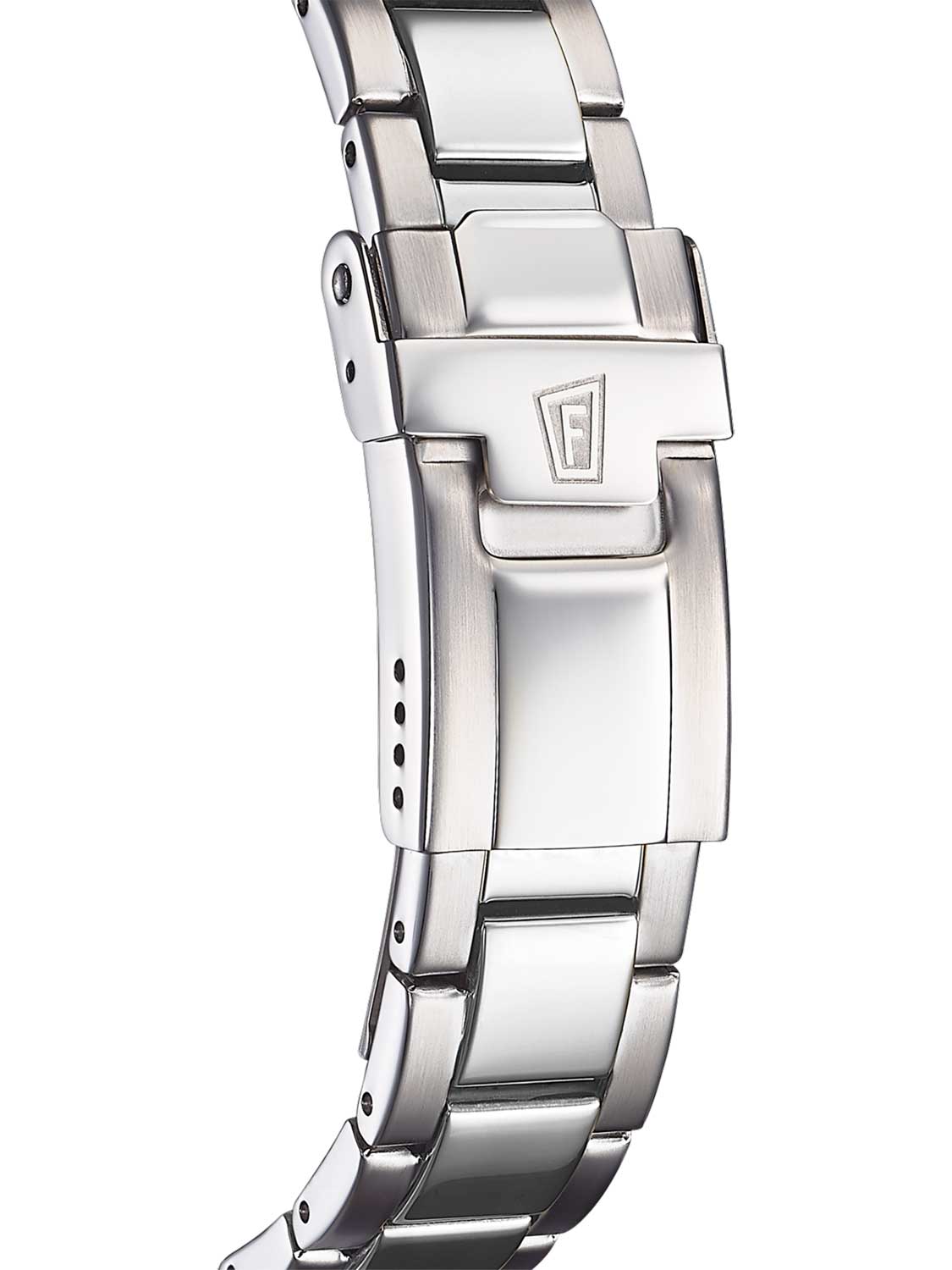 Кварцевый механизм с высокой точностью. Минеральное стеклоМинеральное стеклоМинеральное стекло представляет собой искусственно выращенный минерал кварца. Такое стекло отличается особой устойчивостью к повреждениям и царапинам. Уступает по некоторым качествам сапфировому стеклу. устойчивое к появлению царапин, обладающее высокой прозрачностью. Стрелки и метки с люминесцентным покрытиемЛюминесцентное покрытиеПозволяет считывать показания времени в темноте. Производители наносят на стрелки, часовые индексы, безель или поверхность циферблата светонакопительный состав, дающий холодное свечение.. Окошко даты с увеличительным стеклом. Класс водозащиты: 100 метров, позволит плавать, нырять и заниматься другими водными видами спорта. Поворотный безельБезельВнешний ободок, закрепляющий стекло. В спортивных часах так называется поворотное кольцо с делениями на циферблате, выполняет роль таймера – замеряет отрезки времени на шкале. Неподвижный безель – элемент декора. Однонаправленно вращающийся безель на дайверских часах позволяет фиксировать моменты погружения и выныривания на поверхность. с PVDPVDУльтратонкое покрытие наносится в технике вакуумного напыления, сочетает в себе нитрид титана особой прочности со слоем золота или оксида хрома. Несёт в себе декоративную или защитную функцию. покрытием. Циферблат выполнен по технологии Sunray (солнечные лучи). Корпус часов изготовлен из нержавеющей стали. Заводная головка с защитой. Браслет с раскладной застёжкойРаскладная застёжкаТакой тип застёжки используется только на браслетах из металла. Она никогда не раскрывается полностью, происходит разделение на 2 и более частей. Раскладывающая застёжка снизит вероятность потери часов к минимуму. и шириной 16,8мм. Застежка с системой блокировки.